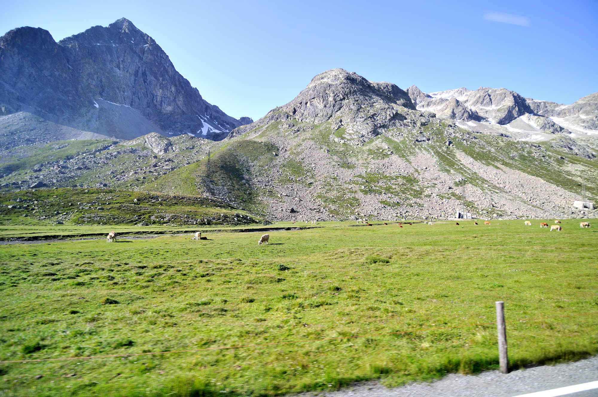 | ユリア峠 [Julierpass] 手前のアルプ [Alp] (08:47)「南南西」MAP アルプ [Alp] はアルプス [Alps] の森林限界を越えた上に広がる草地を意味し、家畜の夏の放牧地になる (移牧) 。 東部では、"アルム" と言う。 "アルプス"の名は、このアルプ [Alp] が沢山あることから、そう呼ばれている。 |