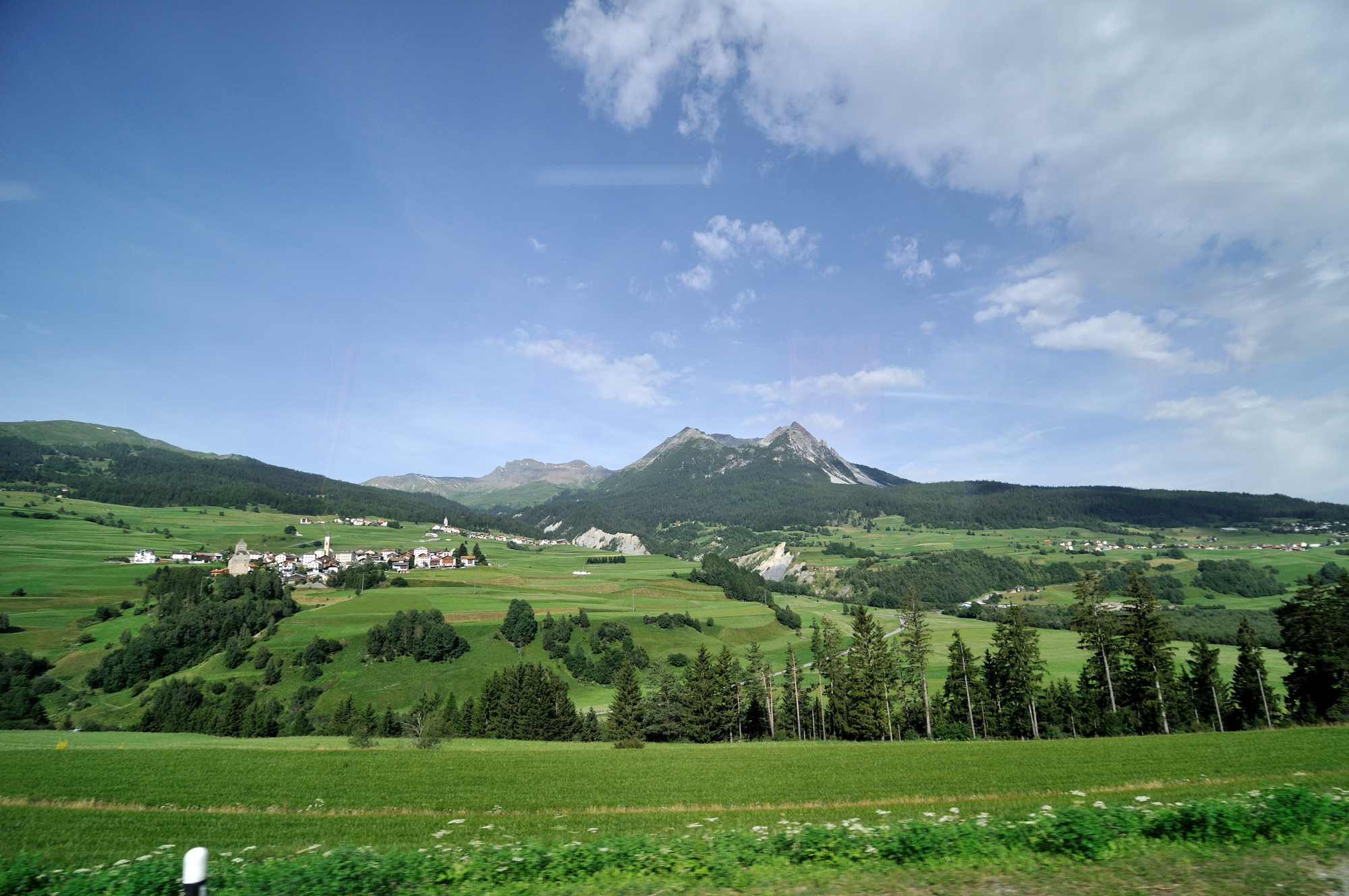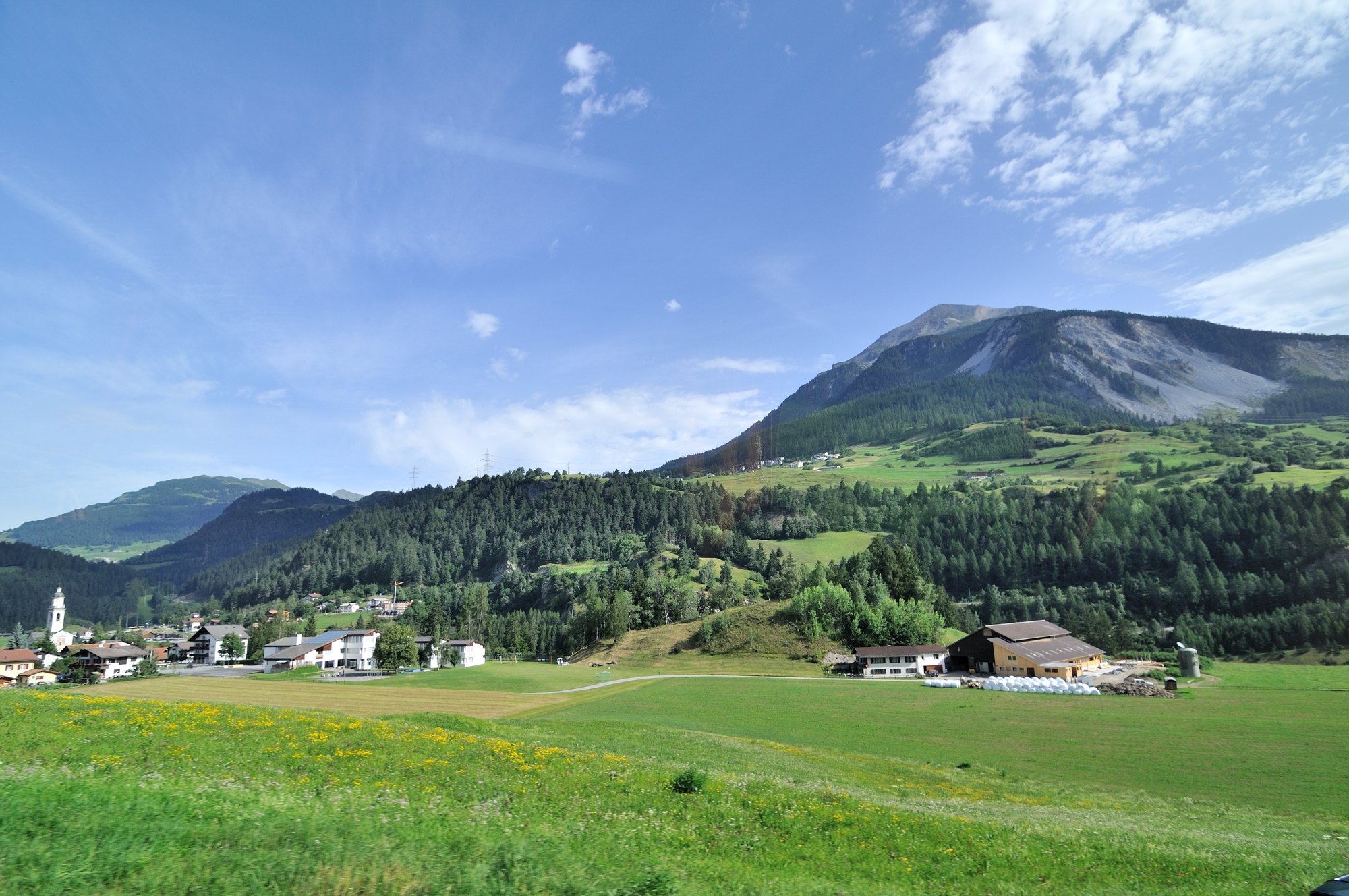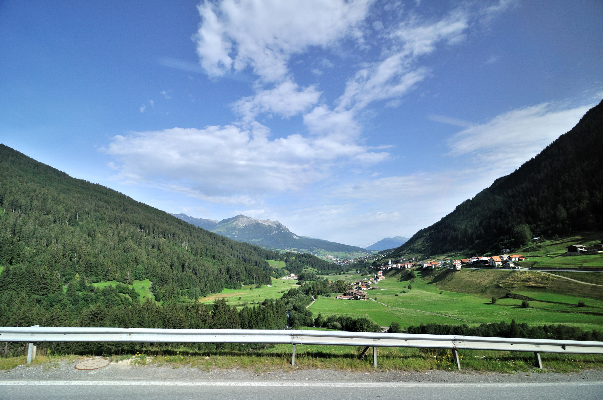 | ユリア街道 [Julierstrasse] のティンツェン [Tinzen] 付近 (09:23)「北西」MAP 遠方「左中央」のピークは、Piz Curver。 その右のピークは、ピーツ・トイッサ [Piz Toissa] 。 |