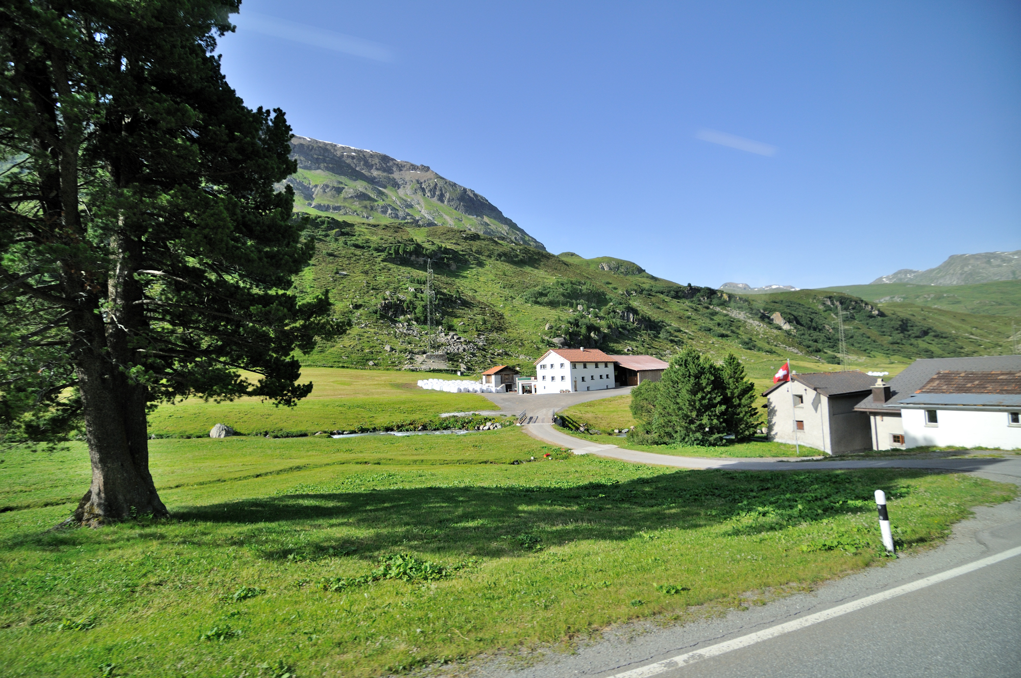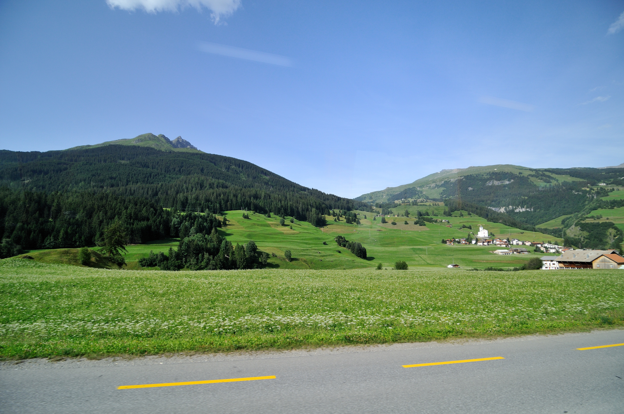 | ユリア街道 [Julierstrasse] のティーフェン・カステル [Tiefen-Castel] 付近 (09:36)「北」MAP 写真「右中央」の山は、レンツァーホルン [Lenzerhorn] 。 |