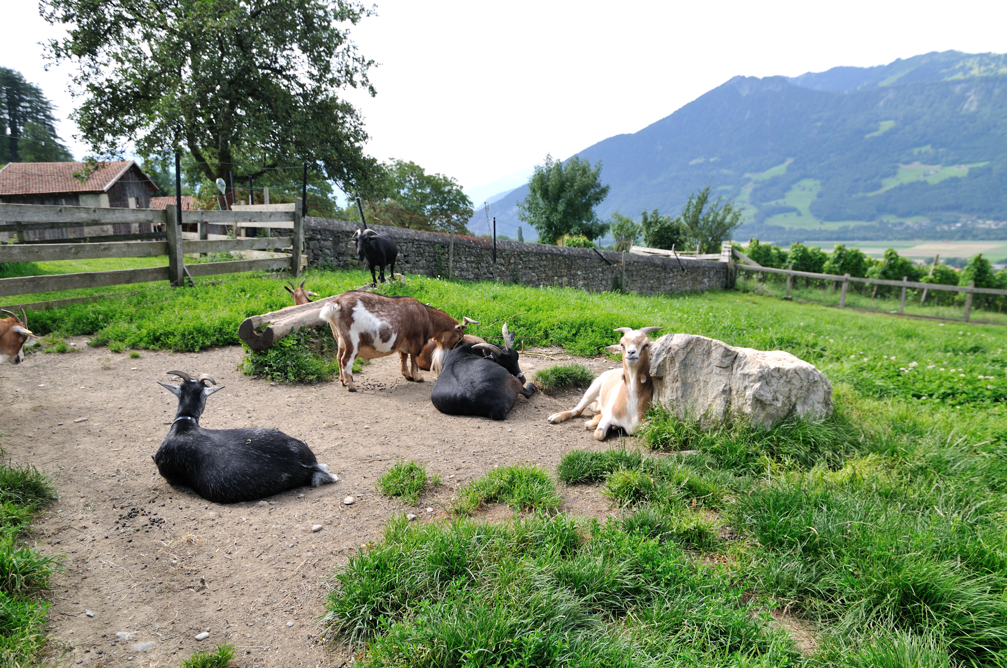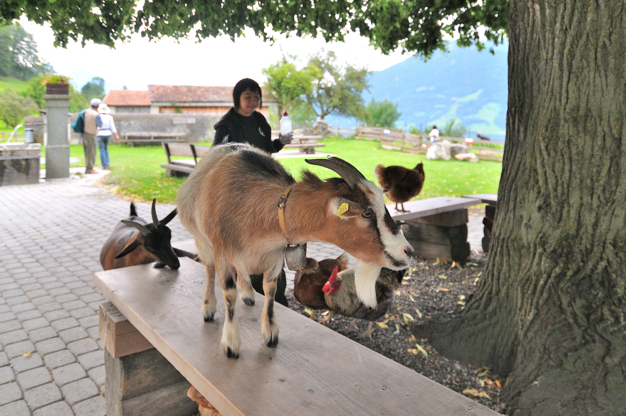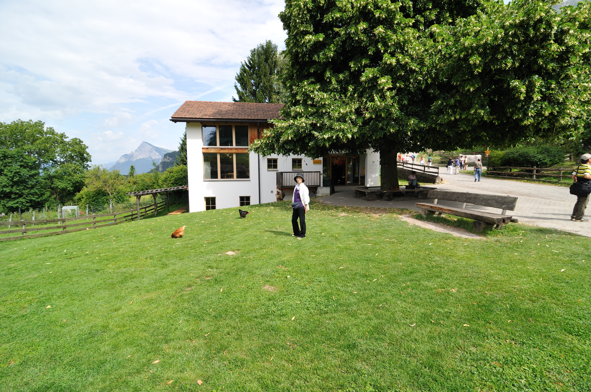 | おみやげ店前の風景「ヤギ、鶏、などが飼育されている」 (10:57)「南西」MAP 右の白壁の建物が "おみやげ店" 。 |