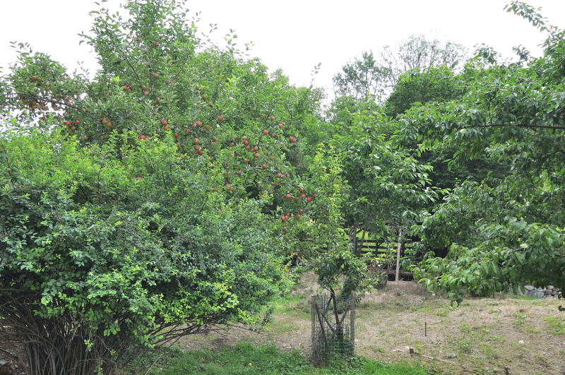 | おみやげ店と道を挟んだ、向かいの庭に植えられているリンゴの木 (11:00)「北東」MAP |