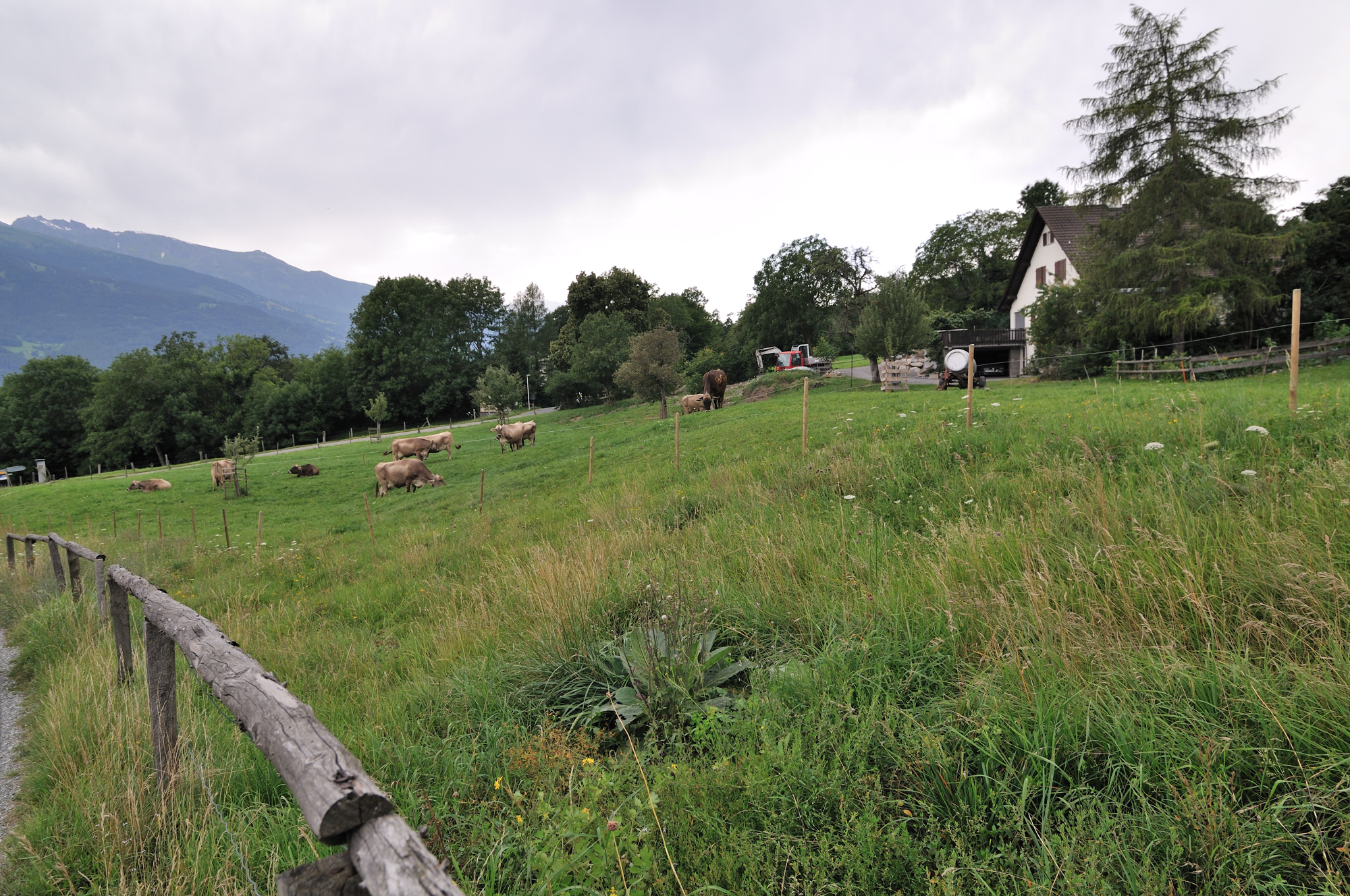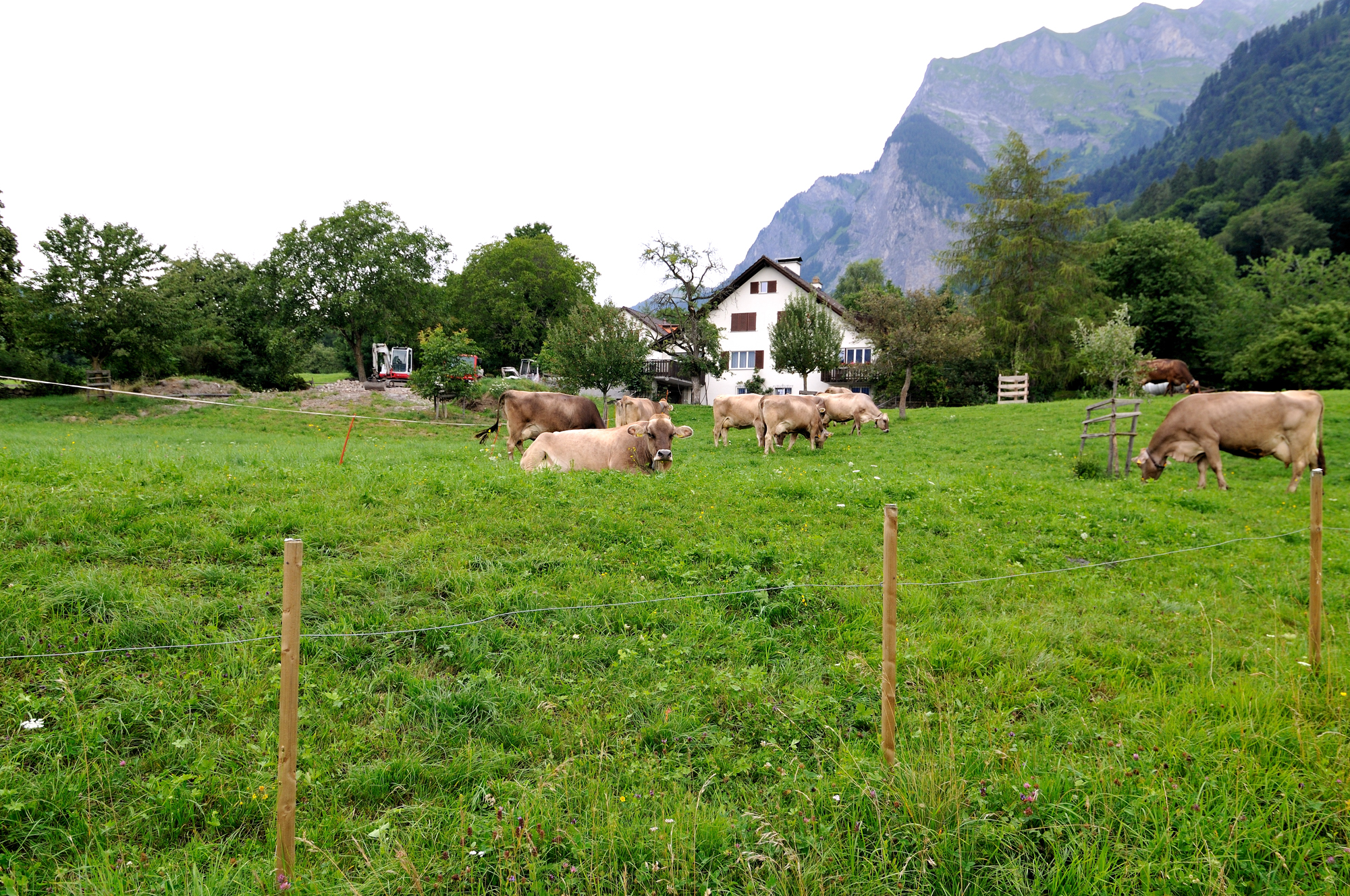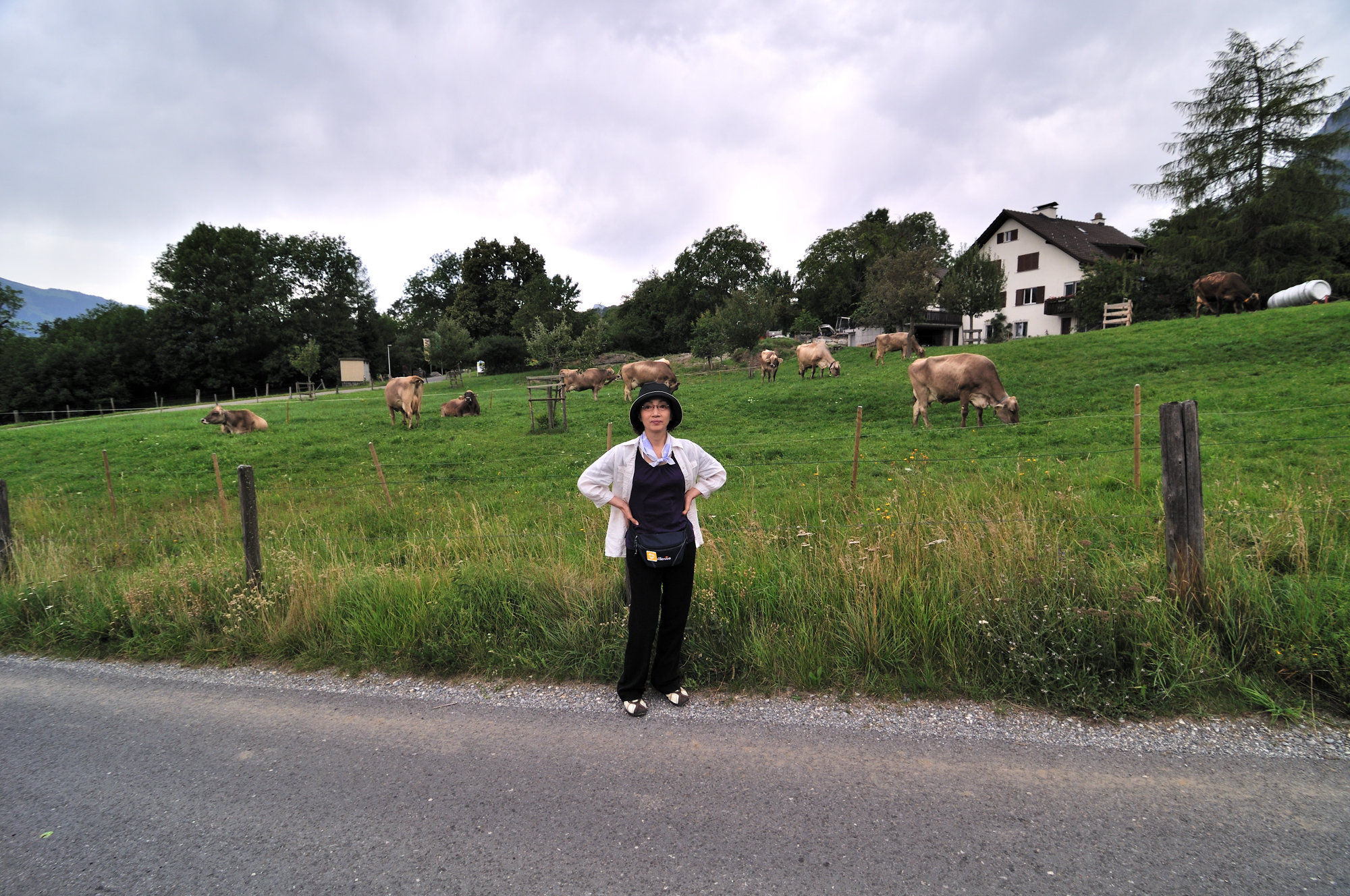 | "ハイジのいえ"の駐車場付近 (11:11)「北」MAP ボヴェル通り [Bovelweg] から撮影。 スイスブラウン種 濃厚なミルクで知られるスイスブラウン種はシンメンタール種と並んで世界的に有名な牛の品種。 |