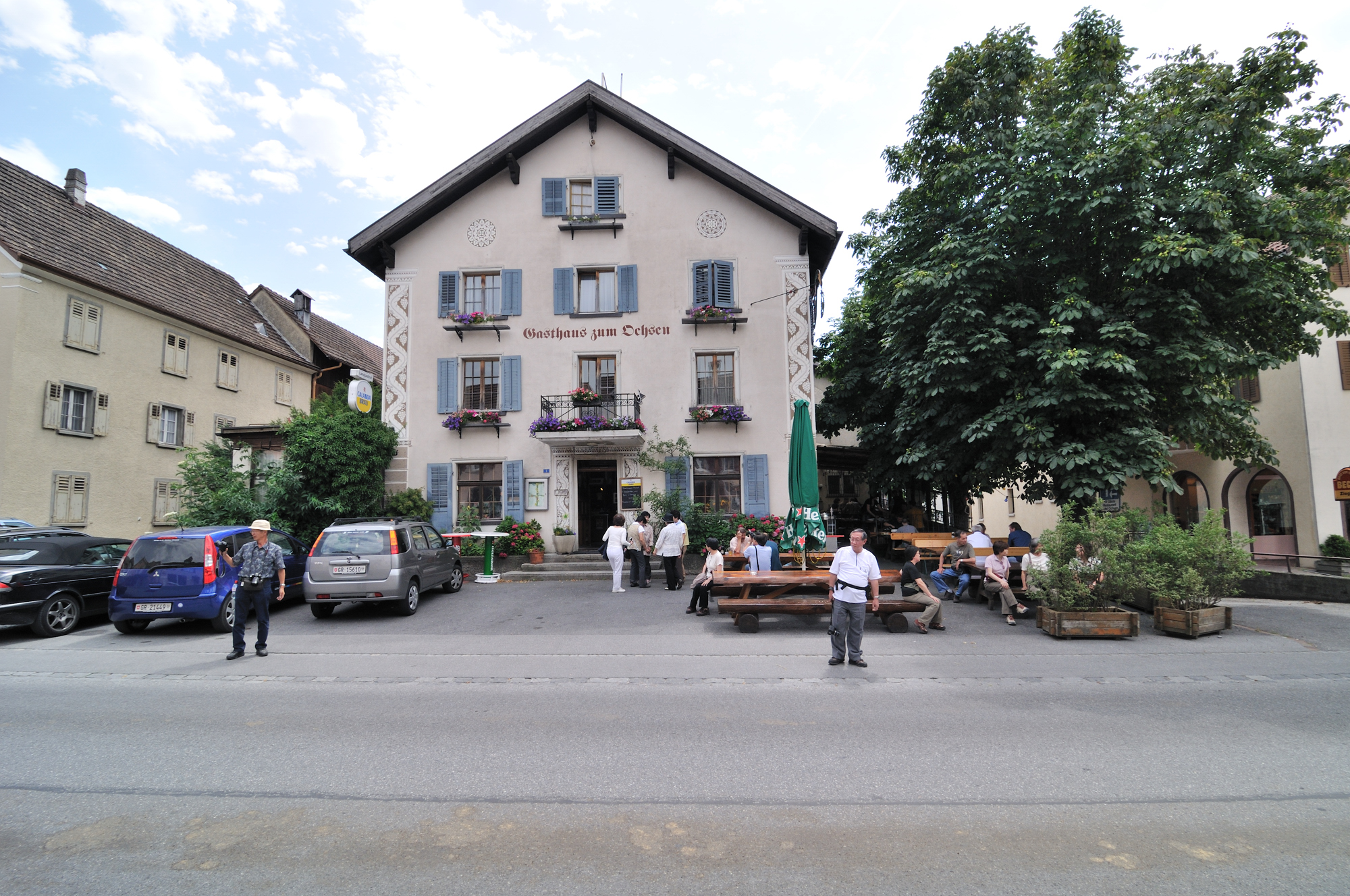 | 夕食を終えたレストラン前にて (19:06)「東」MAP この後スイス最後の宿泊地、グラッドブルグ [Glattbrugg] へ向かう。 |