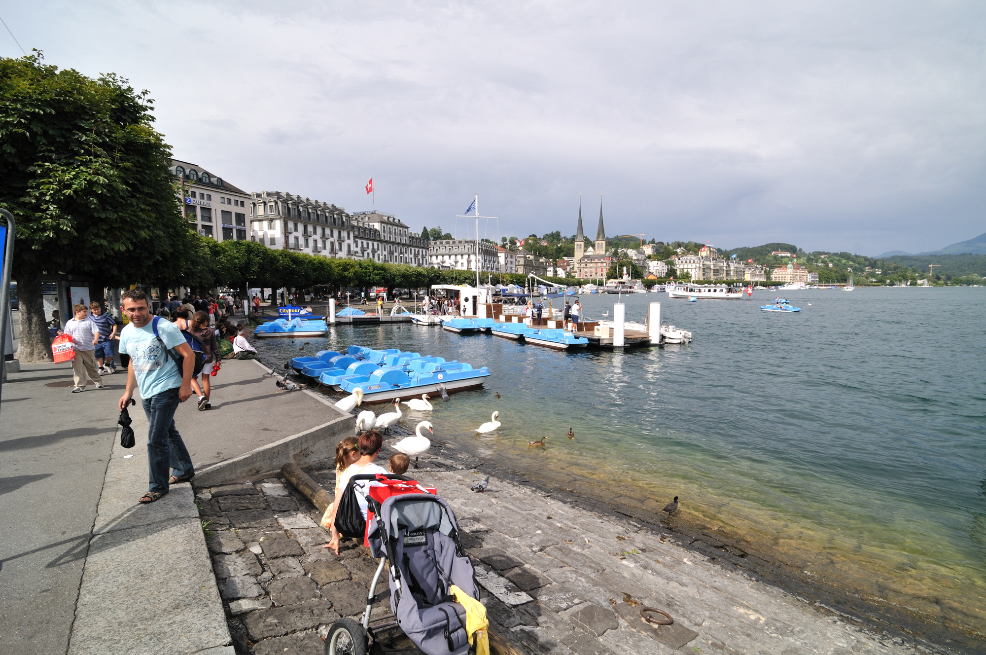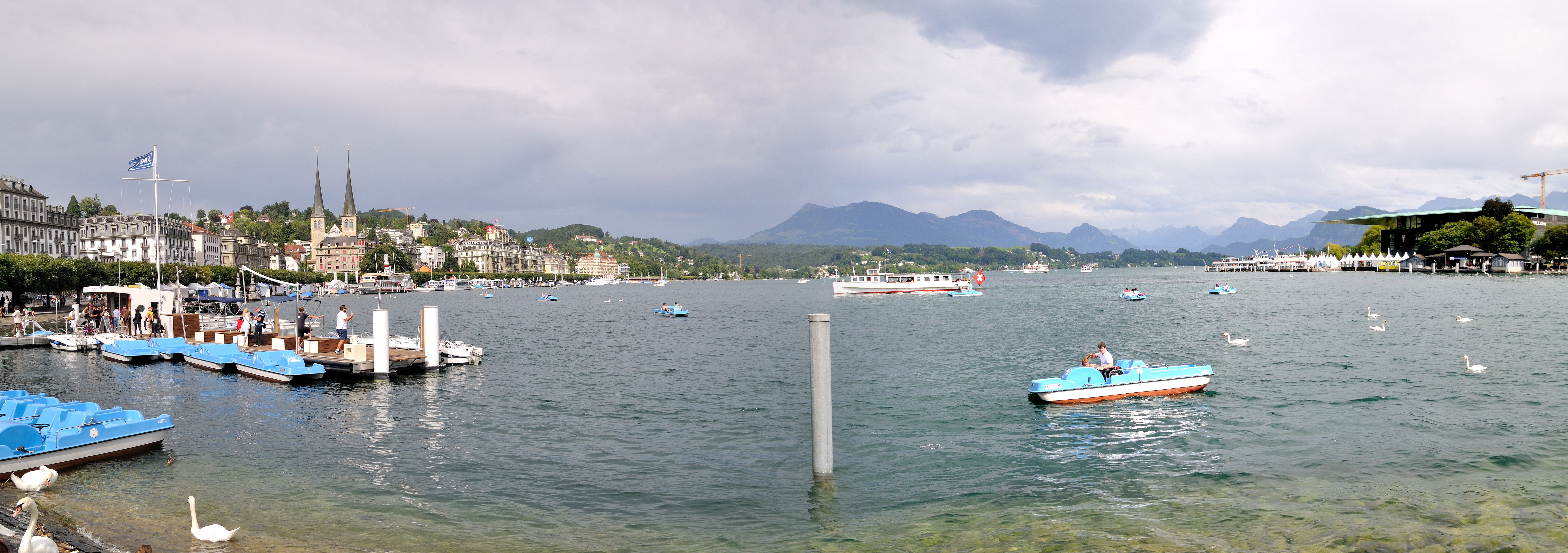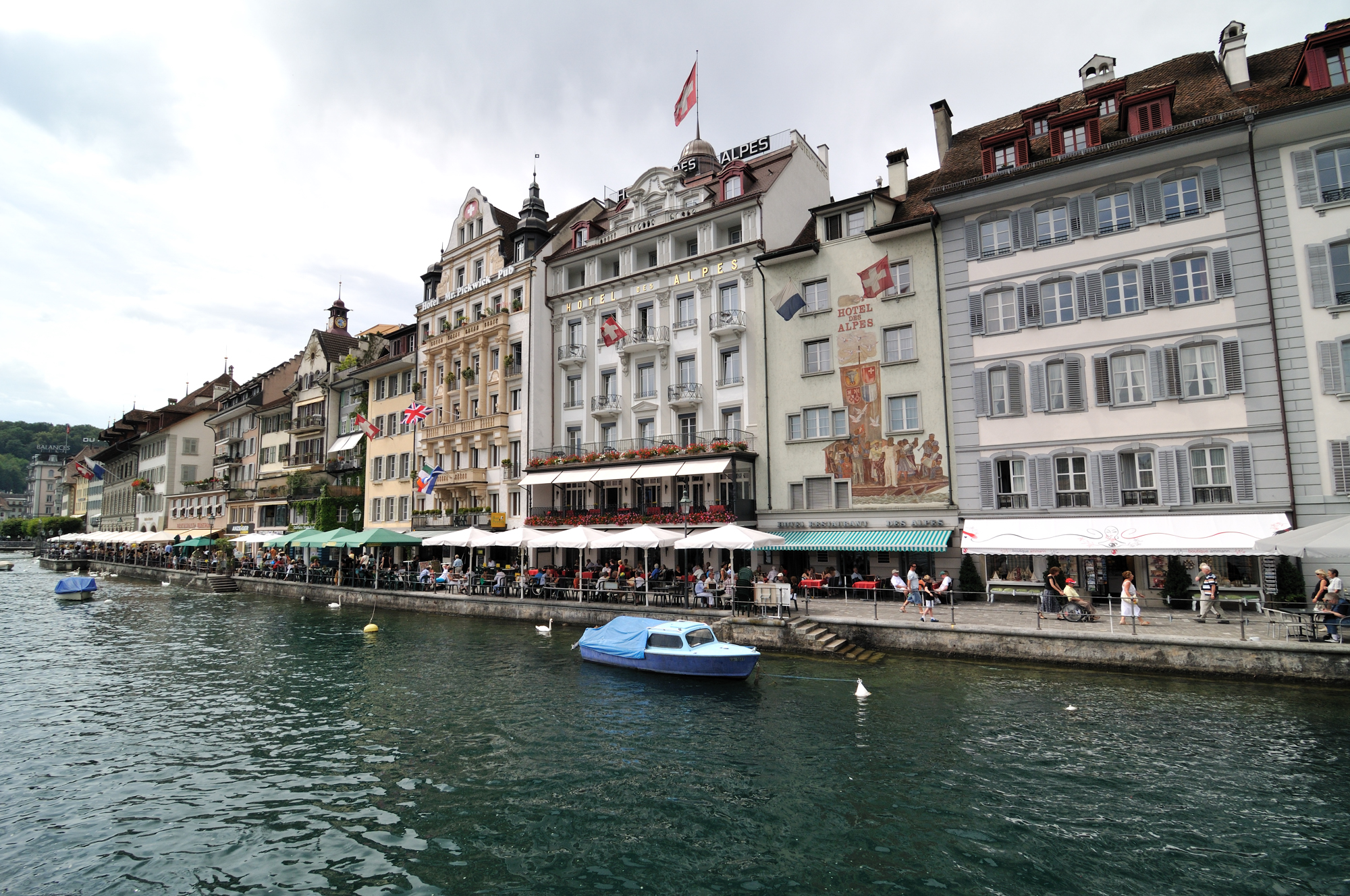 | ルツェルン中央駅前のゼーヴルック [Seebrücke] (桟橋) から西方向を望む (15:39)「西」MAP ゼーヴルック [Seebrücke] の下を流れる川は、ロイス川 [Reuss River] で、フルカロイス [Furkareuss] に源を発し、ルツェルン湖、ルツェルン市街を流れ、ヴィンディッシュ [Windisch] 近郊でアーレ川に合流する。 |