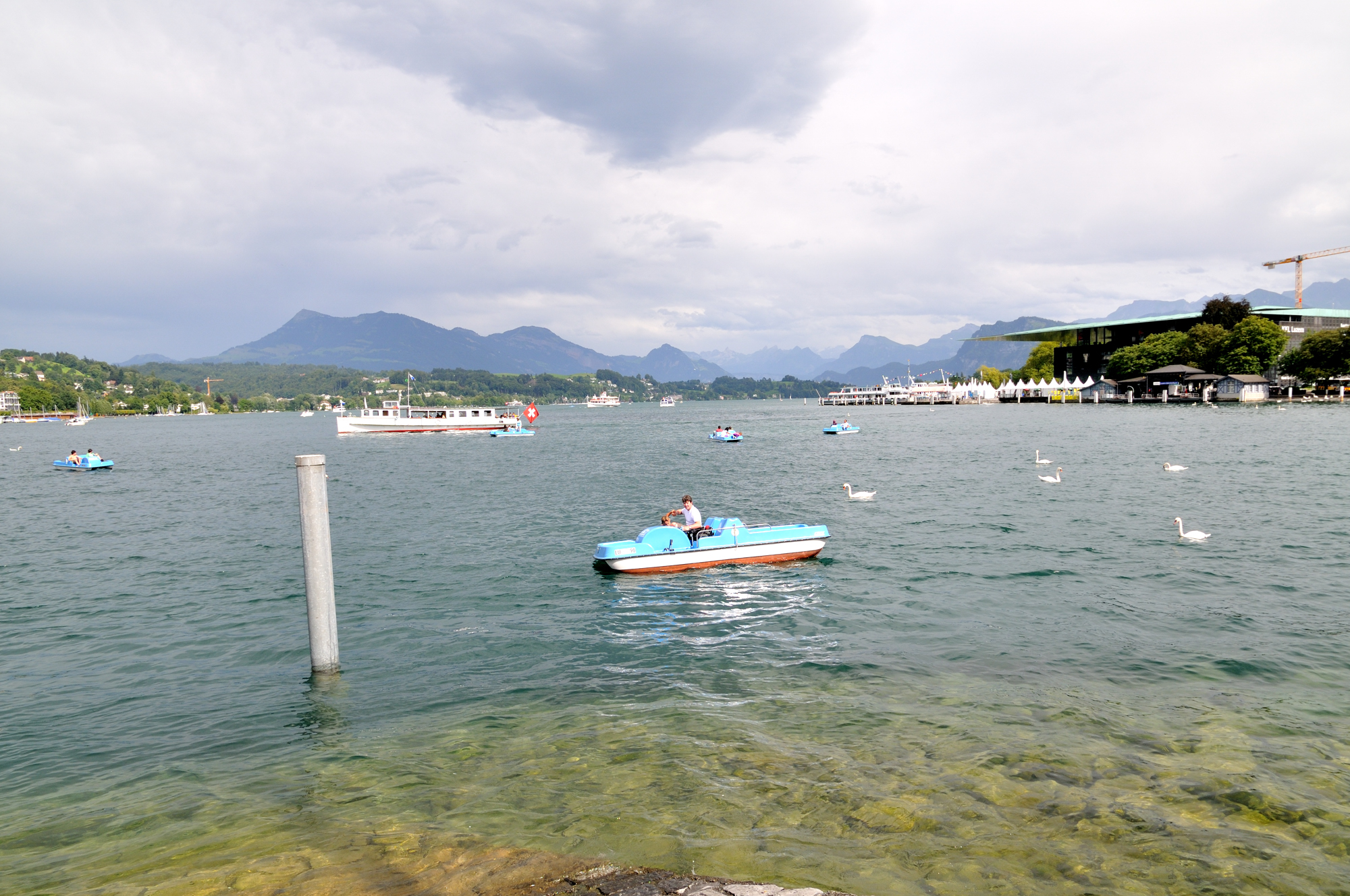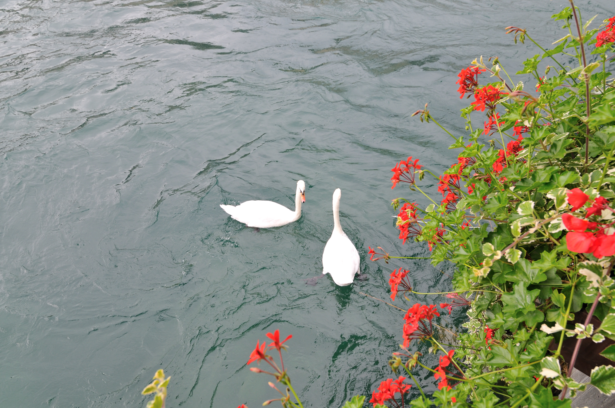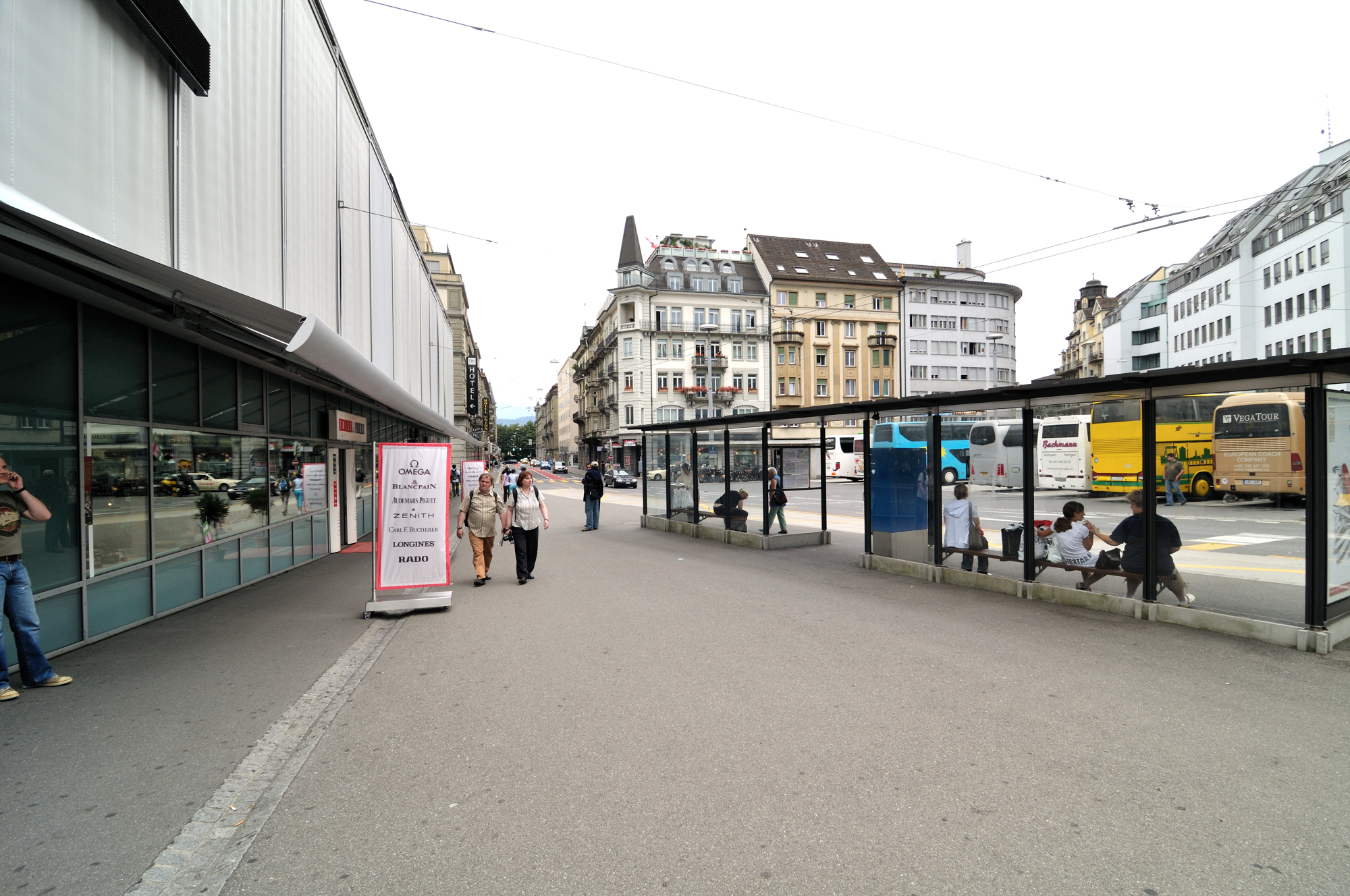 | ルツェルン中央駅前のゼーヴルック [Seebrücke] (桟橋) から西方向を望む (15:39)「西」MAP ゼーヴルック [Seebrücke] の下を流れる川は、ロイス川 [Reuss River] で、フルカロイス [Furkareuss] に源を発し、ルツェルン湖、ルツェルン市街を流れ、ヴィンディッシュ [Windisch] 近郊でアーレ川に合流する。 |