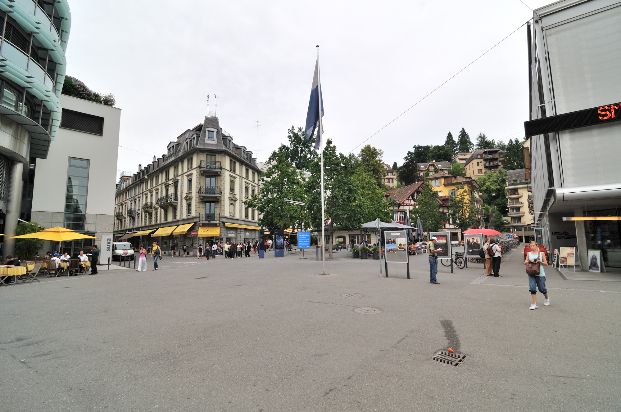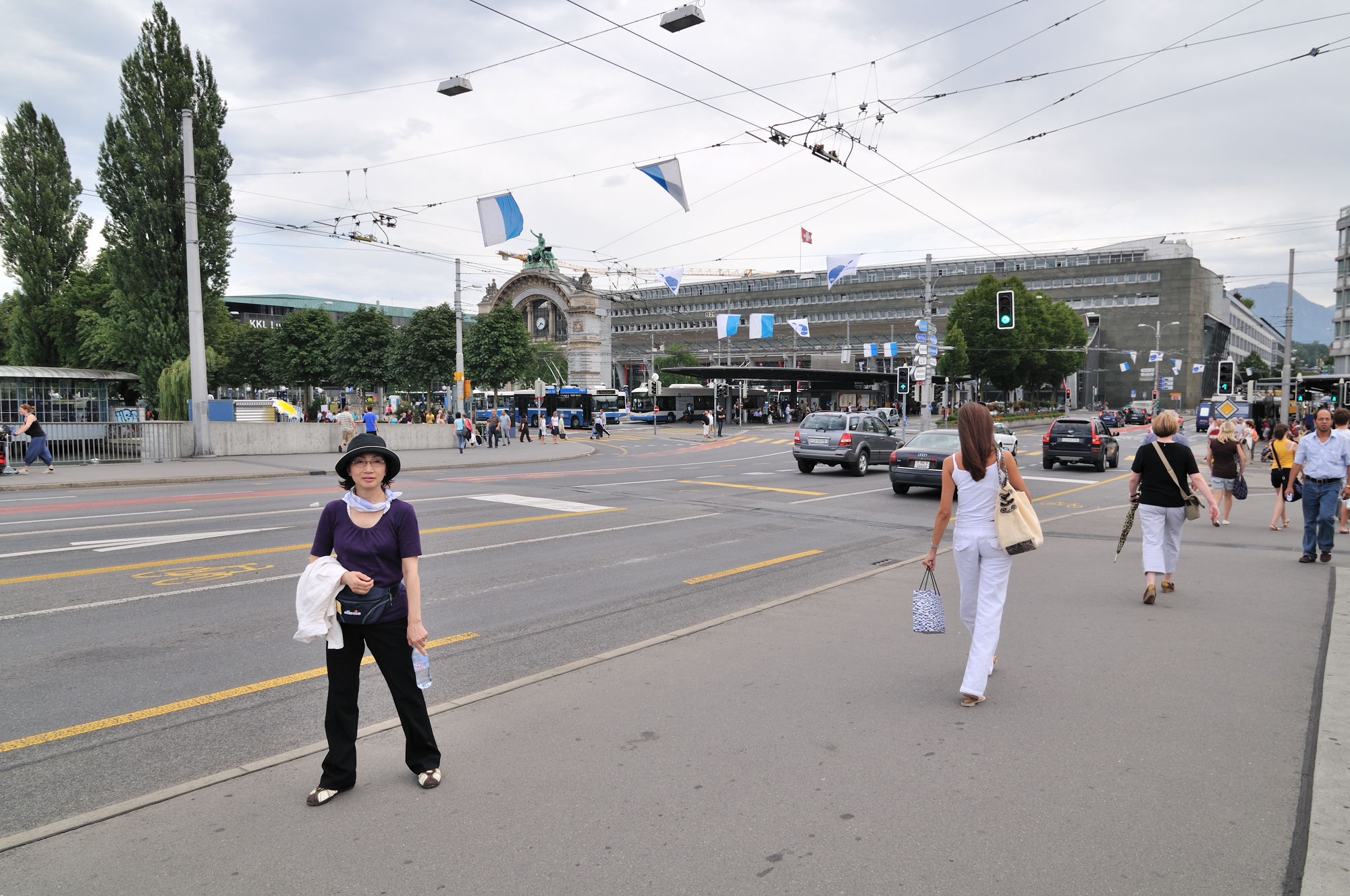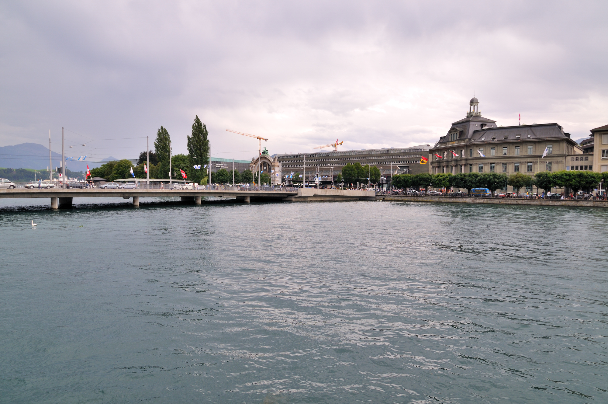 | ゼー橋 [Seebrücke] にて、「中央」の建物は、ルツェルン中央駅 [LUZERN HAUPT BAHNHOF] (15:40)「南東」MAP 道路上に掲揚されているのは、ルツェルン州の紋章。 |