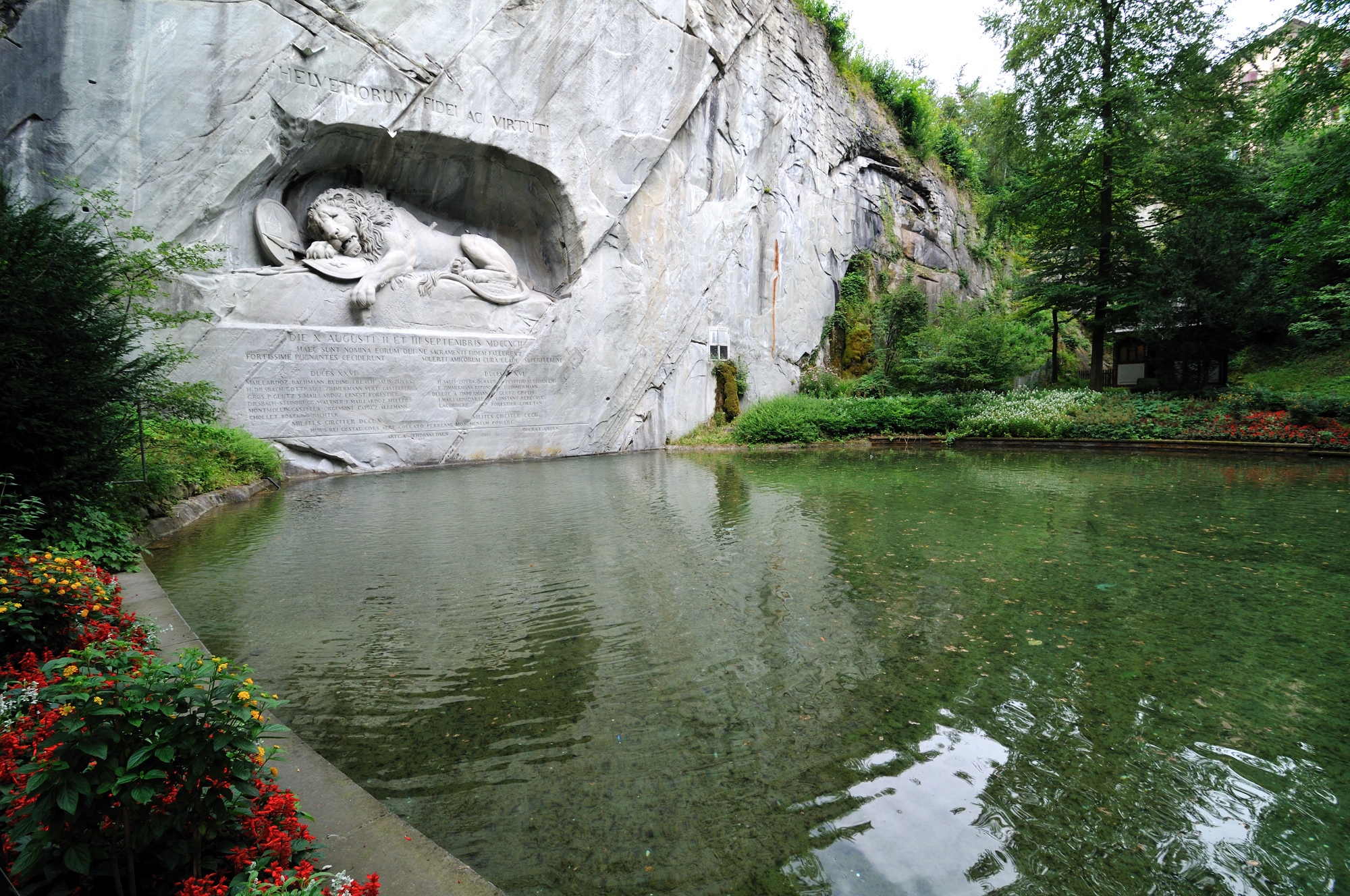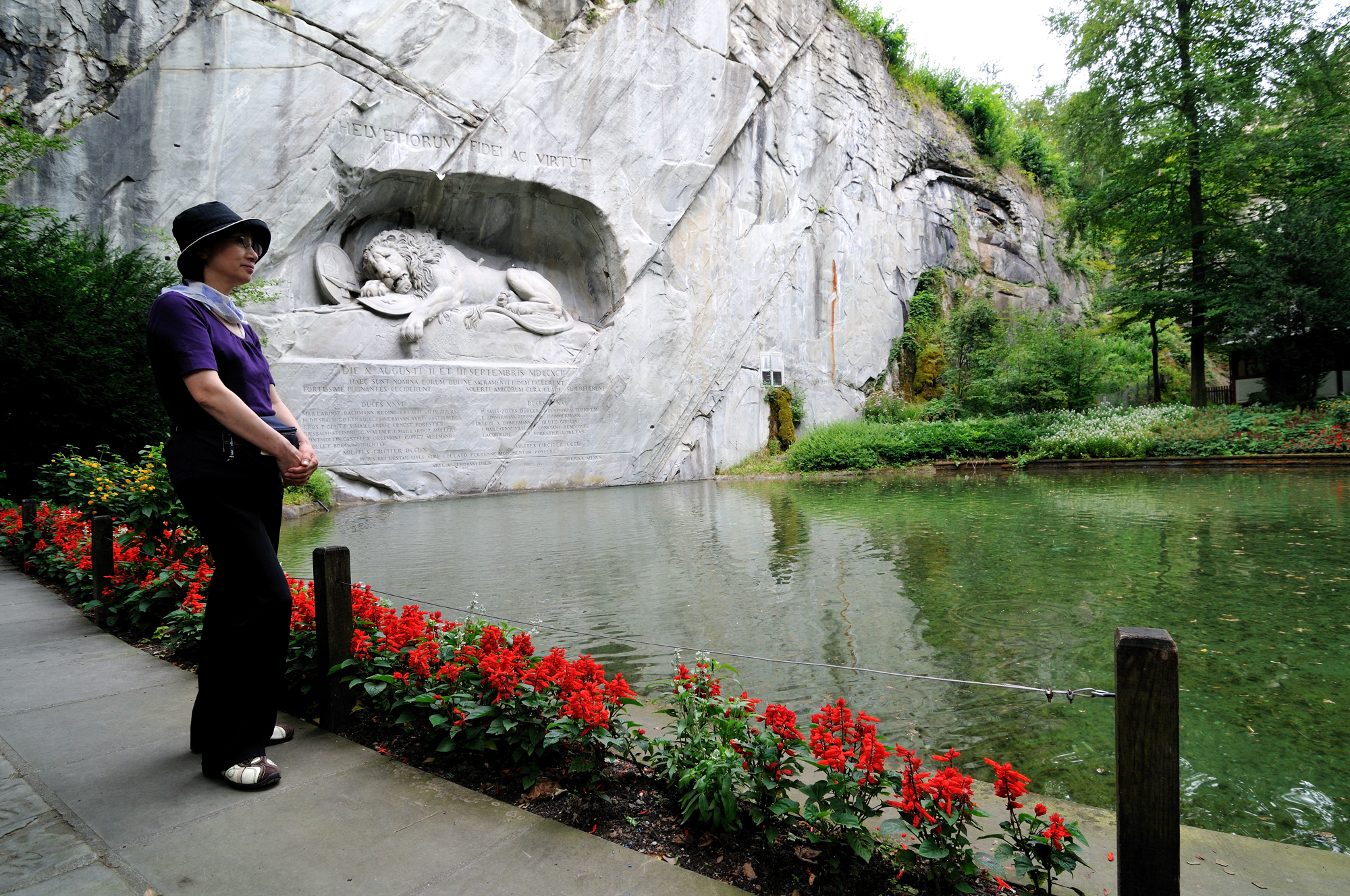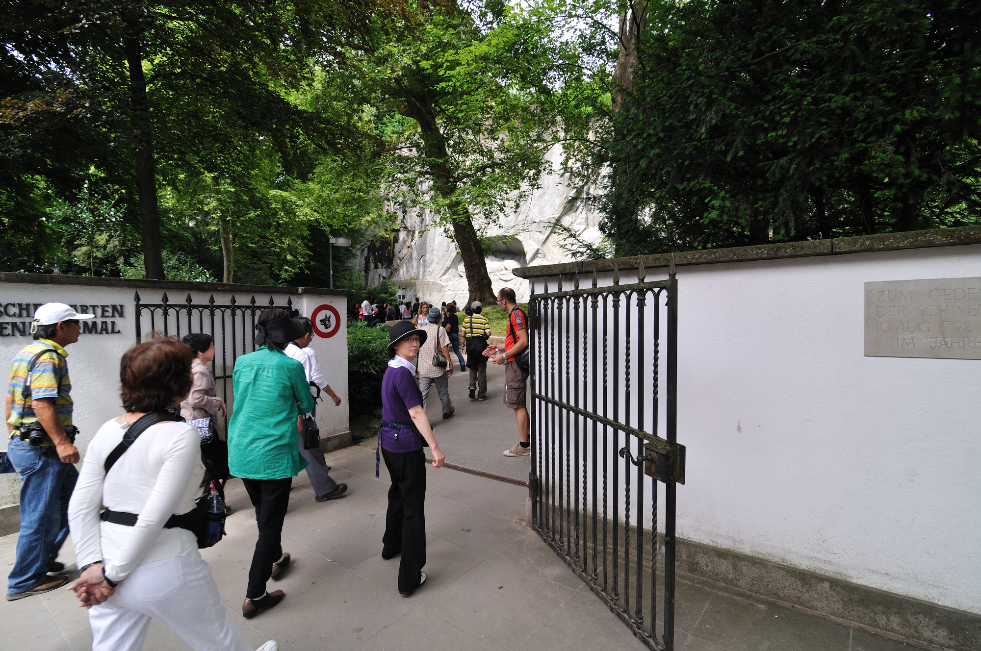 | ライオン記念碑 [Löwendenkmal] 入口 (15:02)「北北東」MAP フランス革命時に民衆がパリのチュイルリー宮殿でルイ16世を襲撃したとき、身を挺して玉砕した傭兵 (786人) を記念して造られたもので、スイス傭兵の勇敢さと戦争の悲惨さを今に語っている。 碑は天然の岩に刻み込んだもので、心臓を矢で射貫かれた瀕死のライオンになぞらえ、1821年に慰霊碑が完成した。 作家マーク・トウェインは、「世界で最も悲惨で心を打たれる岩塊」と記している。 スイス傭兵は勇敢で忠誠心が強いことから信頼が厚く、今でもミケランジェロがデザインした制服を着てヴァチカン宮殿を守っている。 (写真) |