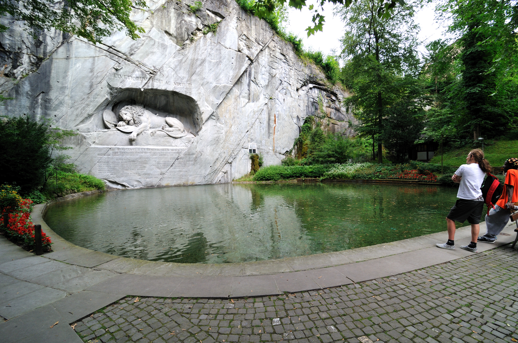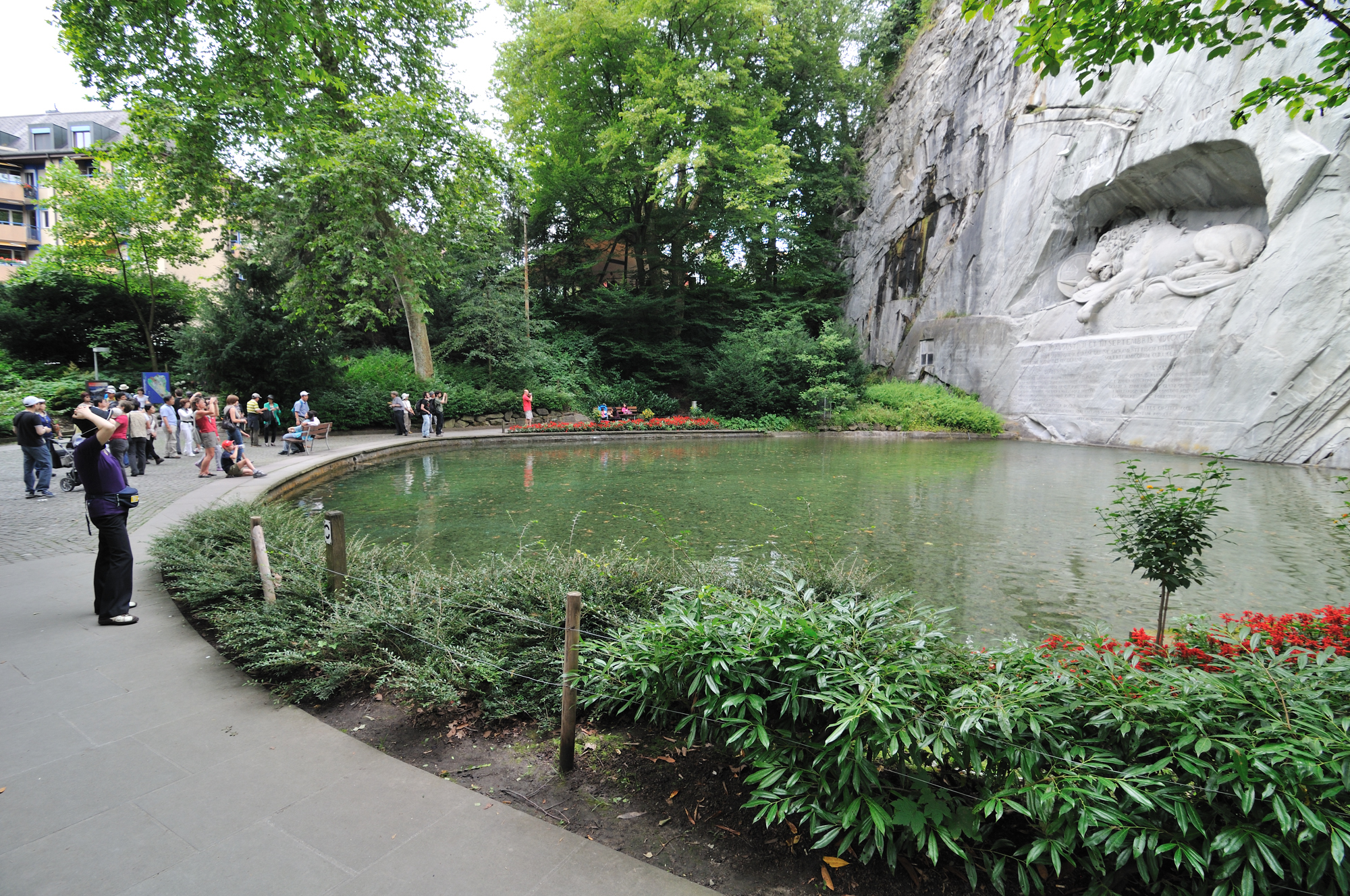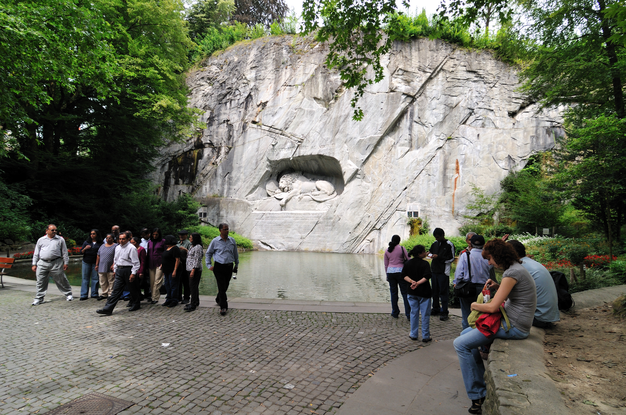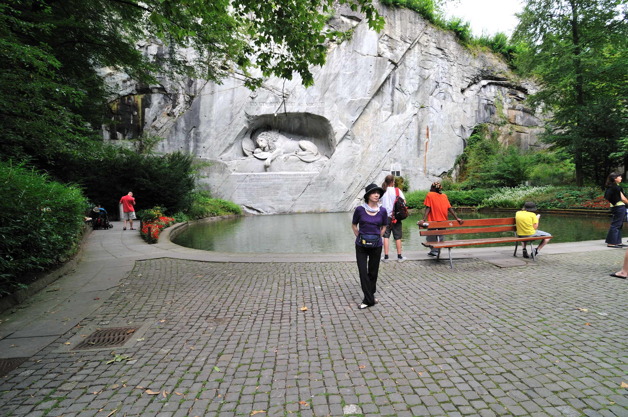 | ライオン記念碑 [Löwendenkmal] 入口 (15:02)「北北東」MAP フランス革命時に民衆がパリのチュイルリー宮殿でルイ16世を襲撃したとき、身を挺して玉砕した傭兵 (786人) を記念して造られたもので、スイス傭兵の勇敢さと戦争の悲惨さを今に語っている。 碑は天然の岩に刻み込んだもので、心臓を矢で射貫かれた瀕死のライオンになぞらえ、1821年に慰霊碑が完成した。 作家マーク・トウェインは、「世界で最も悲惨で心を打たれる岩塊」と記している。 スイス傭兵は勇敢で忠誠心が強いことから信頼が厚く、今でもミケランジェロがデザインした制服を着てヴァチカン宮殿を守っている。 (写真) |