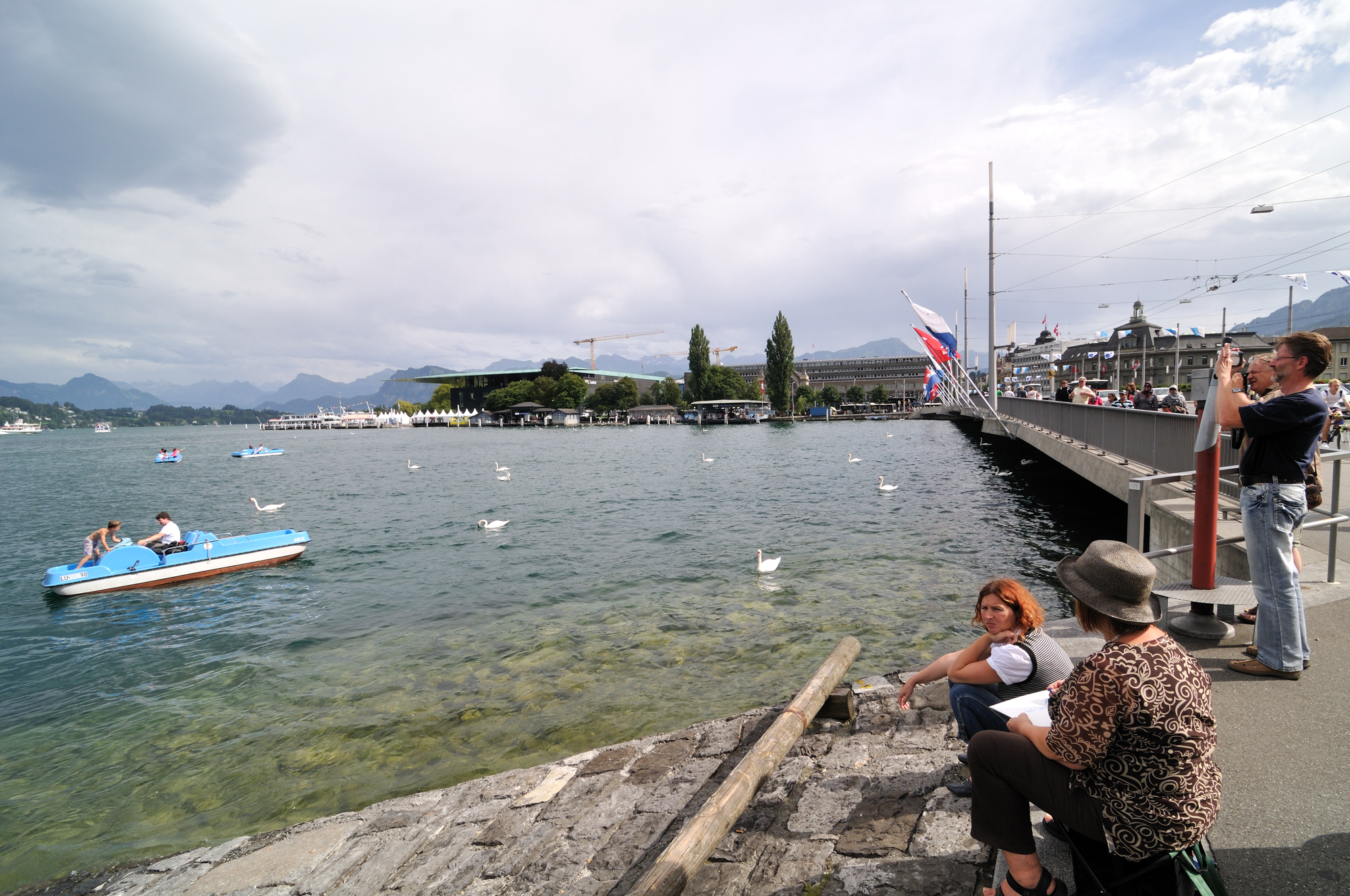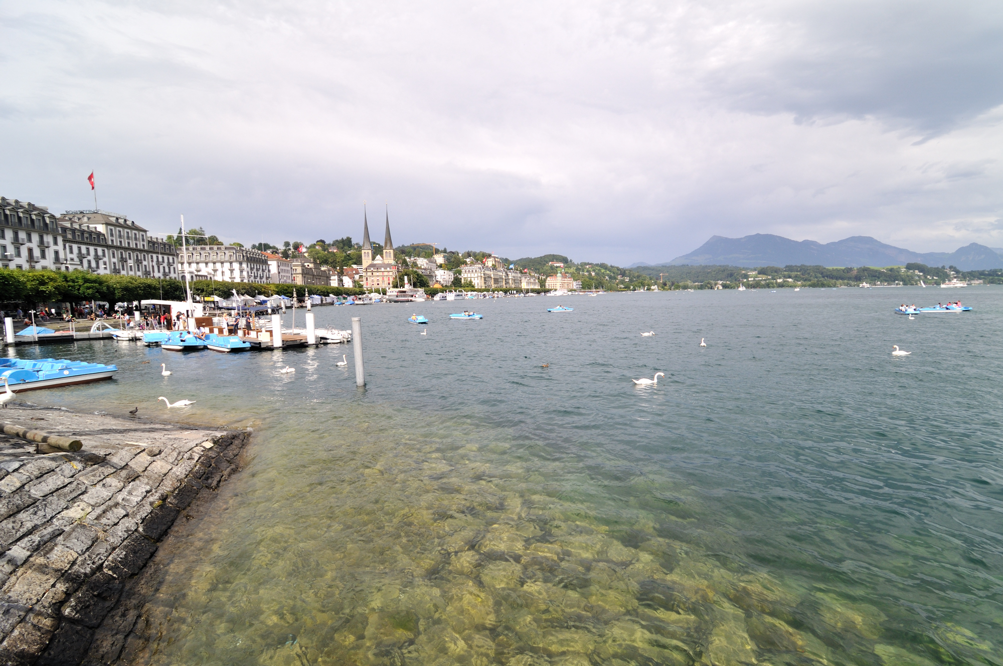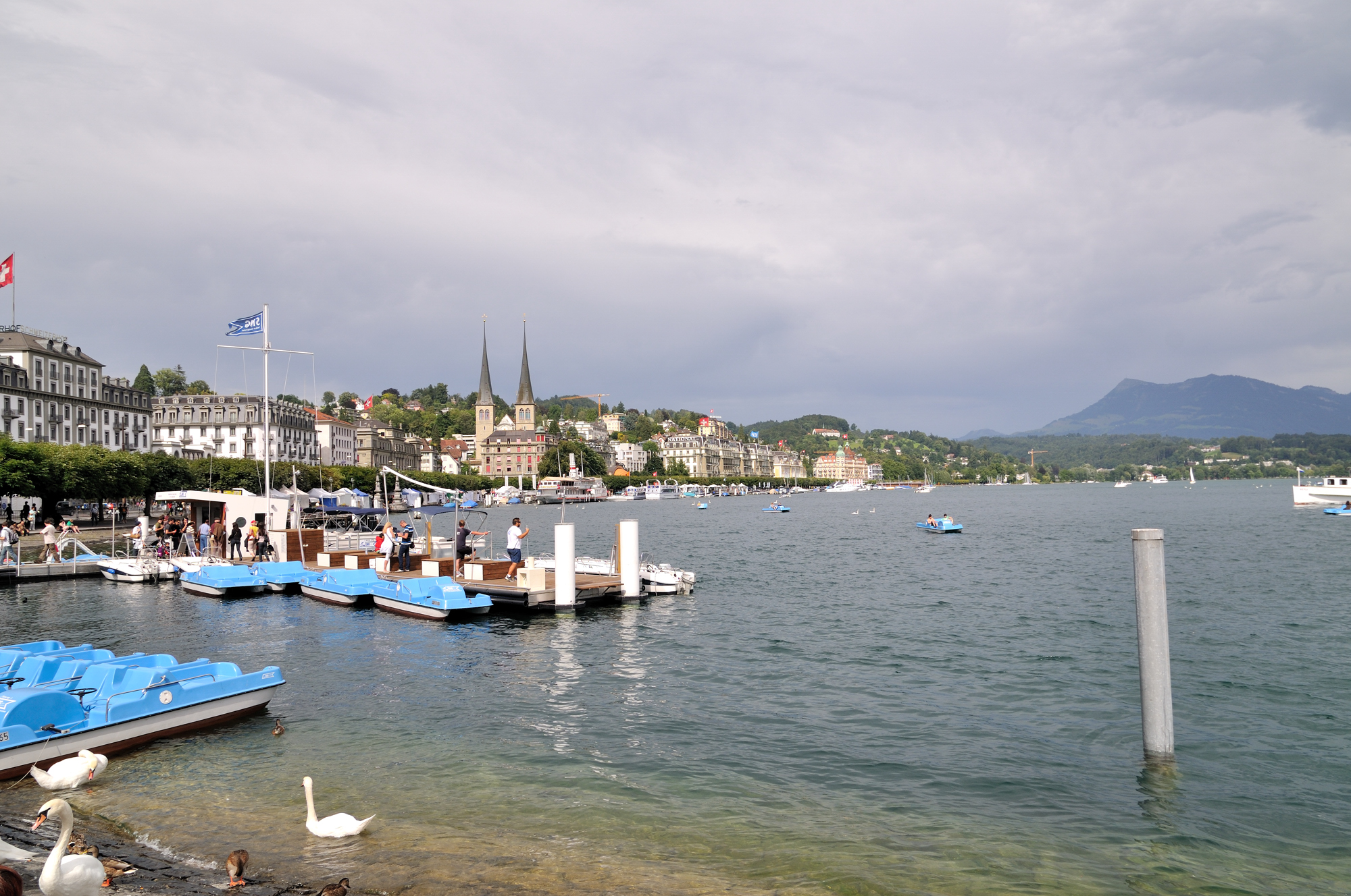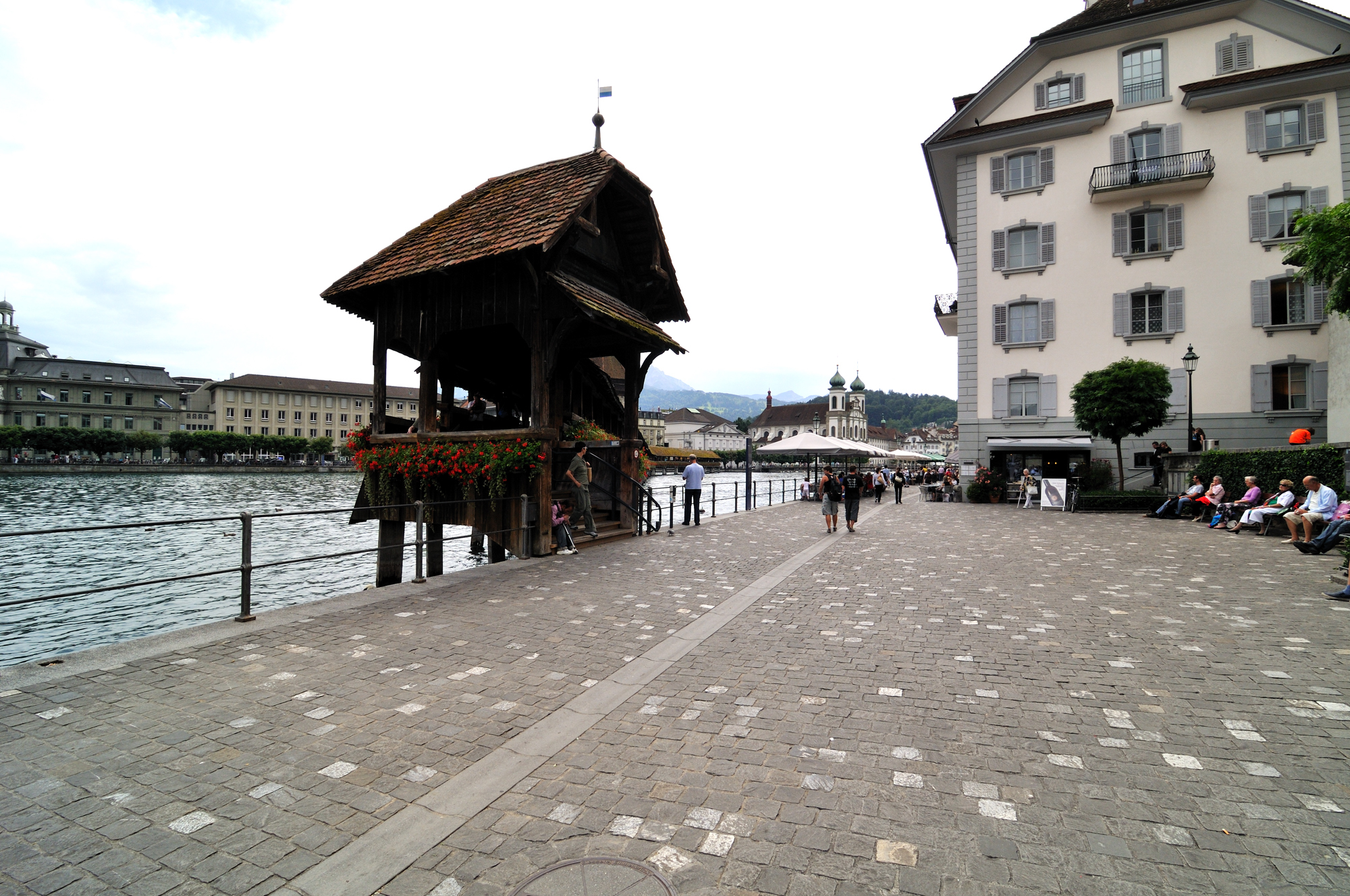 | Seebrücke Luzern (ルツェルン桟橋) 上 (15:40)「北」MAP 「右中央」に見える2本の尖塔は、ホーフ教会 [Hofkirche] 、橋の右手はフィアヴァルトシュテッテ湖 [Vierwaldstättersee] 。 |