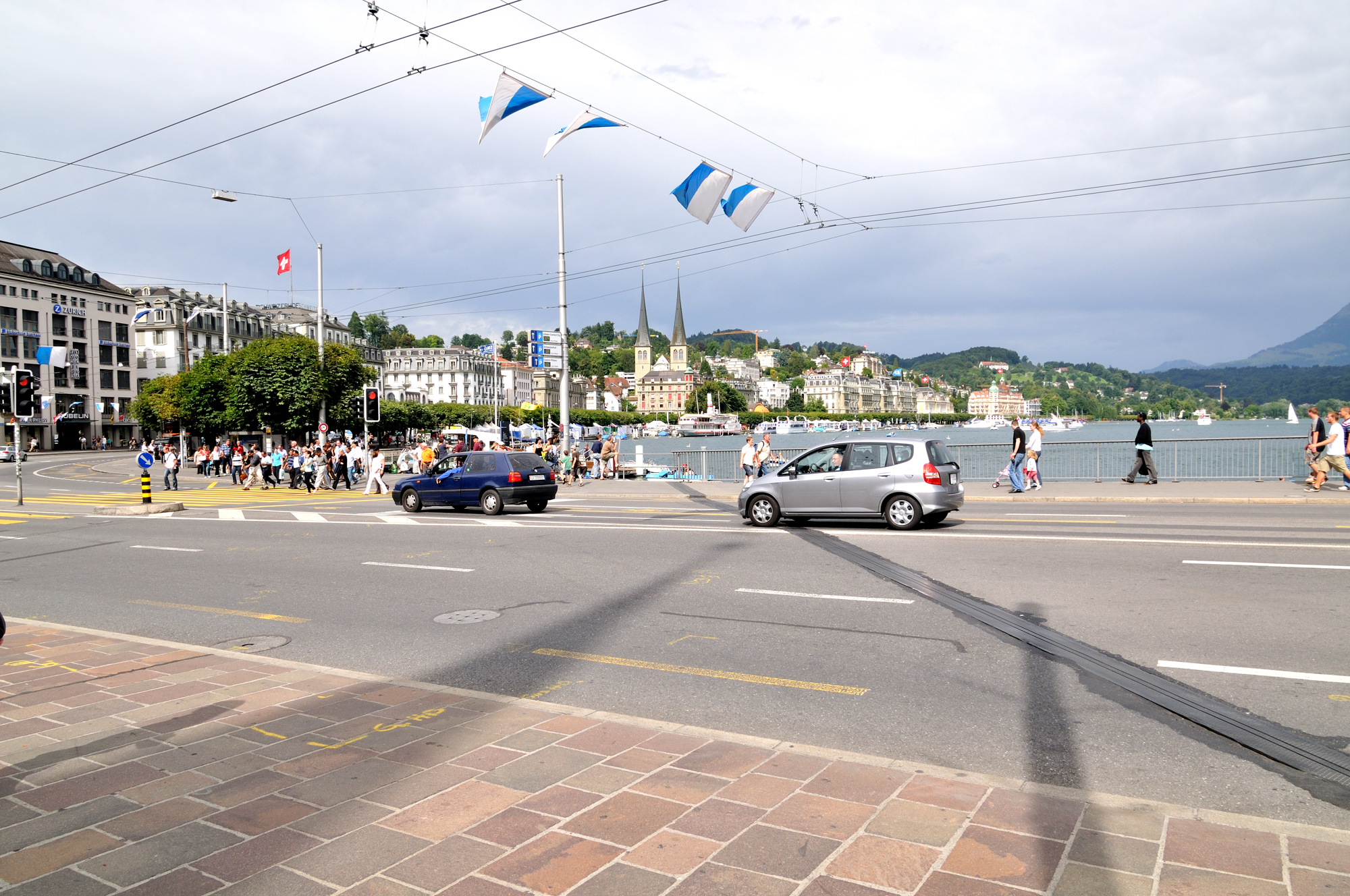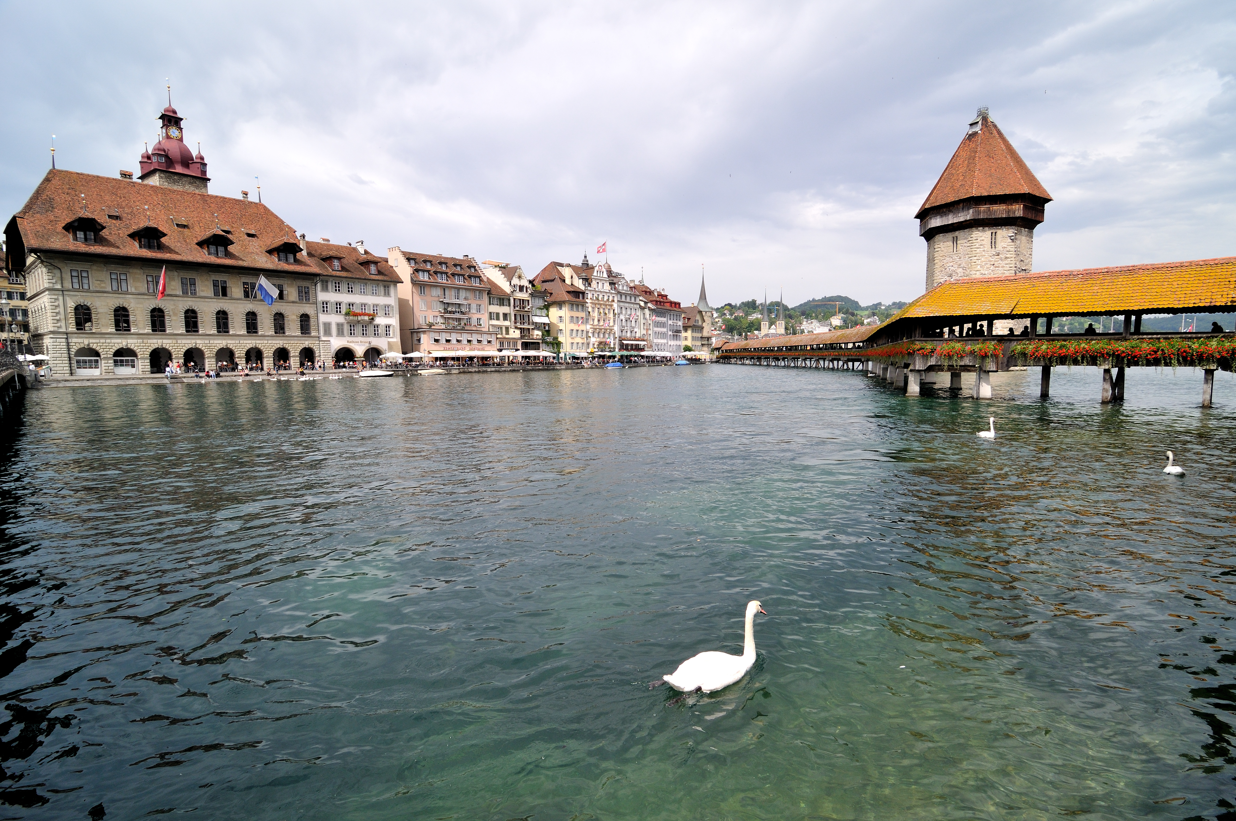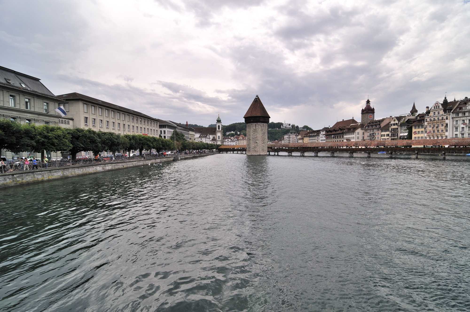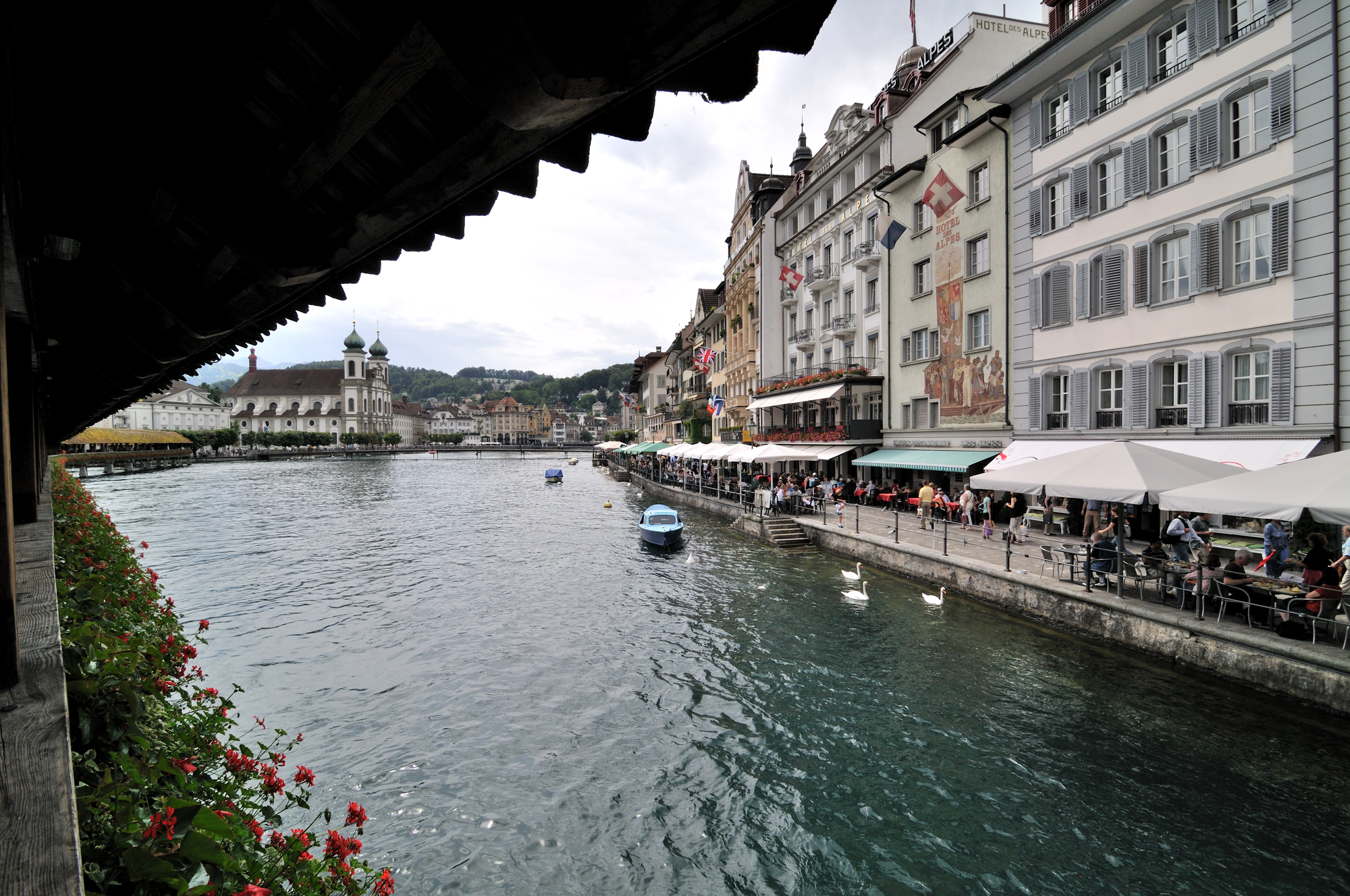 | 写真の「中央」に、2本の尖塔がある建物は、ホーフ教会[Hofkirche] (16:38)「北東」MAP 橋上に掲揚されているのは、ルツェルンの州旗。 |
