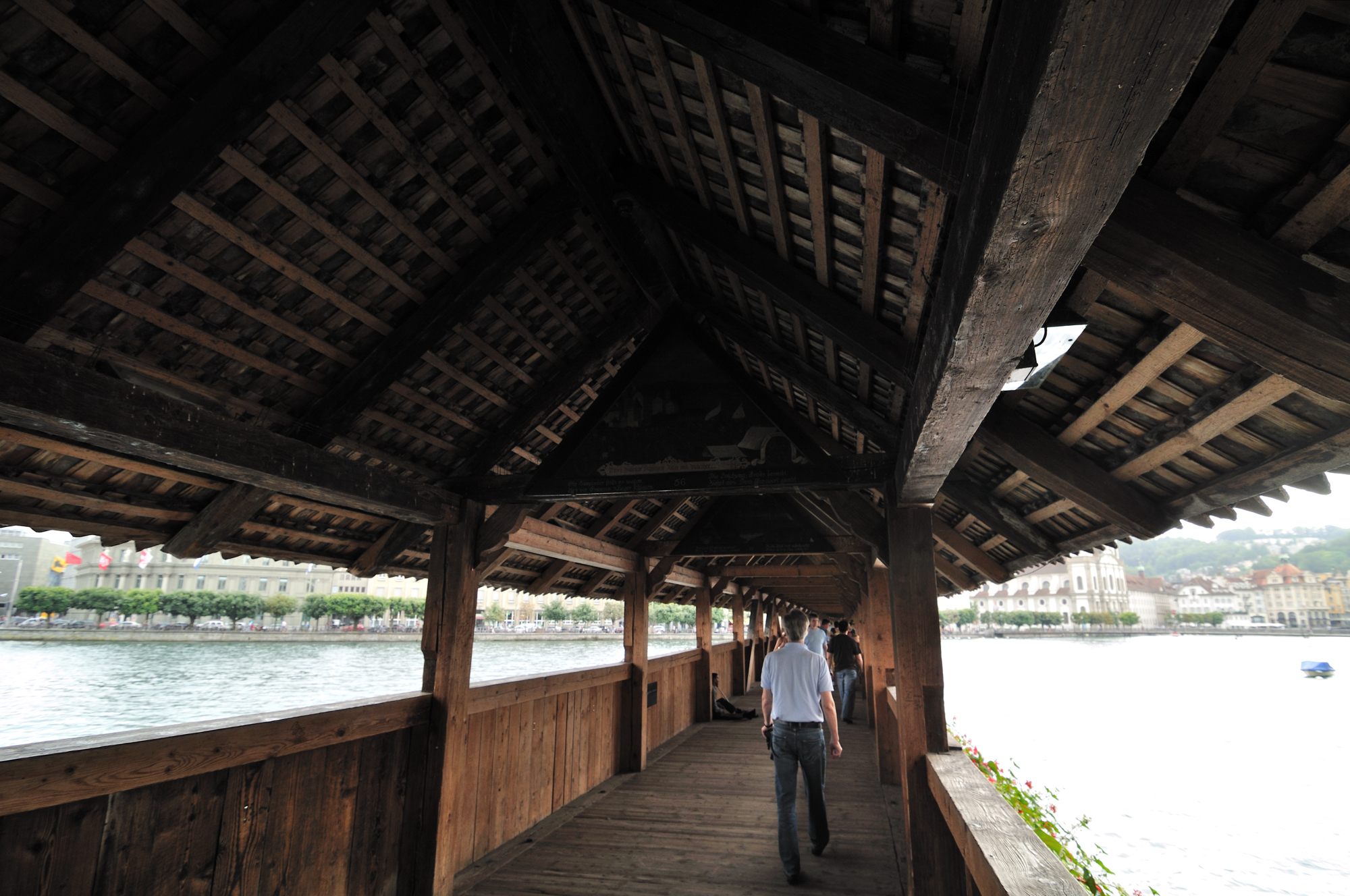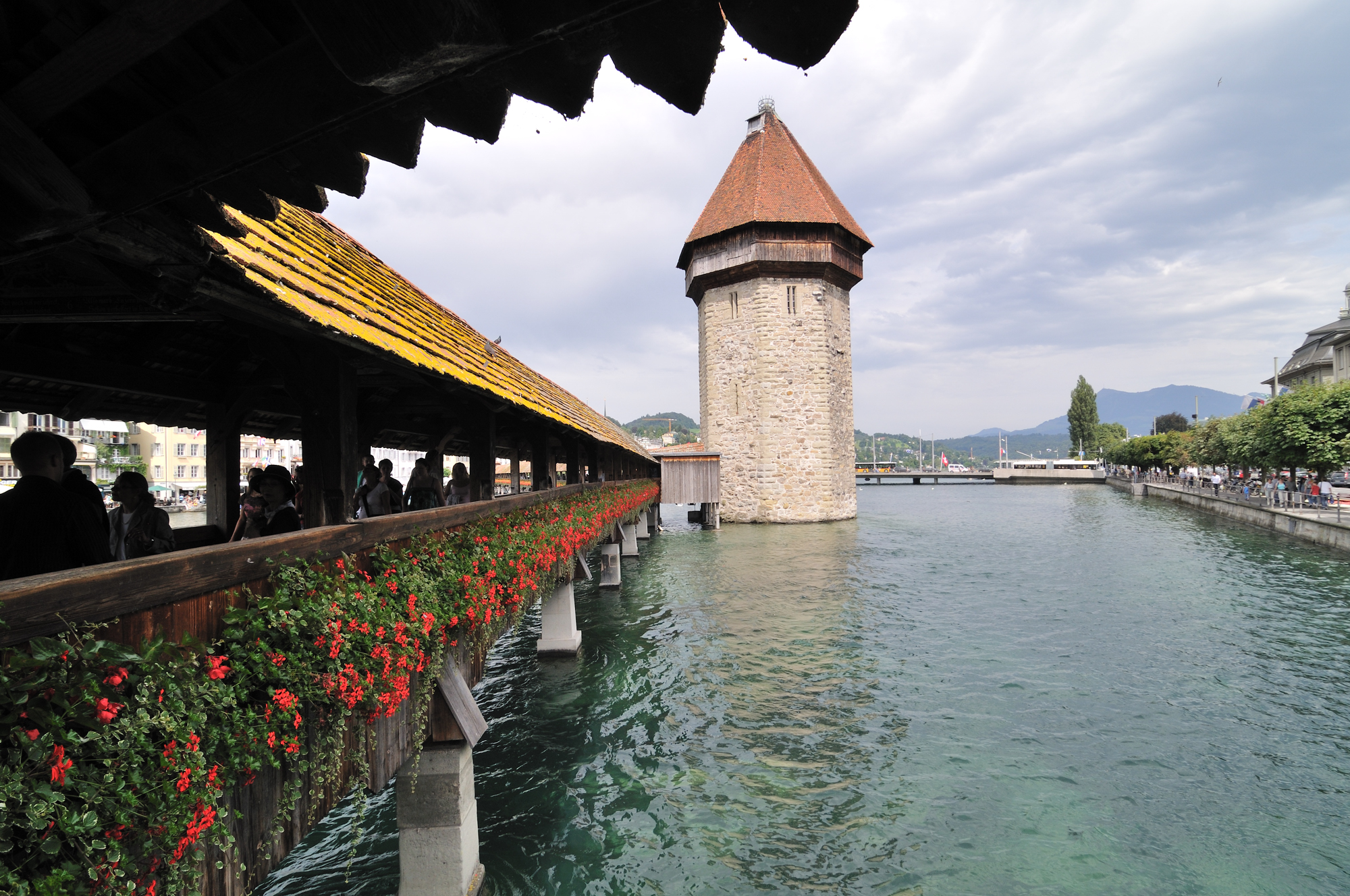 | カペル橋 [Kapellbrücke] (15:20)「南西」MAP 町のシンボルともいえる美しい屋根付き橋。 1333年に建造された全長204mの木造橋で、湖からの敵の侵入を監視するための巡視路として架けられた。 木造橋としてはヨーロッパ最古だったが1993年にその大半を消失し、翌年再建された。 並んで立つ八角塔は水道塔で、1300年ごろに城壁の一部として造られ、一時は牢獄や拷問室に使われたこともある。 |
