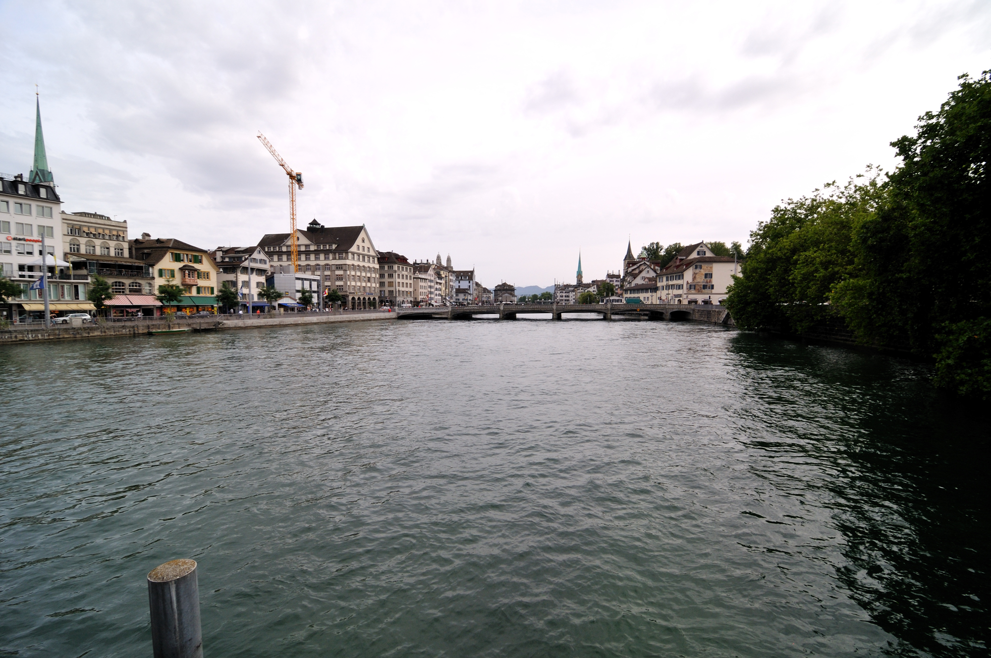 | リマト川 [Limmat] (18:04)「南南東」MAP 前方の橋は、ルドルフ・ブルン橋 [Rudolf Brunbrücke] 、右に見える二つの尖塔のうち、手前の尖塔が聖ペーター教会 [St-Peter Kirche] 、その向こうの尖塔がフラウミュンスター [Fraumünster] (聖母聖堂) 、左端に見える緑の尖塔がプレディガー教会 [Prediger Kirche] 。 |