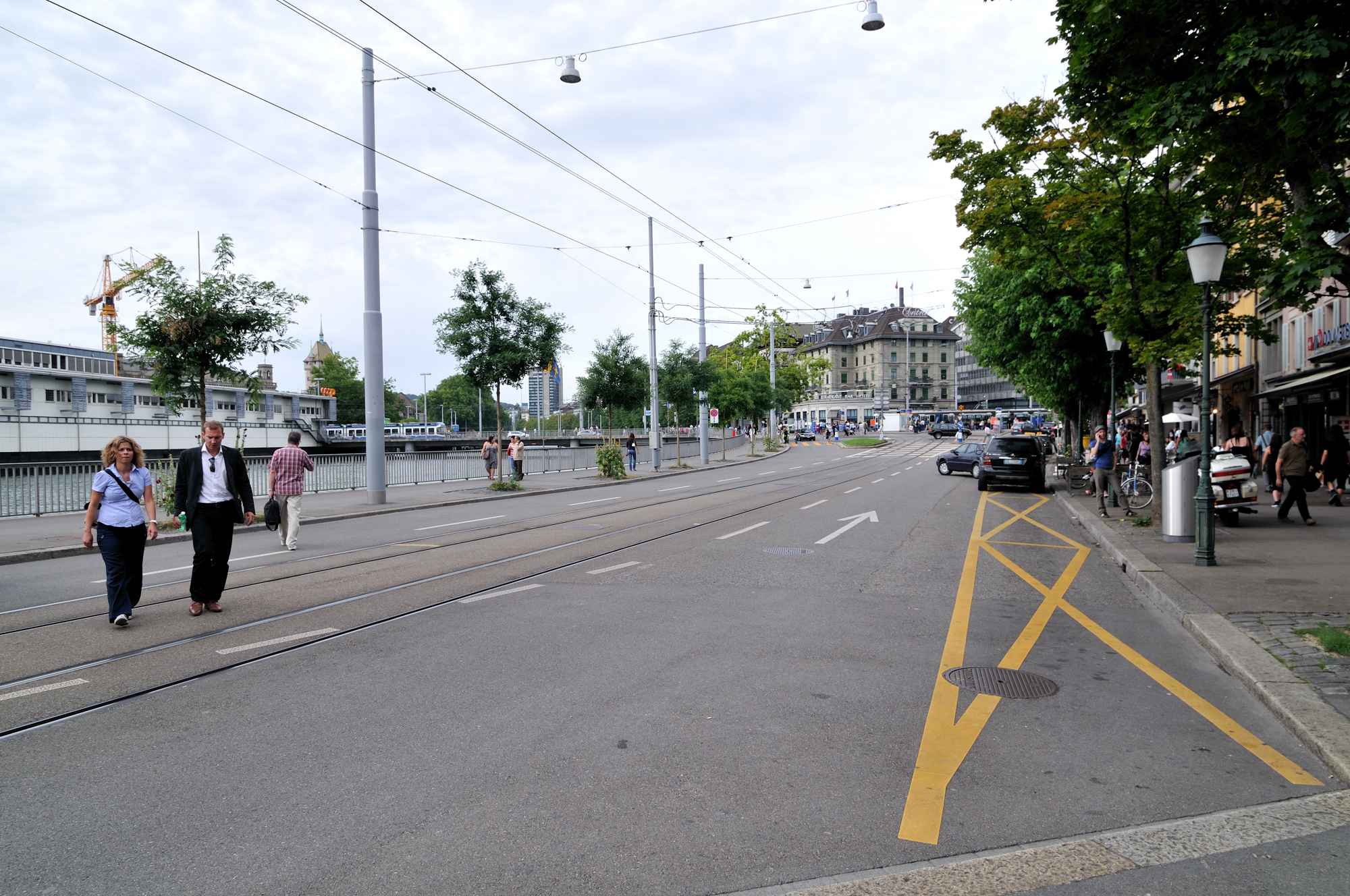| "リマト河岸通り" [Limmat Quai] (18:05)「北」MAP 左にリマト川があり、左前方にチューリッヒ中央駅 [Zürich Haupt Banhof] がある。 |