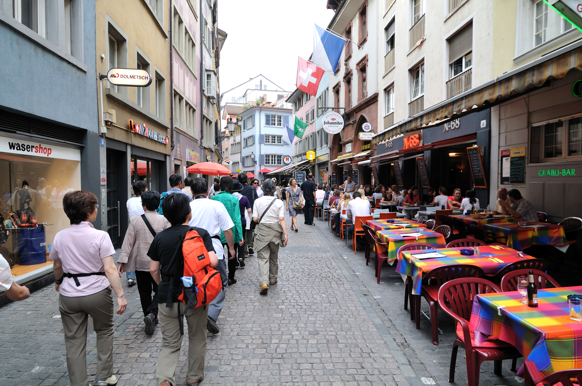 | ニーダードルフ通り [Niederdorf Strasse] (18:06)「北」MAP 夕食のため、レストランへ向かう (スイス国旗が立てられているレストラン) 国旗とともに掲揚されているのはチューリッヒ州の紋章 |