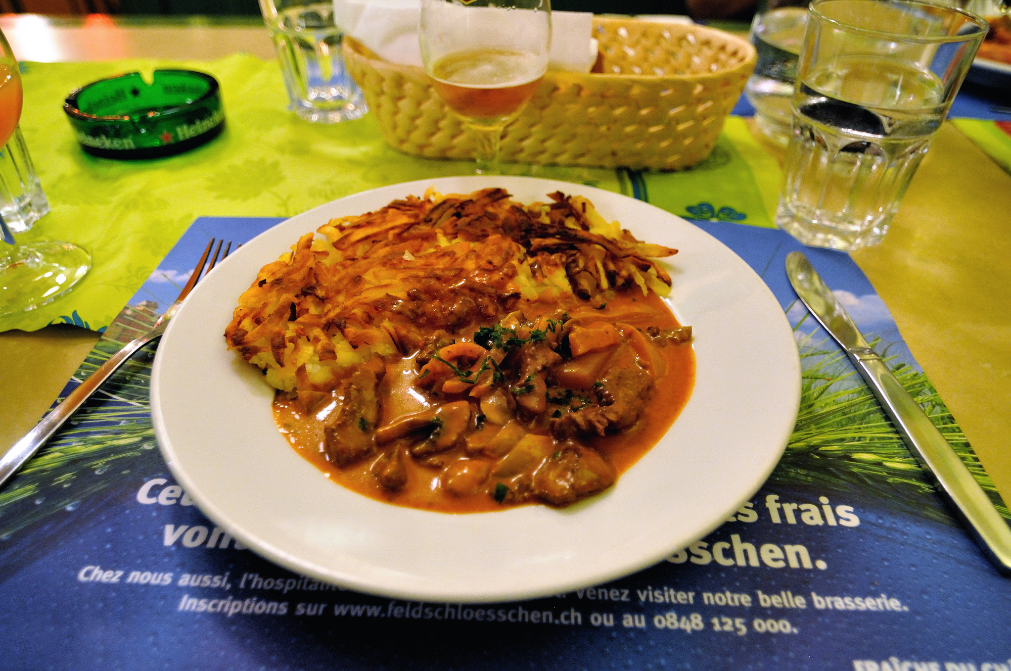 | スイスの郷土料理: ゲシュネツェルテス [Geschnetzeltes] の レシュティ [Rösti] 添え (18:35)MAP ゲシュネツェルテス [Geschnetzeltes] は薄切りの仔牛肉とマッシュルームをクリームで煮込むチューリッヒ名物で、レシュティ [Rösti] はジャガイモの細切りをフライパンで炒め、パンケーキのような形にして表面がカリカリになるまでこんがりと焼いたもの。 ライスやパスタのように、料理の付け合わせとして添えられることもあるが、メイン料理としても好まれている。 |