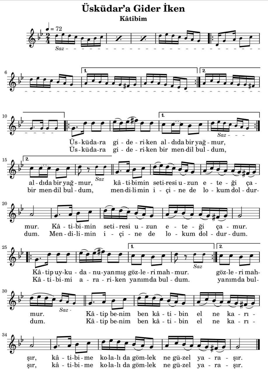 | この歌は、ユスキュダル(イスタンブルの一部)へと旅していく女性とその秘書についての物語を歌ったトルコの民謡キャーティビム [Kâtibim] に基づいている。 |