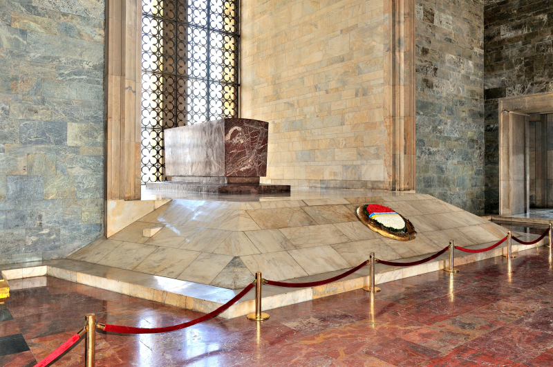 | アタテュルク廟 [Anıtkabir] (14:19) アタテュルク廟(アタテュルクびょう)とは、トルコ共和国の首都アンカラにある、初代大統領ムスタファ・ケマル・アタテュルク [Mustafa Kemal Atatürk] の霊廟。 トルコではアヌトゥカビル [Anıtkabir] と呼ばれている。 1938年11月10日、イスタンブール滞在中、執務室のあったドルマバフチェ宮殿で死亡。 死後、アンカラに運ばれ、この霊廟に安置された。 因みに、遺体は、この石棺の10メートル真下に土葬されている。 MAPLay. 2 O |