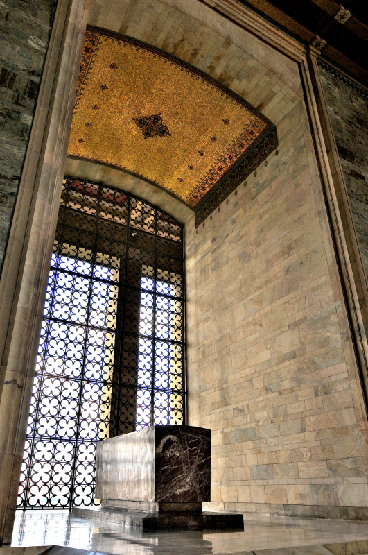 | アタテュルク廟 [Anıtkabir] (14:20) アタテュルク廟(アタテュルクびょう)とは、トルコ共和国の首都アンカラにある、初代大統領ムスタファ・ケマル・アタテュルク [Mustafa Kemal Atatürk] の霊廟。 トルコではアヌトゥカビル [Anıtkabir] と呼ばれている。 1938年11月10日、イスタンブール滞在中、執務室のあったドルマバフチェ宮殿で死亡。 死後、アンカラに運ばれ、この霊廟に安置された。 因みに、遺体は、この石棺の10メートル真下に土葬されている。 また、象徴的な棺が置かれた天井には、絨毯を模したモザイクが貼られている。 MAPLay. 2 O |