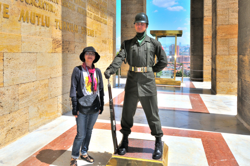 | アタテュルク廟 [Anıtkabir] のエントランス (14:24) フィギュアモデルかと見まがう兵隊さん。 ここは、兵隊さんと一緒に写真を撮ることが許されている。 腰の後ろには、短剣を隠し持っており、衛兵の交代式が行われるまでの間 (一時間)、直立不動を保たなければならない。 「北西」MAPLay. 2 P |