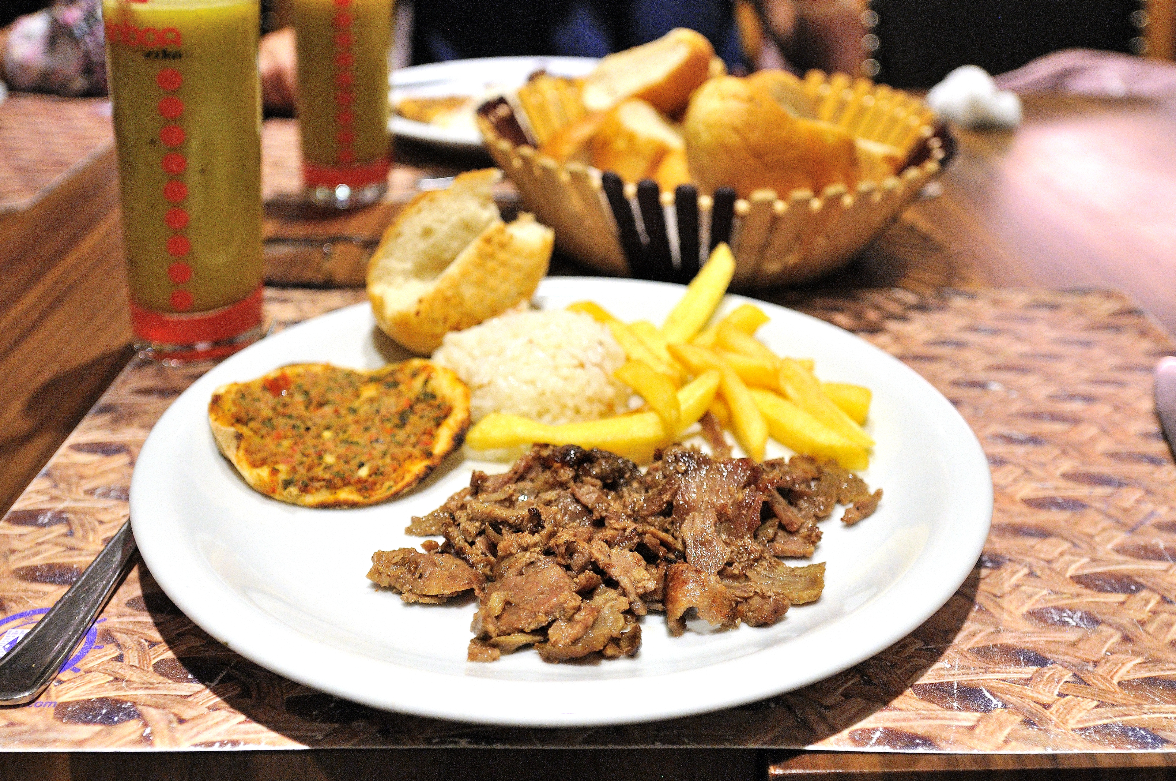 | 夕食のレストラン: "Sur Balık Restoran Sarayburnu" (20:54) 名物の "ドネルケバブ" [döner kebab] 。 トルコ料理の1つで、羊などの肉のスライスを何層にも重ねたかたまりを、垂直の串に刺して、回転させながらあぶり焼きにしたもの。 焼けた部分から削り落として食べる。 MAPLay. 2 m |