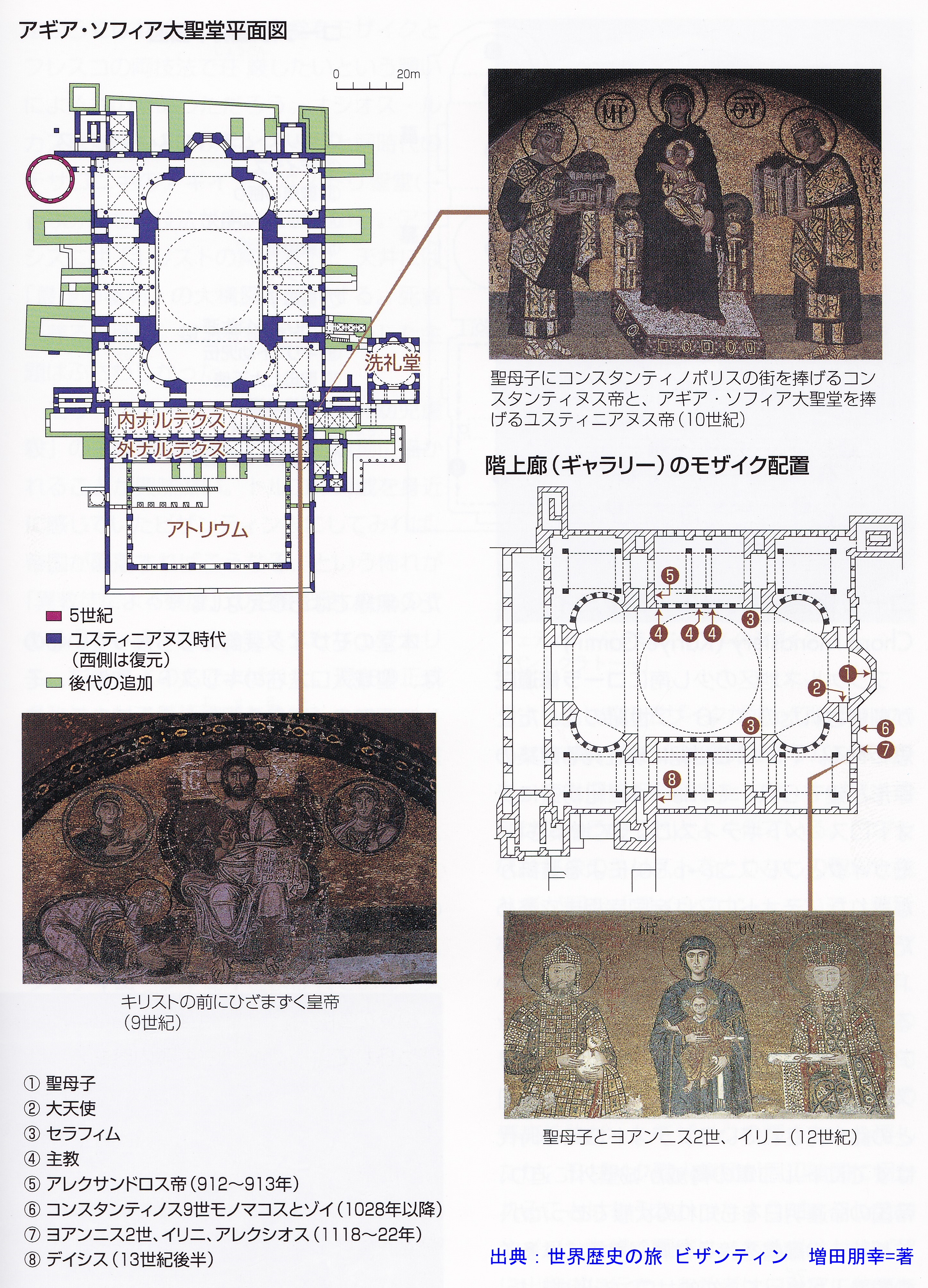 | 出口通路にあるモザイク画 (9世紀頃の作品) (15:45) このモザイクはアヤソフィア再建に関わるもので、向かって右側に描かれているのは、コンスタンティノポリスの創建者コンスタンティヌス大帝。 コンスタンティノポリスの町を聖母子に献上している。 左側に描かれているのは、ハギア・ソフィア (アヤ・ソフィア) を再建 (532 ~ 537年年) したユスティニアヌス帝で、聖堂を献上している。 (アギア・ソフィア大聖堂平面図) MAPLay. 1 g |