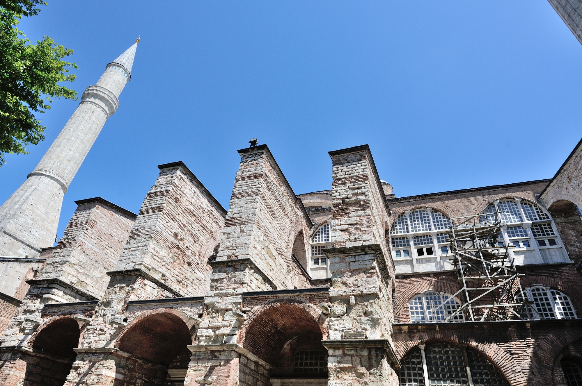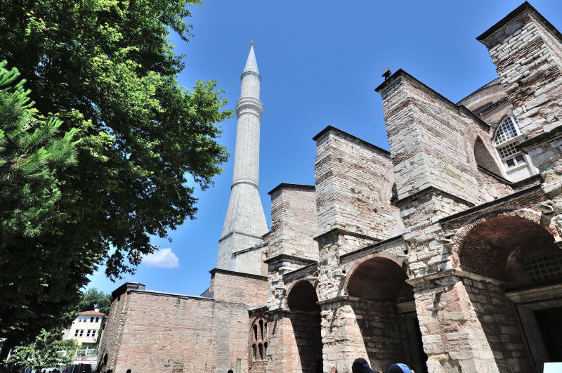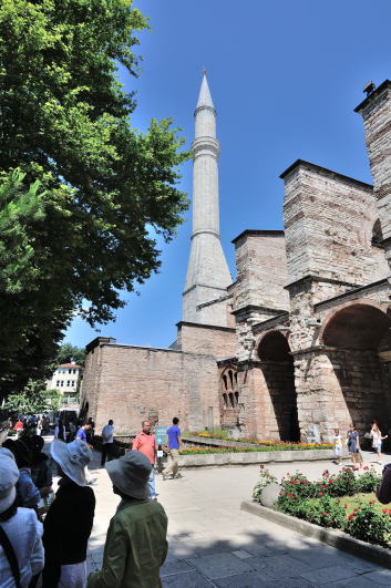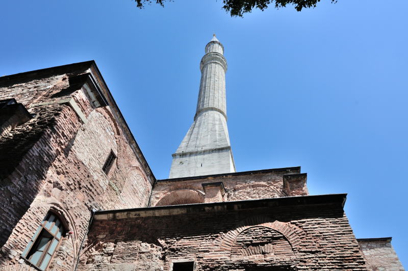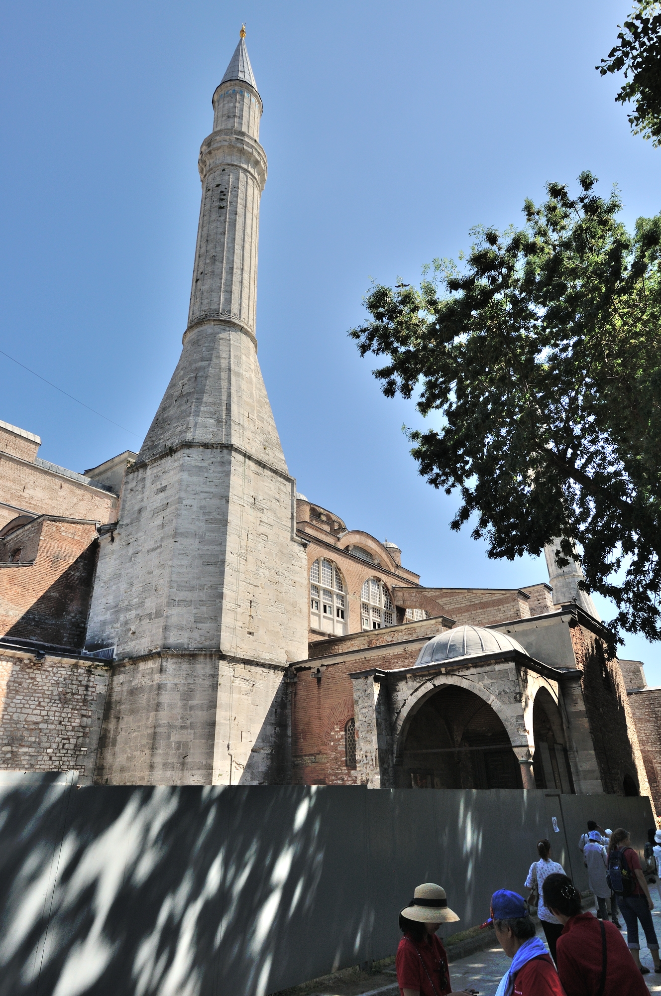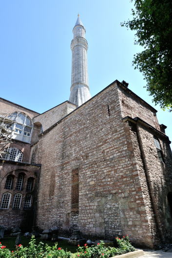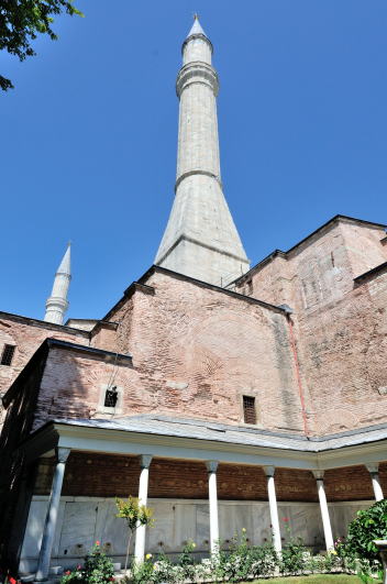 | アヤ・ソフィアの正面入口側のミナレット (15:06) 教会であった時代は、建物の崩壊が度々生じたが、トルコ人が建物を手に入れてから (15世紀以降) は、建築家であり世界初の地震対策技術者とも評されたミマール・スィナンが主導した外部からの補強構造追加など幅広い補修工事が行われた。 その結果、崩壊は免れてきたが、ミナレットの土台部を始め、モスク周辺部には多くの出っ張りができ、美観を損ねている。 (ユスティニアヌス大帝時代のアヤ・ソフィアとその後追加補強された建築個所) |