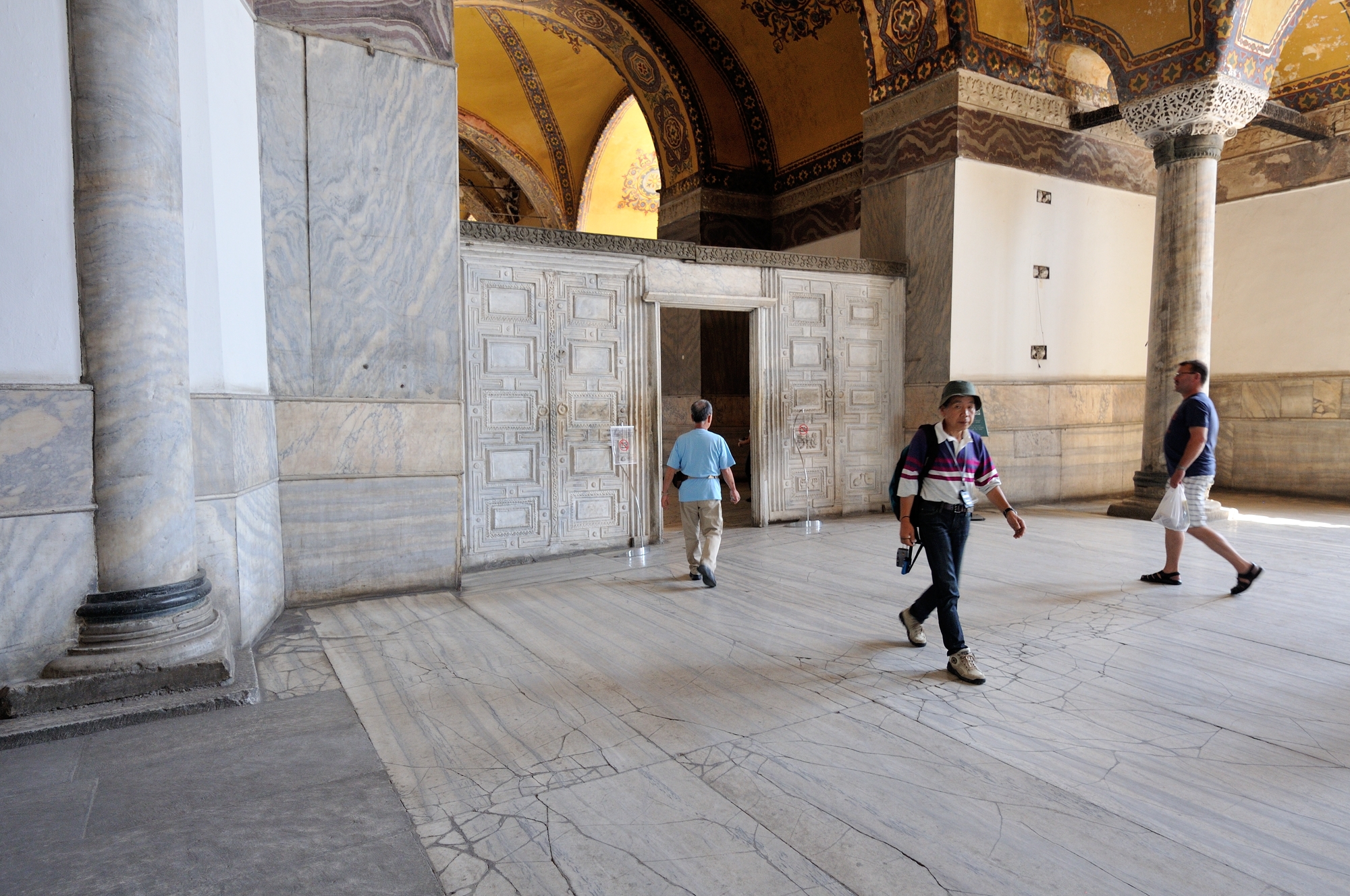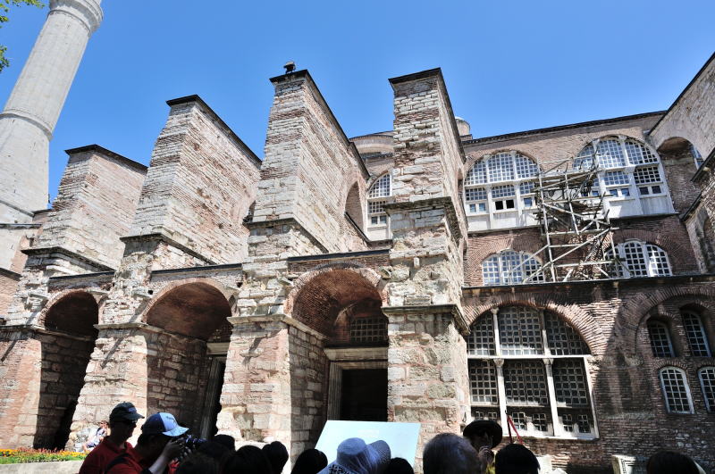 | アヤ・ソフィアの正面入口 (15:03) 教会であった時代は、建物の崩壊が度々生じたが、トルコ人が建物を手に入れてから (15世紀以降) は、建築家であり世界初の地震対策技術者とも評されたミマール・スィナンが主導した外部からの補強構造追加など幅広い補修工事が行われた。 その結果、崩壊は免れてきたが、ミナレットの土台部を始め、モスク周辺部には多くの出っ張りができ、美観を損ねている。 (ユスティニアヌス大帝時代のアヤ・ソフィアとその後追加補強された建築個所) 「東」MAPLay. 1 f |