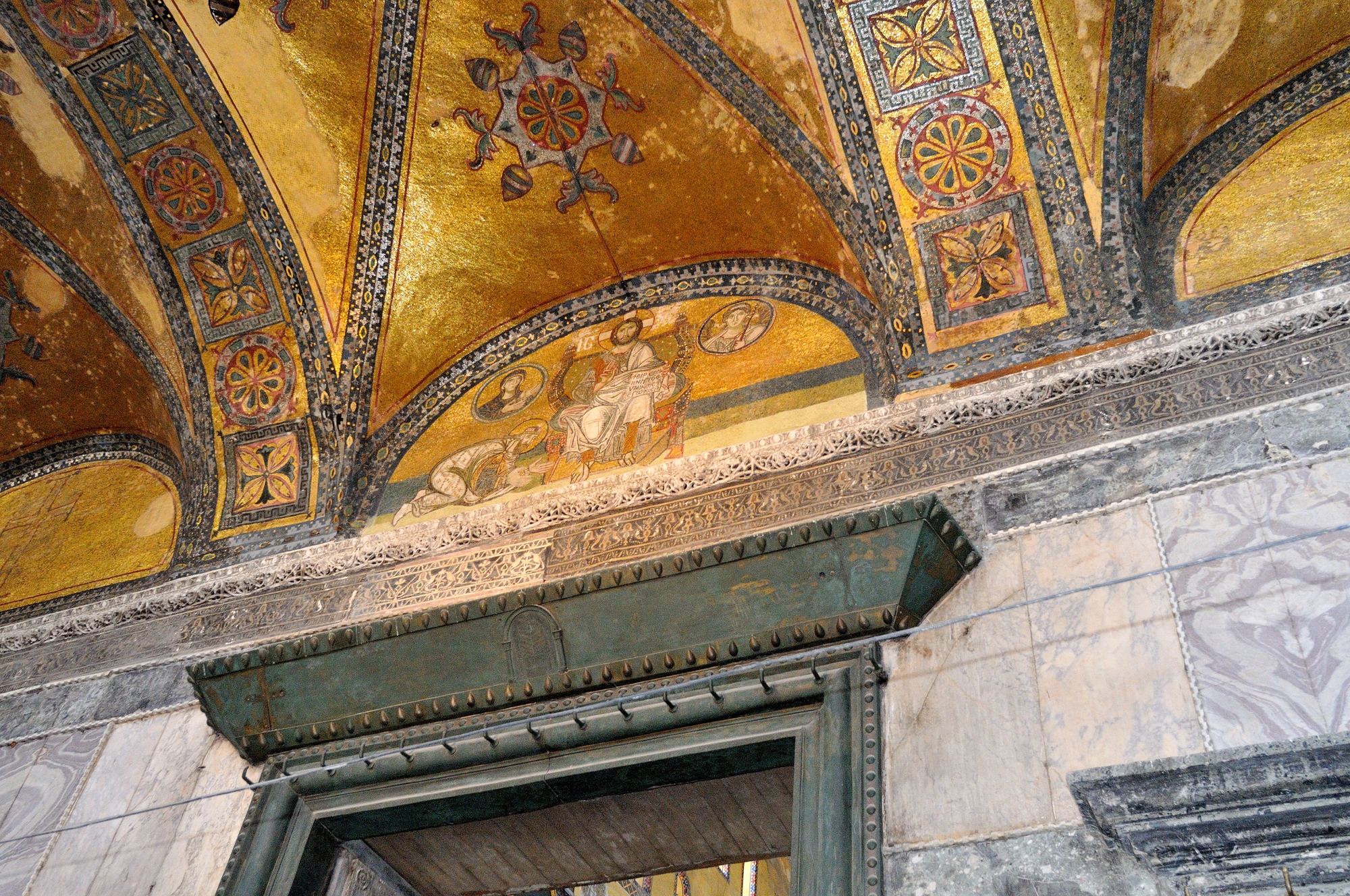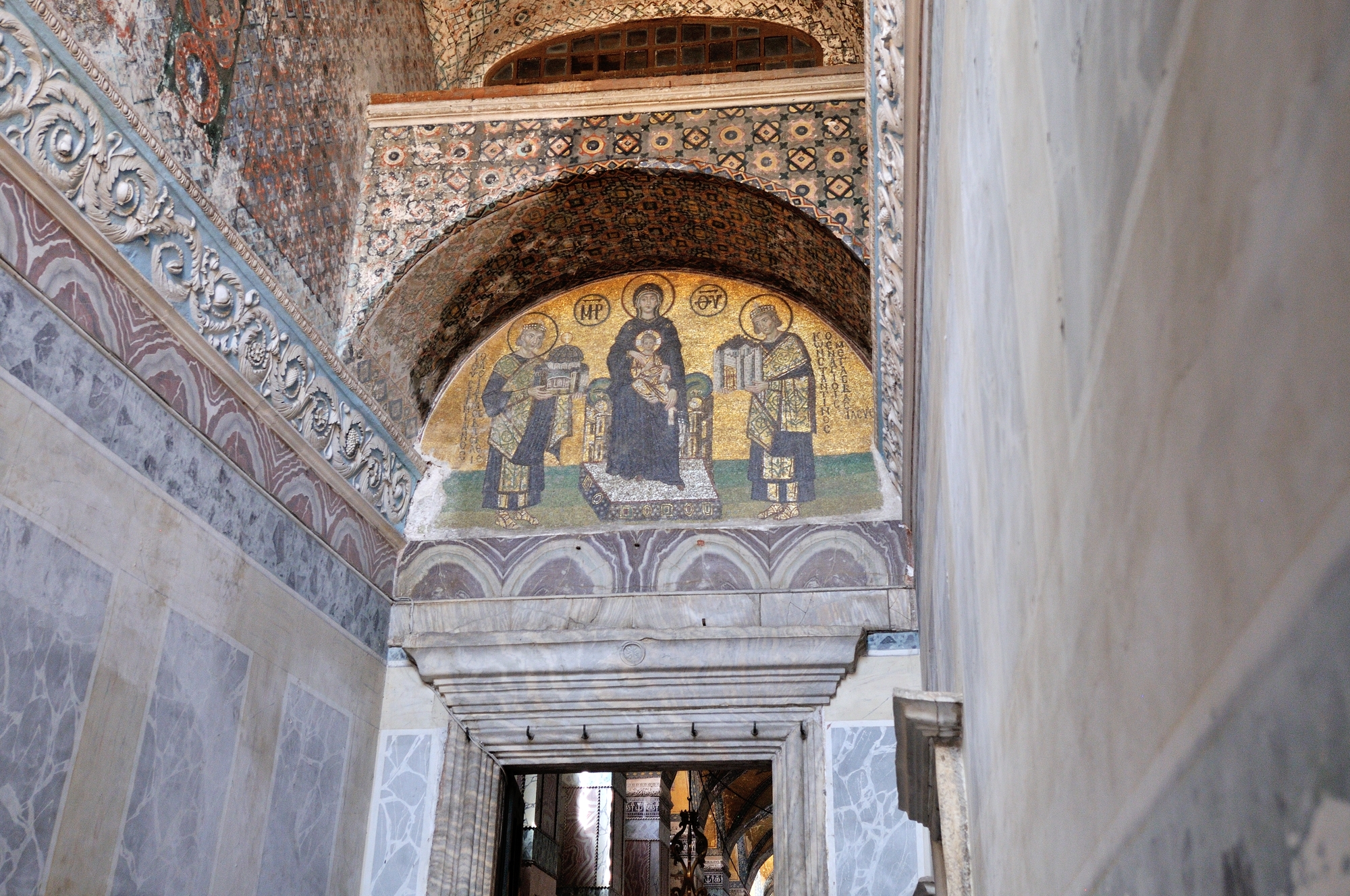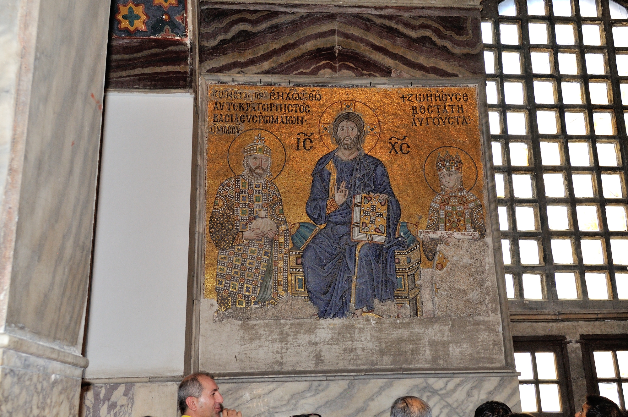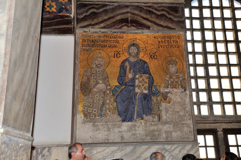 | 右階上廊 (皇族専用の空間) (15:27) 「キリストに寄進をする皇帝コンスタンティノス9世モノマコスと皇妃ゾイ」 のモザイク画。 (9世紀頃の作品) この大聖堂は、ビザンチン特有のモザイクによって壁面の多くが飾られていた。 オスマンの支配下で、漆喰の下に塗り込められた、これらのモザイクは、トルコ共和国時代 (初代大統領アタチュルク) に入ってから、1933 ~ 34年にかけての大修復で昔の姿をほぼとりもどした。 トルコ人の寛容さ、寛大さは、メヴラーナの教えを受け継いでいるのかも知れない。 (階上廊のモザイク配置 MAPLay. 1 g |