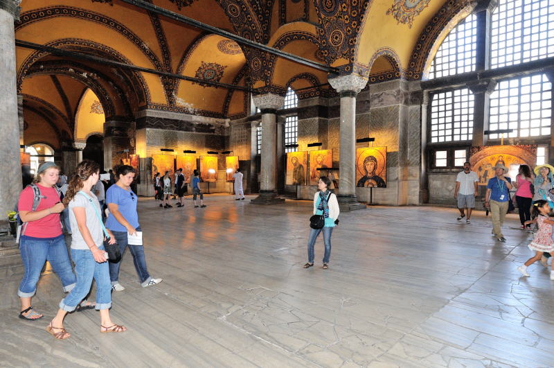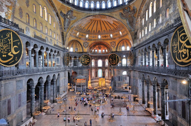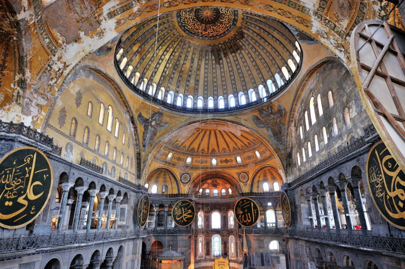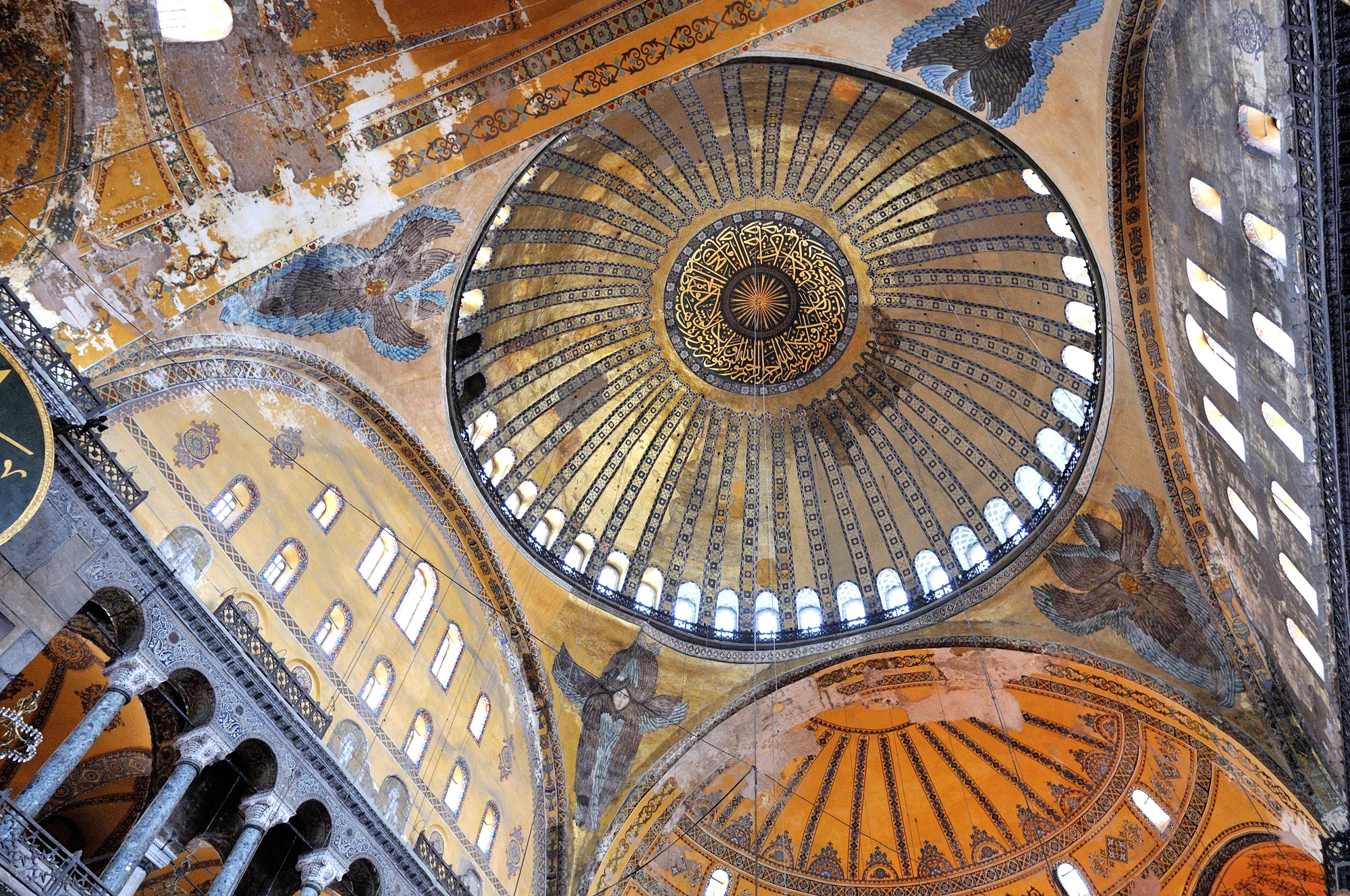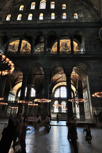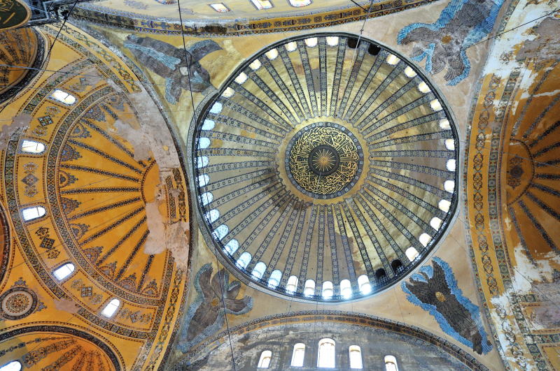 | 中央身廊の天井全景 (15:10) 主ドームと前後に2つの半ドーム。 主ドームは、直径31m、高さ56m。 よく見ると、ドーム周辺に歪みが見られる。 過去の度重なる崩壊で、修復が及ばなかった部分かも?。 因みに、ドーム建築の歴史は古く、真のドーム建築技術を使い泥煉瓦でドームを建築した例は、ハラフ文化(紀元前6100年から5400年ごろ)とウバイド文化(紀元前5300年から4000年ごろ)のメソポタミアのテル・アルパチヤに見られた。 ローマ時代にドームを記念碑的に建築するようになるまで、中東では貧しい人々の住居として小型の持ち送り積みのドームを普通に使っていたと見られている。 MAPLay. 1 g |
