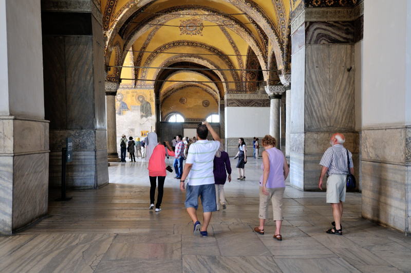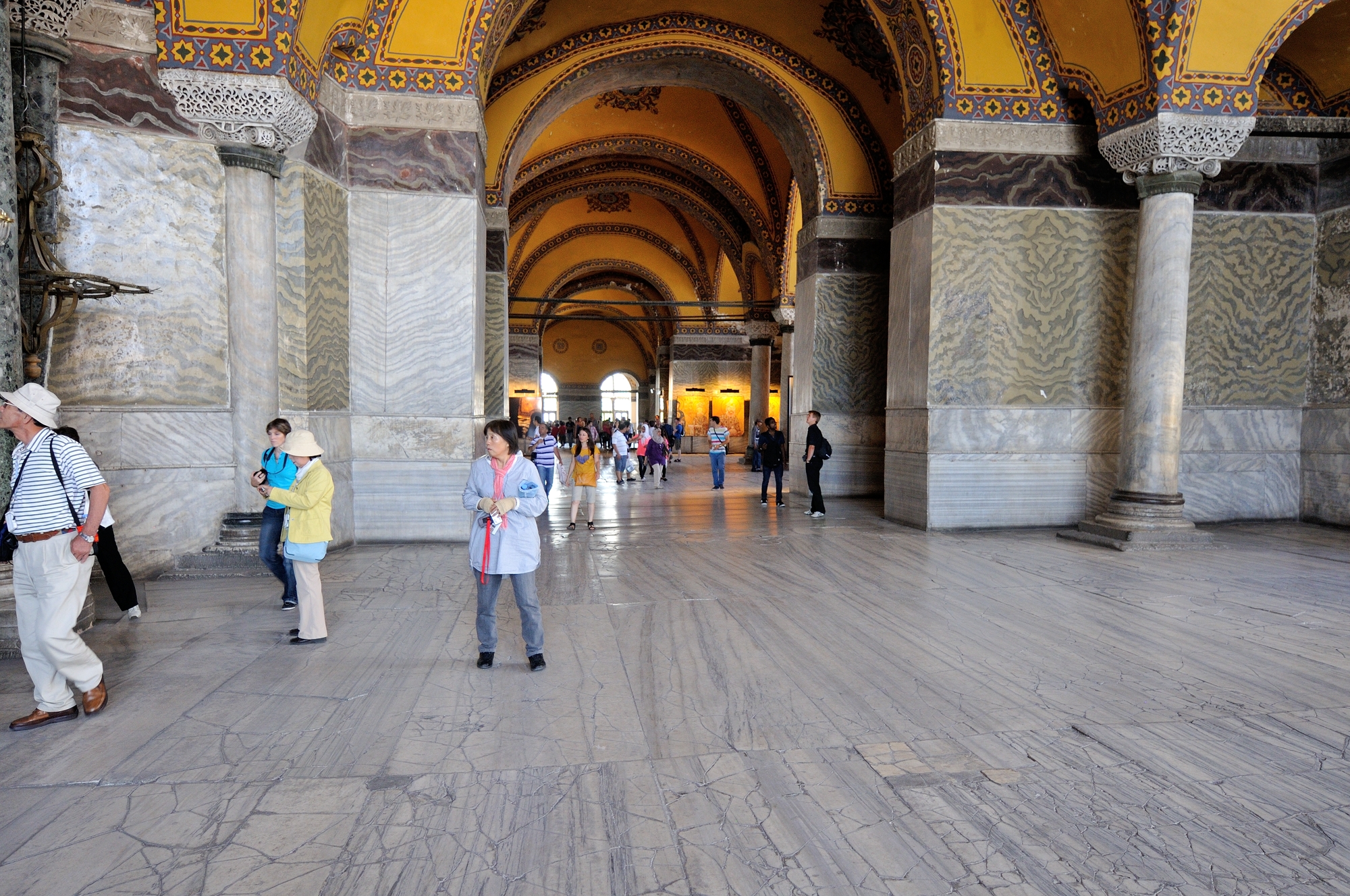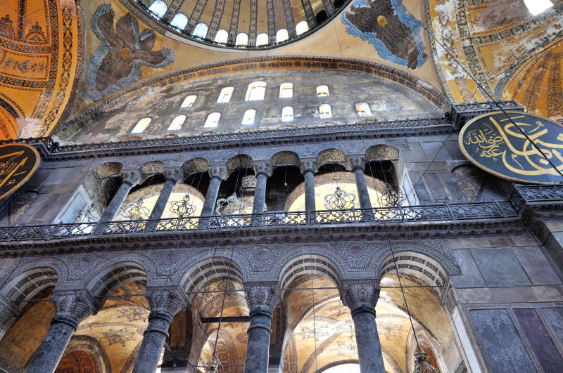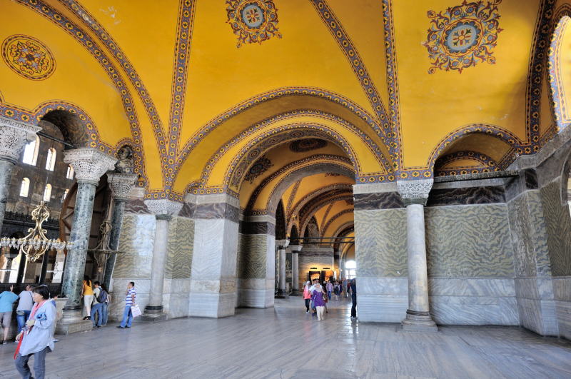 | 左側廊 (15:25) 身廊壁には数人の主教を表すパネルが残っている。 (黄色の壁面下端) (階上廊のモザイク配置 右階上廊から左側廊を見る。 左の花押 (トゥグラ) [Tughra] は、"アリ" [Ali bin Abi Thalib] 、右は "オマール" [Osman bin Affan] 。 ここで使われている柱は、アルテミス神殿にあった127本の柱の内、105本がここに運ばれ使用されている。 MAPLay. 1 g |