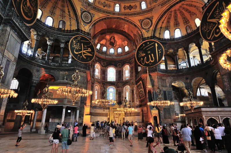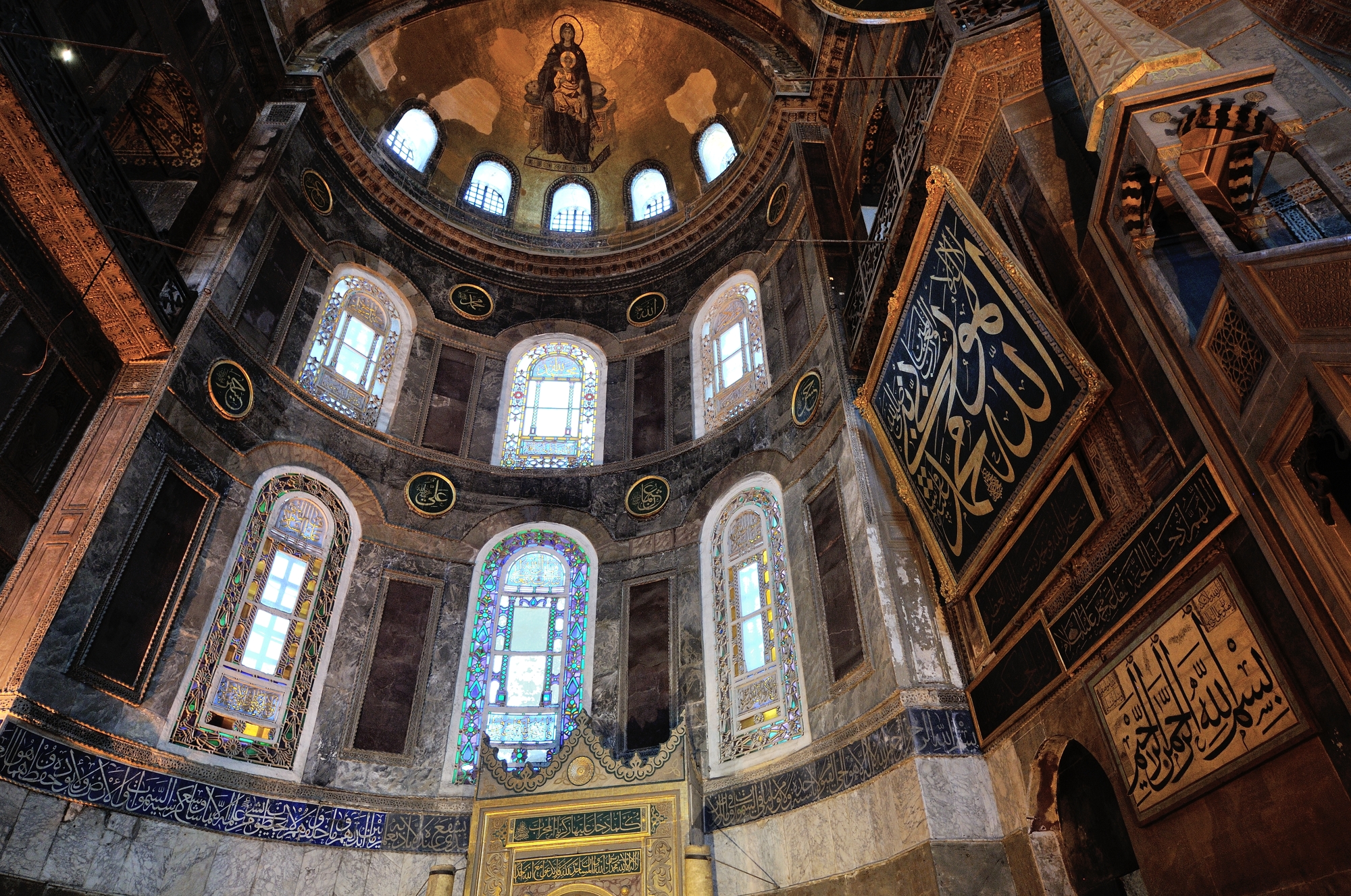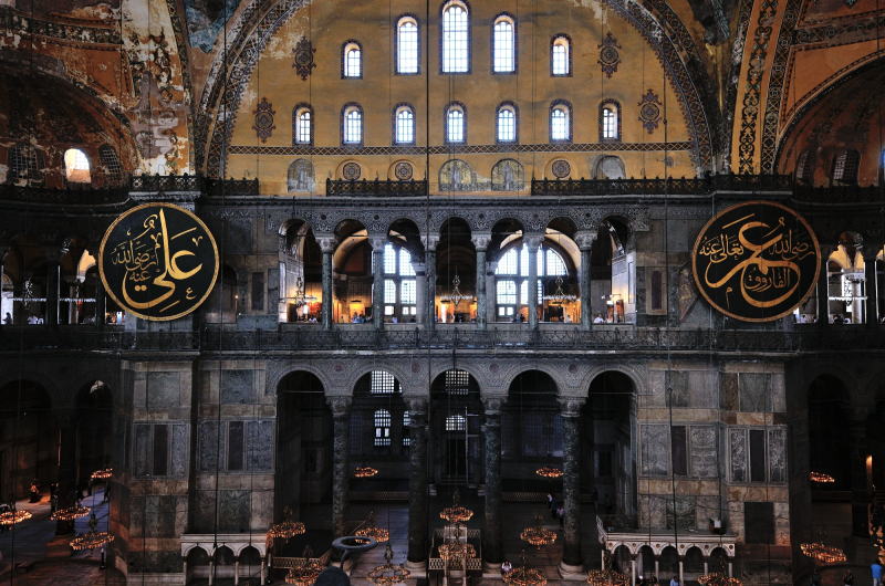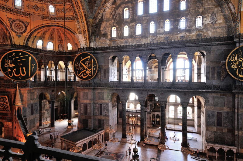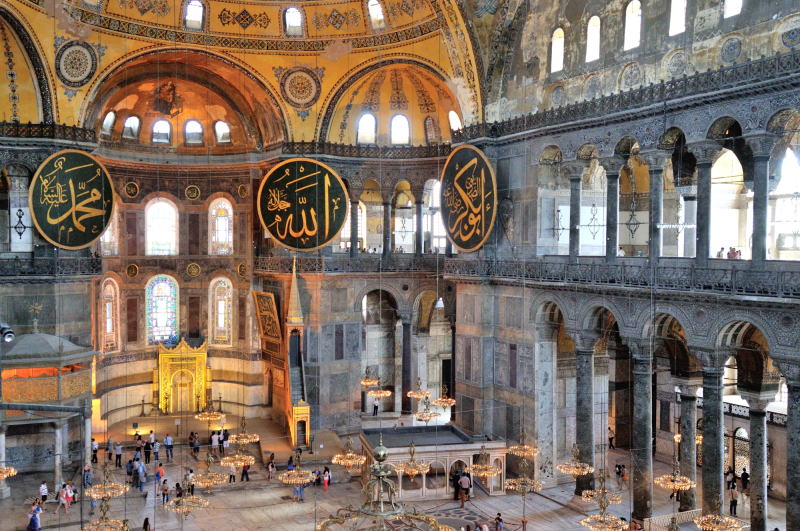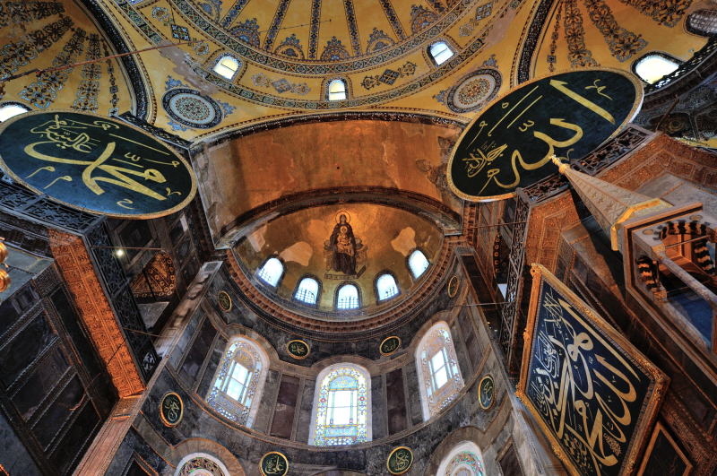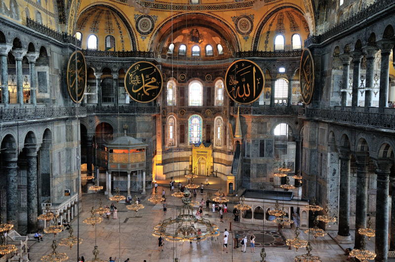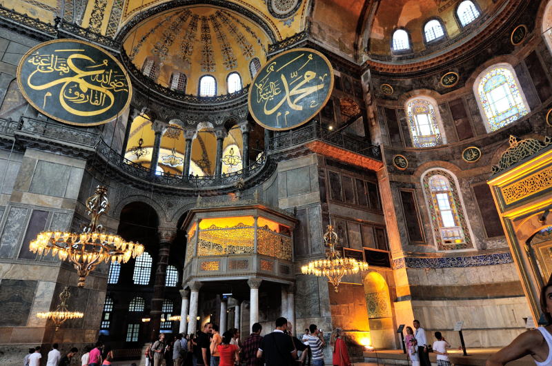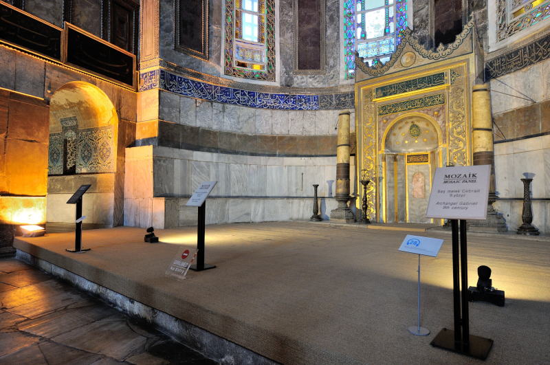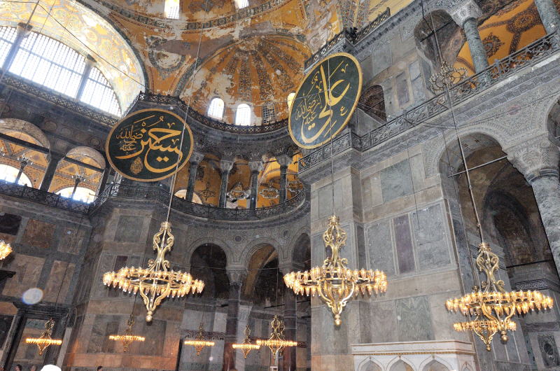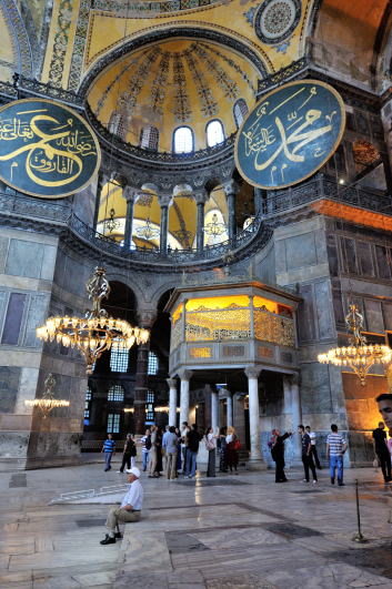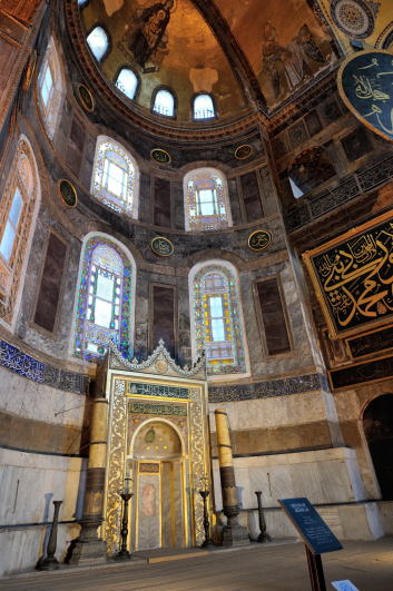 | 中央身廊全景 (15:16) 大聖堂からモスクに転用するにあたり、十字架等は取り外され、礼拝の方向である聖都メッカの方角を示すミフラーブと呼ばれる壁龕がすえられ、その右には、大理石で造られたミンバルと呼ばれる説教壇が据えられている。 上方の濃緑色の円い額は、1847 ~ 49年の改修の際に加えられたもので、全八面あり、その内、四つが見えている。 書家ムスタファ・イゼット [Kazasker Mustafa İzzet Efendi] の手になり、金字で、左からカリフ "オマール" [Ömer bin Hattab] 、 予言者 "ムハンマド"[Muhammad] 、イスラムの唯一神 "アッラー" [Allah] 、初代カリフ "アブー・バクル" [Ebu Bekir] の名が書かれた花押。 MAPLay. 1 g |