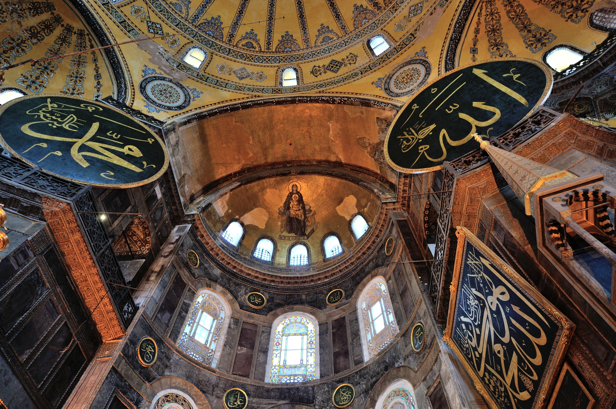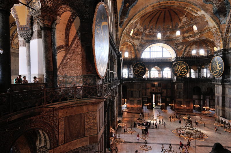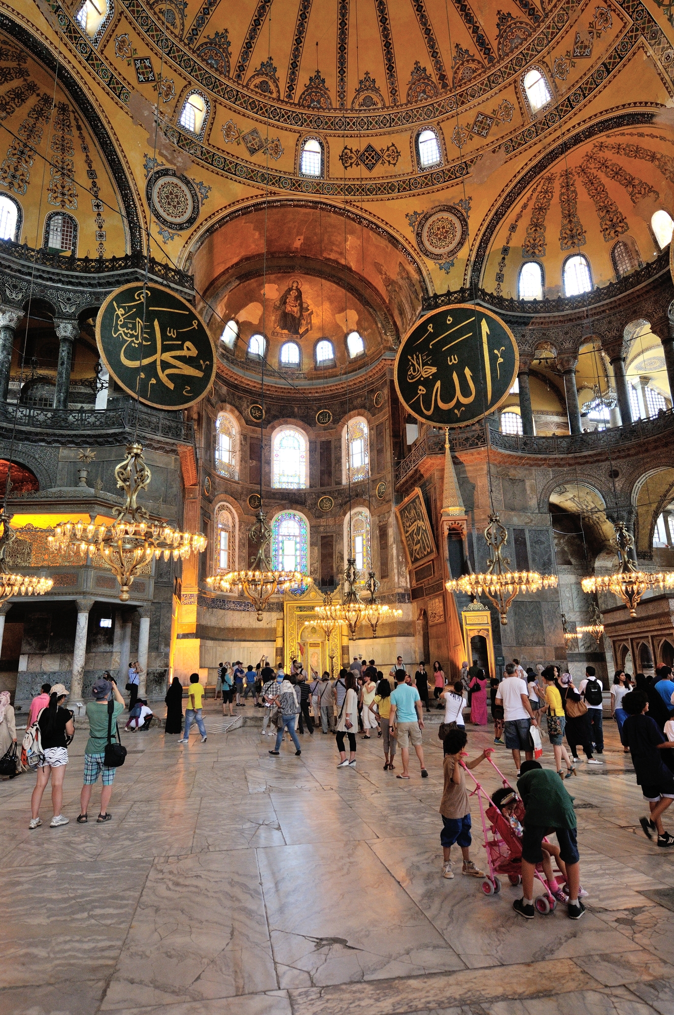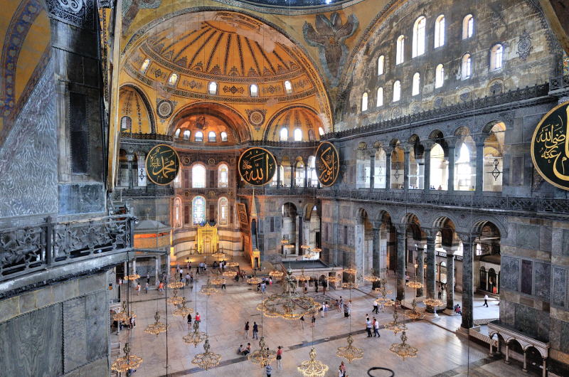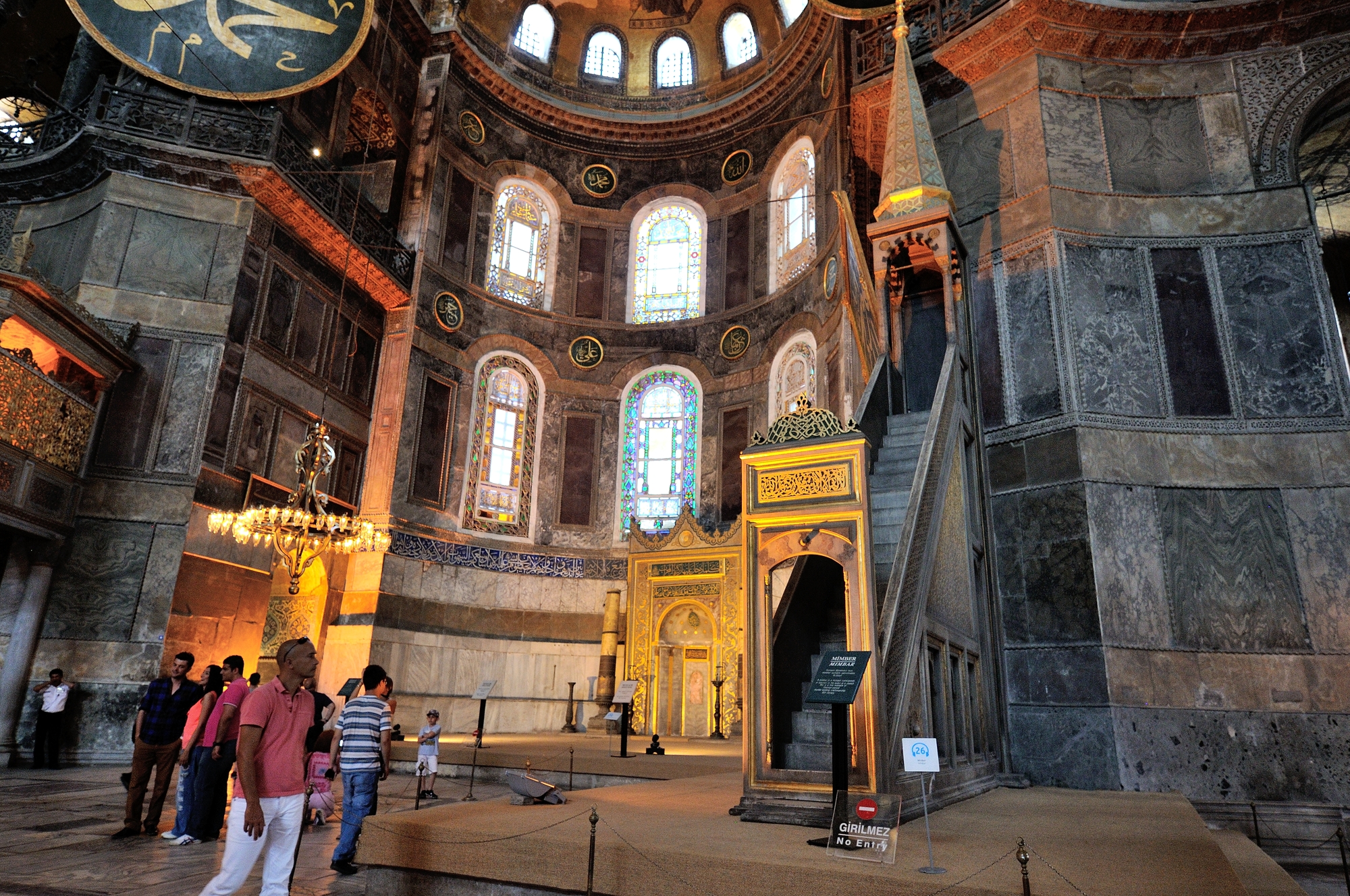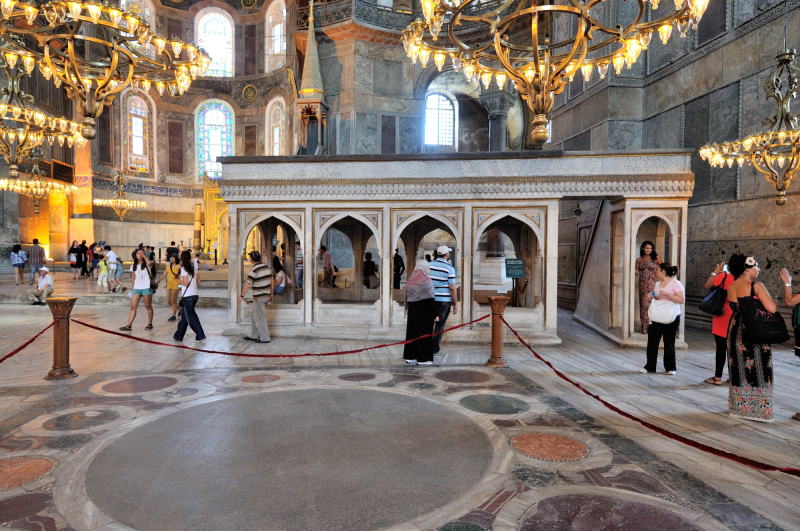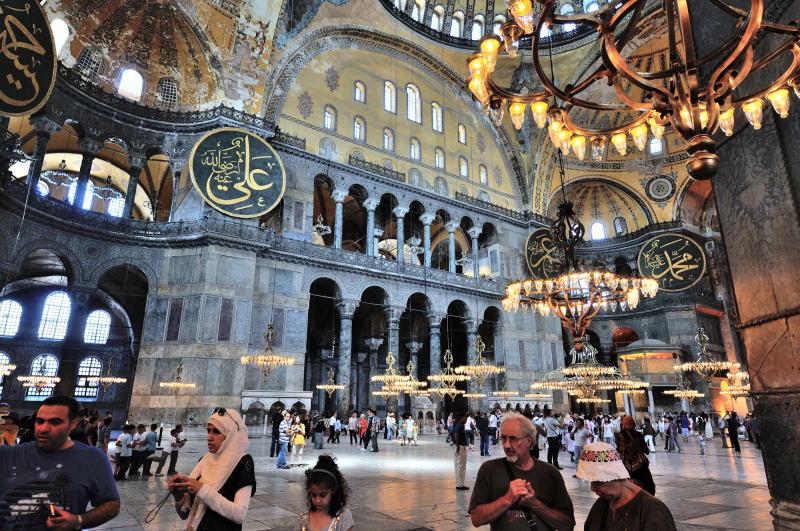 | 中央身廊全景 (15:16) 大聖堂からモスクに転用するにあたり、十字架等は取り外され、礼拝の方向である聖都メッカの方角を示すミフラーブと呼ばれる壁龕がすえられ、その右には、大理石で造られたミンバルと呼ばれる説教壇が据えられている。 上方の濃緑色の円い額は、1847 ~ 49年の改修の際に加えられたもので、全八面あり、その内、四つが見えている。 書家ムスタファ・イゼット [Kazasker Mustafa İzzet Efendi] の手になり、金字で、左からカリフ "オマール" [Ömer bin Hattab] 、 予言者 "ムハンマド"[Muhammad] 、イスラムの唯一神 "アッラー" [Allah] 、初代カリフ "アブー・バクル" [Ebu Bekir] の名が書かれた花押。 MAPLay. 1 g |