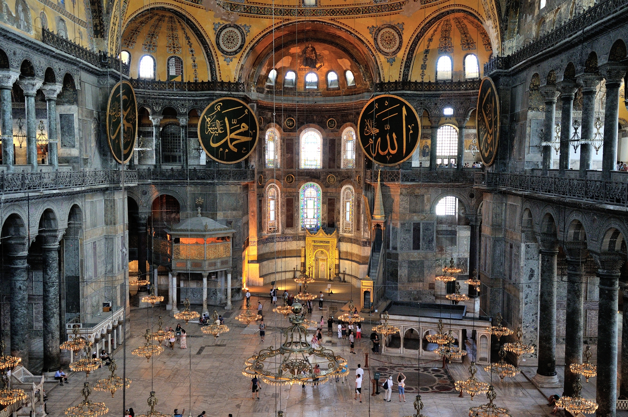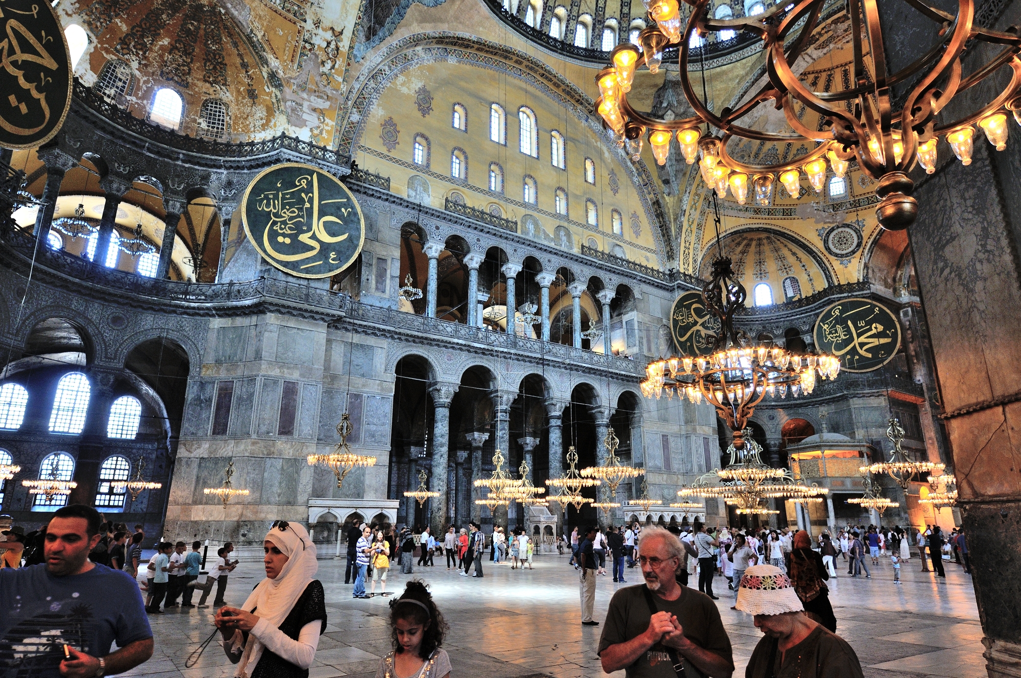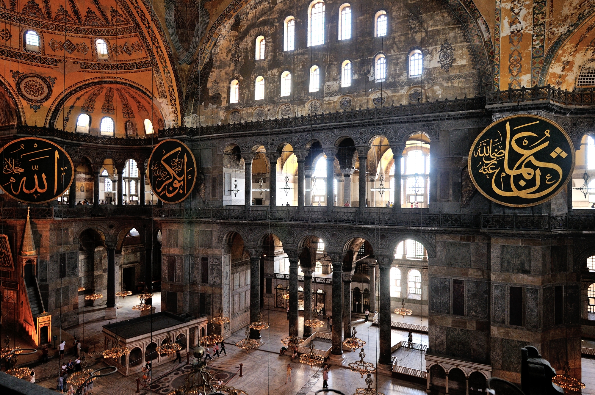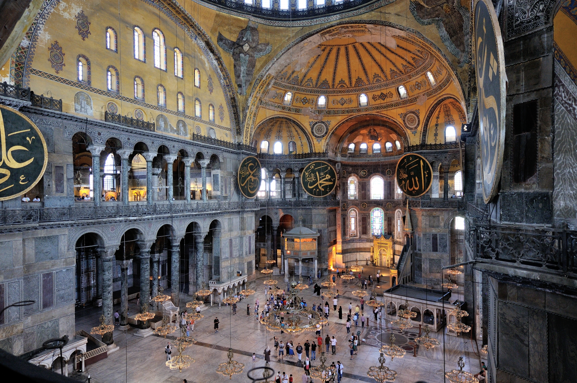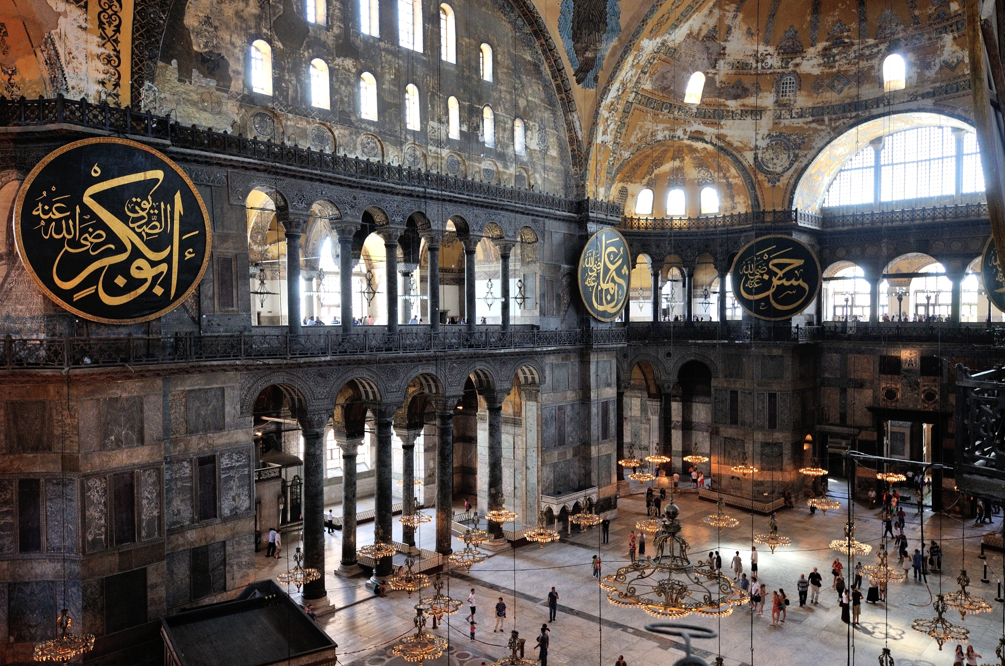 | 中央身廊全景 (15:16) 大聖堂からモスクに転用するにあたり、十字架等は取り外され、礼拝の方向である聖都メッカの方角を示すミフラーブと呼ばれる壁龕がすえられ、その右には、大理石で造られたミンバルと呼ばれる説教壇が据えられている。 上方の濃緑色の円い額は、1847 ~ 49年の改修の際に加えられたもので、全八面あり、その内、四つが見えている。 書家ムスタファ・イゼット [Kazasker Mustafa İzzet Efendi] の手になり、金字で、左からカリフ "オマール" [Ömer bin Hattab] 、 予言者 "ムハンマド"[Muhammad] 、イスラムの唯一神 "アッラー" [Allah] 、初代カリフ "アブー・バクル" [Ebu Bekir] の名が書かれた花押。 MAPLay. 1 g |