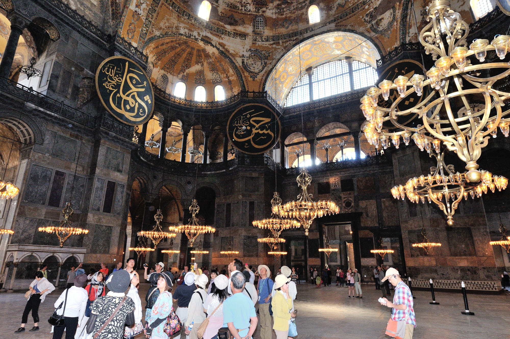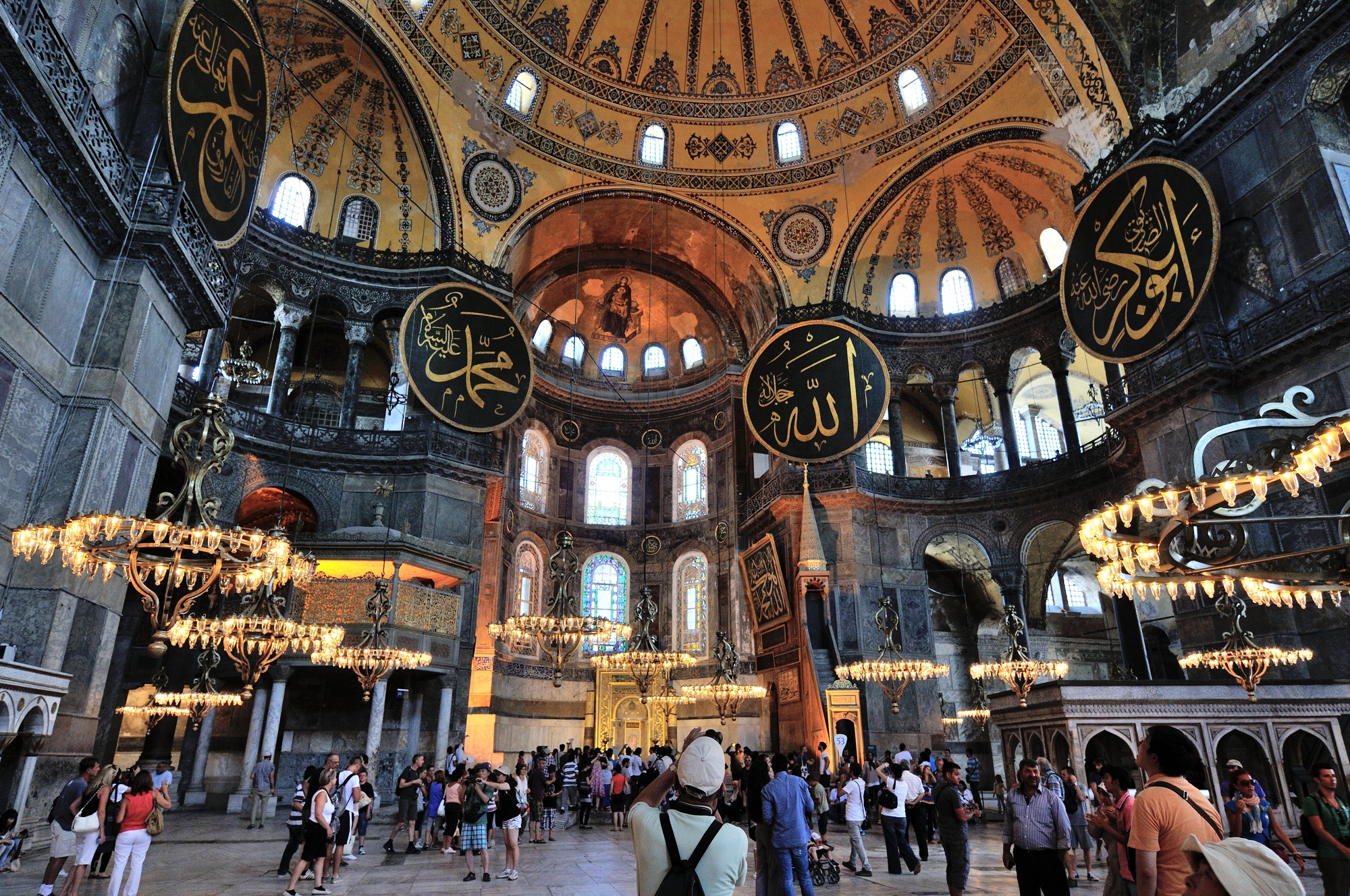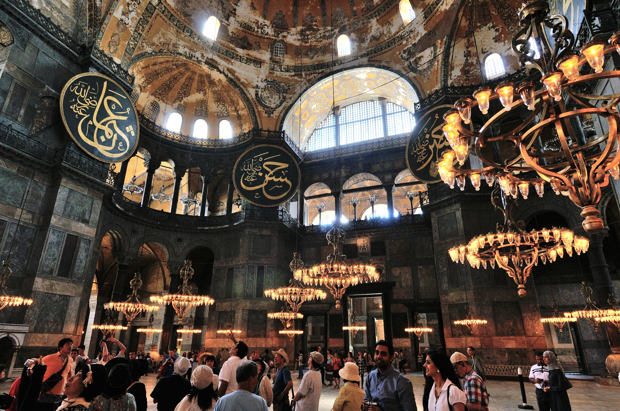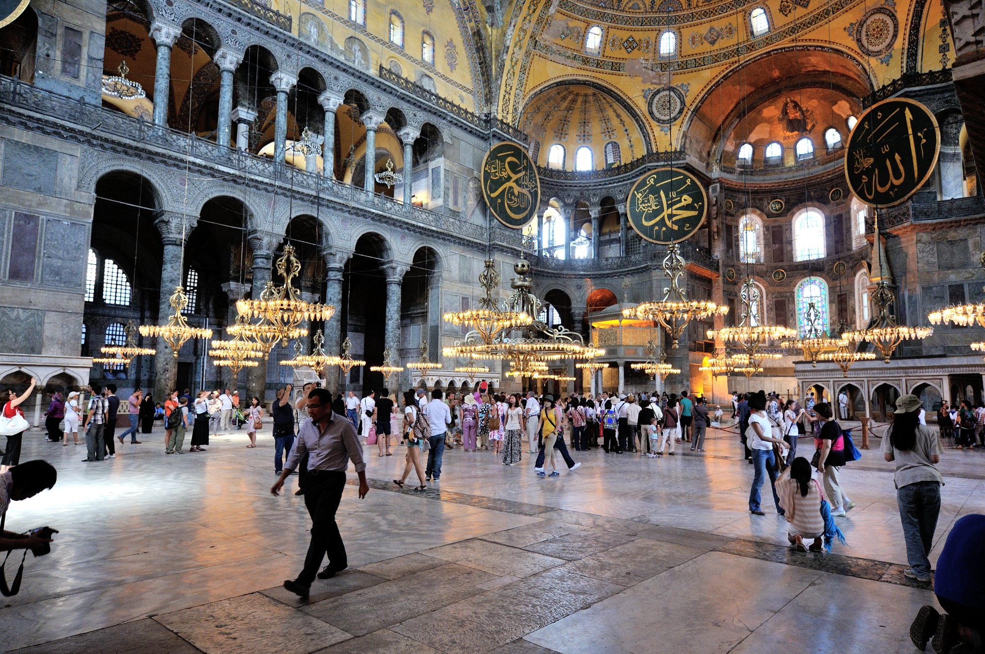 | 中央身廊全景 (15:16) 大聖堂からモスクに転用するにあたり、十字架等は取り外され、礼拝の方向である聖都メッカの方角を示すミフラーブと呼ばれる壁龕がすえられ、その右には、大理石で造られたミンバルと呼ばれる説教壇が据えられている。 上方の濃緑色の円い額は、1847 ~ 49年の改修の際に加えられたもので、全八面あり、その内、四つが見えている。 書家ムスタファ・イゼット [Kazasker Mustafa İzzet Efendi] の手になり、金字で、左からカリフ "オマール" [Ömer bin Hattab] 、 予言者 "ムハンマド"[Muhammad] 、イスラムの唯一神 "アッラー" [Allah] 、初代カリフ "アブー・バクル" [Ebu Bekir] の名が書かれた花押。 MAPLay. 1 g |
