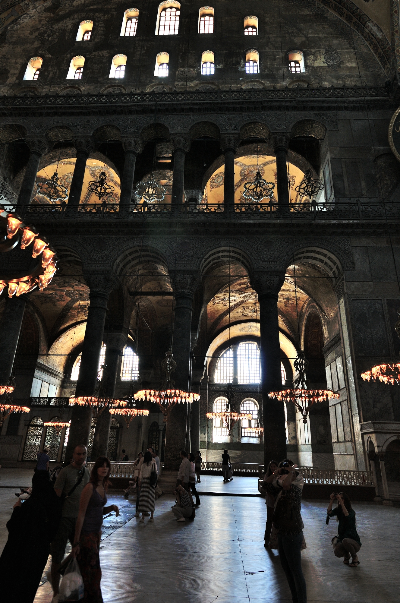 | 中央身廊全景 (15:44) アヤソフィアは537年に完成したとき世界最大の教会で、1520年にセビリア大聖堂が完成するまで、世界一の座を守り続けた。 最大の中央のドームは幅が31.24m、床面からの頂上の高さが55.6mで、幅はパンテオンより4分の1狭いが、高さは4分の1高い。パンテオンとは異なり、頂上に眼窓はなく、ドームの基部に環状に窓が並んでいる。 さらに中央ドームの両側に同じような半円ドームがある。 MAPLay. 1 g |