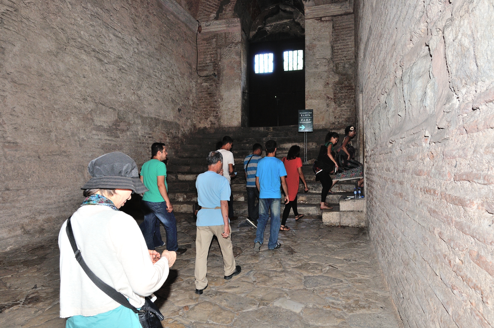 | アヤ・ソフィアの階上廊へのスロープ (15:21) 狭いスロープを折り返して登る階上廊は、嘗て女性が典礼に参加する場であった。 皇妃テオドラもまた、ここから落成式に臨んだという。 MAPLay. 1 g |