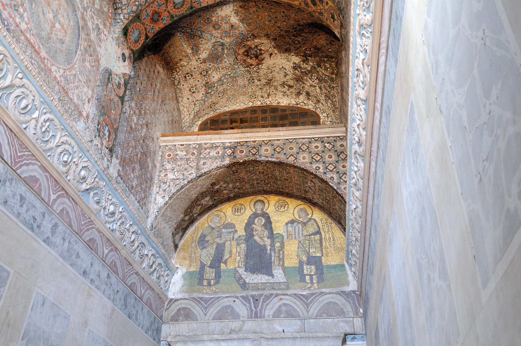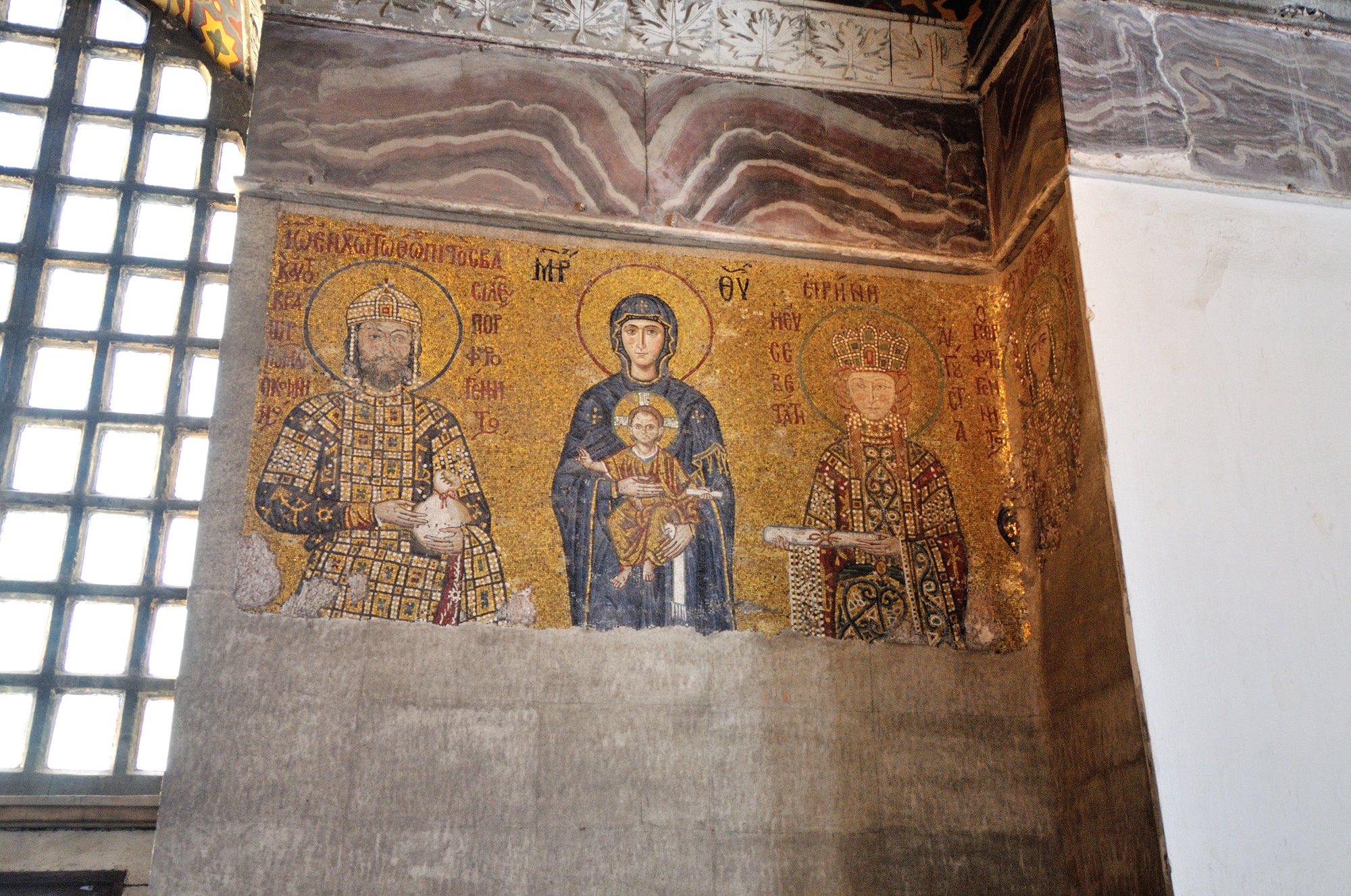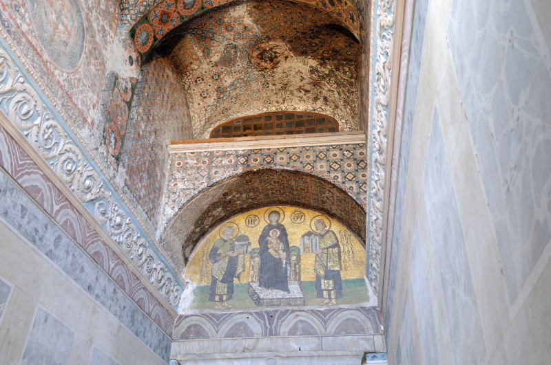 | 右階上廊 (皇族専用の空間) (15:28) 「聖母子に寄進をする皇帝ヨハネス2世コムネノス、皇妃イリニと皇子アレクシオス」 のモザイク画。 (12世紀の作品) この大聖堂は、ビザンチン特有のモザイクによって壁面の多くが飾られていた。 オスマンの支配下で、漆喰の下に塗り込められた、これらのモザイクは、トルコ共和国時代 (初代大統領アタチュルク) に入ってから、1933 ~ 34年にかけての大修復で昔の姿をほぼとりもどした。 トルコ人の寛容さ、寛大さは、メヴラーナの教えを受け継いでいるのかも知れない。 (階上廊のモザイク配置 MAPLay. 1 g |