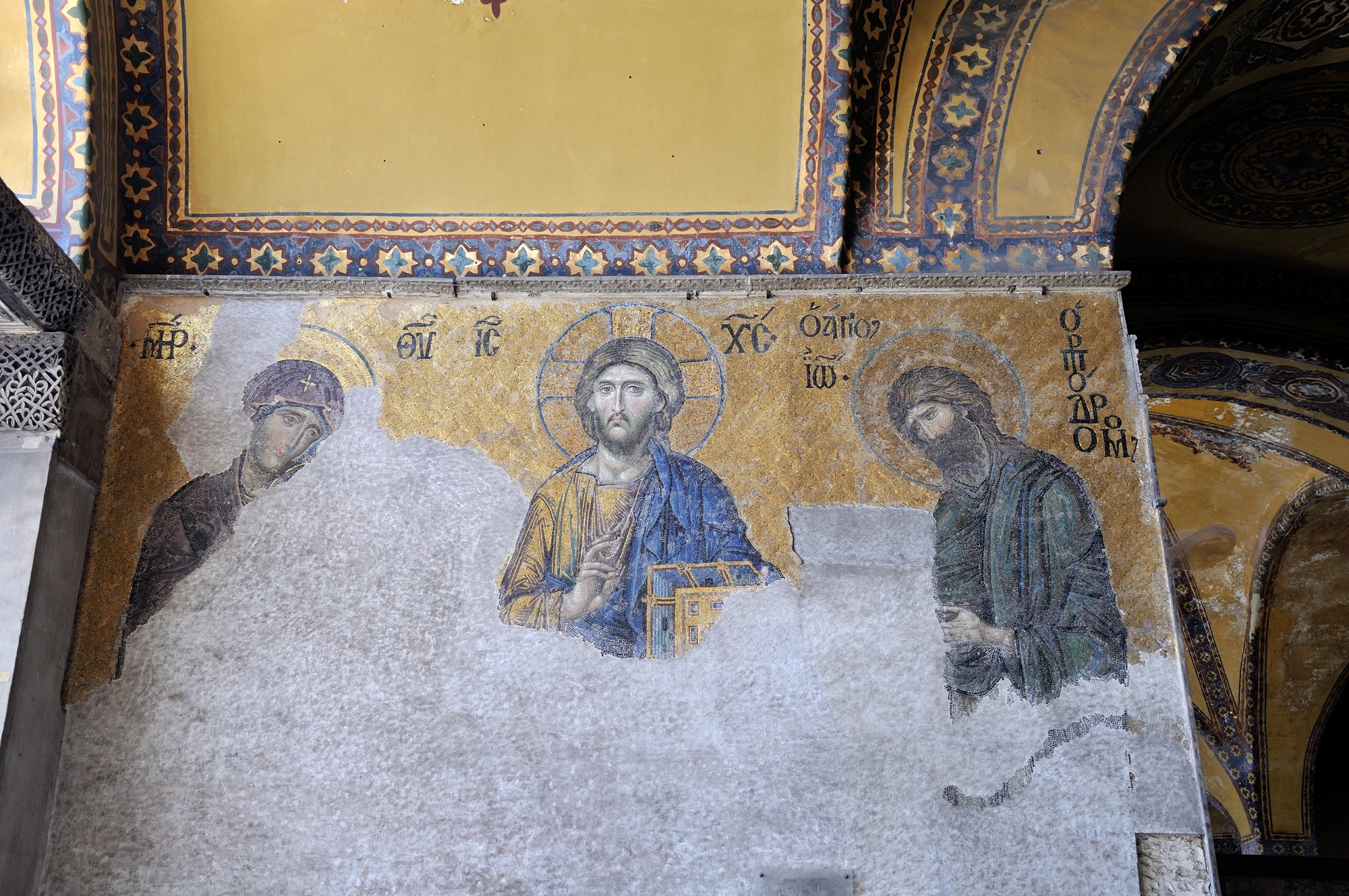 | 右階上廊 (皇族専用の空間) (15:29) 「デイシス」*のモザイク・イコン (13世紀頃の作品) ハリストス(キリスト)は玉座に座り、聖書を持ち、傍らに生神女マリヤと前駆授洗イオアン (洗礼者ヨハネ) が立った姿で描かれている。 「デイシス」 は、直接にはラテン帝国からの首都奪回をキリストに感謝し、今後の庇護を願うものであったが、ビザンチン人が願った幸福とは、現世のものではなく、彼岸に属するものであった。(階上廊のモザイク配置 MAPLay. 1 g * デイシスはギリシア語で、日本語では 「嘆願」 「懇願」 を意味する。 |
