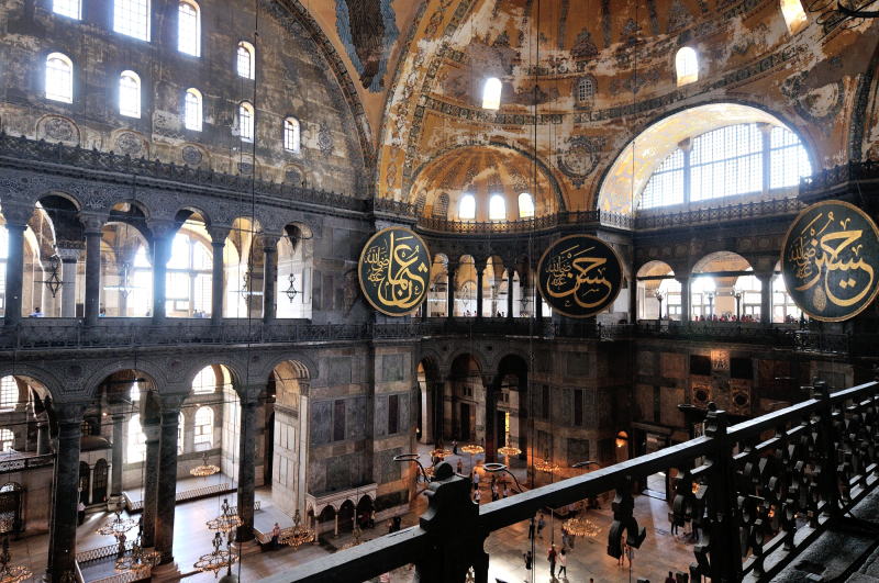 | 階上廊から見る中央身廊全景 (15:23) 天井部は、前方から半ドーム、主ドーム、半ドームと並んでいる。 2階に掛かっている花押 (トゥグラ) [Tughra] は、左端から "アリ" [Ali bin Abi Thalib] 、"オマール" [Ömer bin Hattab] 、"ムハンマド" [Muhammad] 、"アッラー" [Allah] 、"アブー・バクル" [Ebu Bekir] 、"オスマン" [Osman bin Affan] の順に並んでいる。 写真には、写っていないが、入口側のハサン [Hasan ibn Ali] と フセイン [Husayn ibn Ali] を加えて、計8人のイスラム聖人の名前が掲げられている。 MAPLay. 1 g |