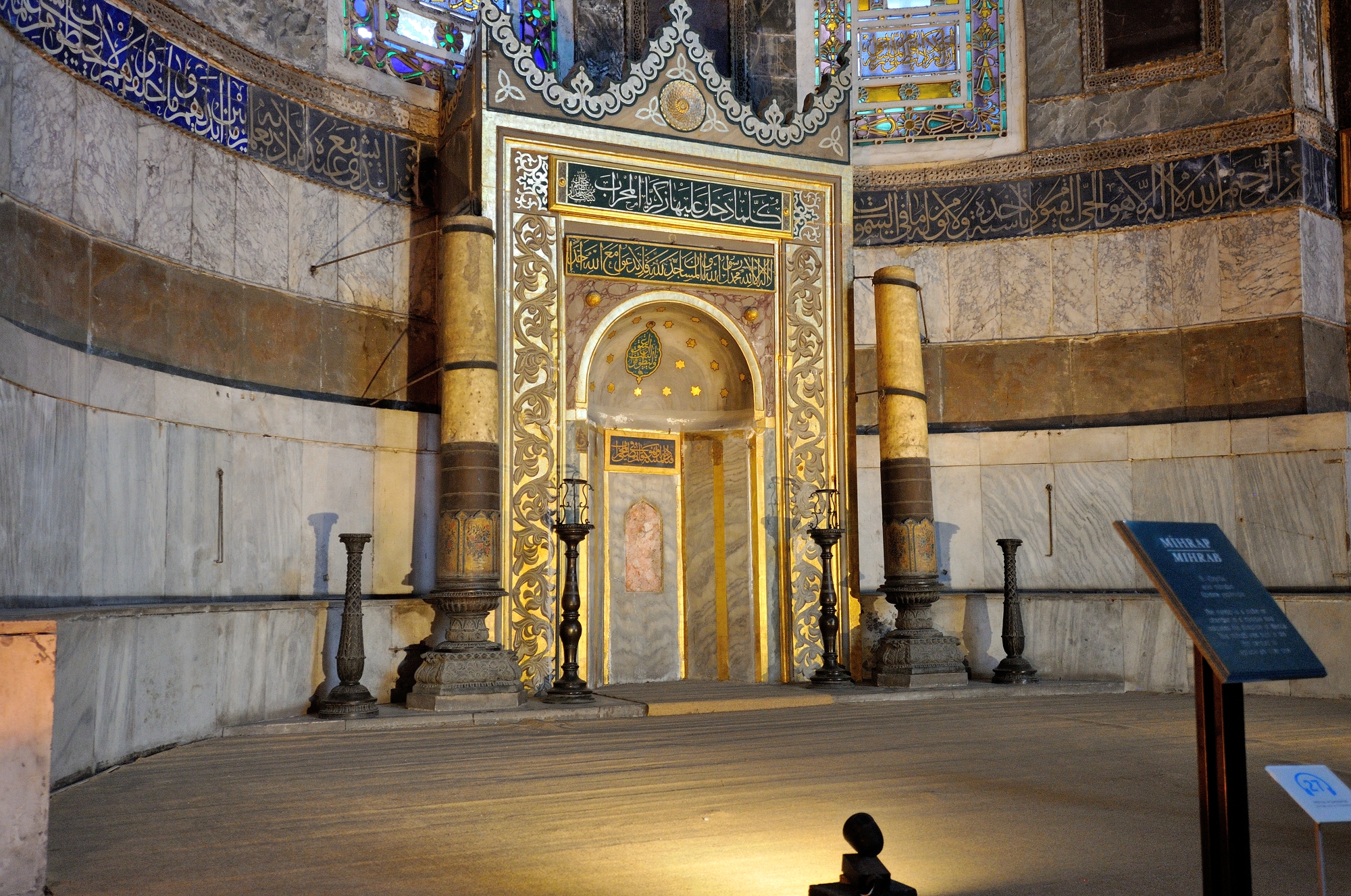 | 中央身廊 (15:12) 大聖堂からモスクに転用するにあたり、十字架等は取り外され、礼拝の方向である聖都メッカの方角を示すミフラーブと呼ばれる壁龕がすえられ、その右には、大理石で造られたミンバルと呼ばれる説教壇が据えられている。 上方の濃緑色の円い額は、1847 ~ 49年の改修の際に加えられたもので、全八面あり、その内、四つが見えている。 書家ムスタファ・イゼット [Kazasker Mustafa İzzet Efendi] の手になり、金字で、左からカリフ "オマール" [Ömer bin Hattab] 、 予言者 "ムハンマド"[Muhammad] 、イスラムの唯一神 "アッラー" [Allah] 、初代カリフ "アブー・バクル" [Ebu Bekir] の名が書かれた花押。 MAPLay. 1 g |
