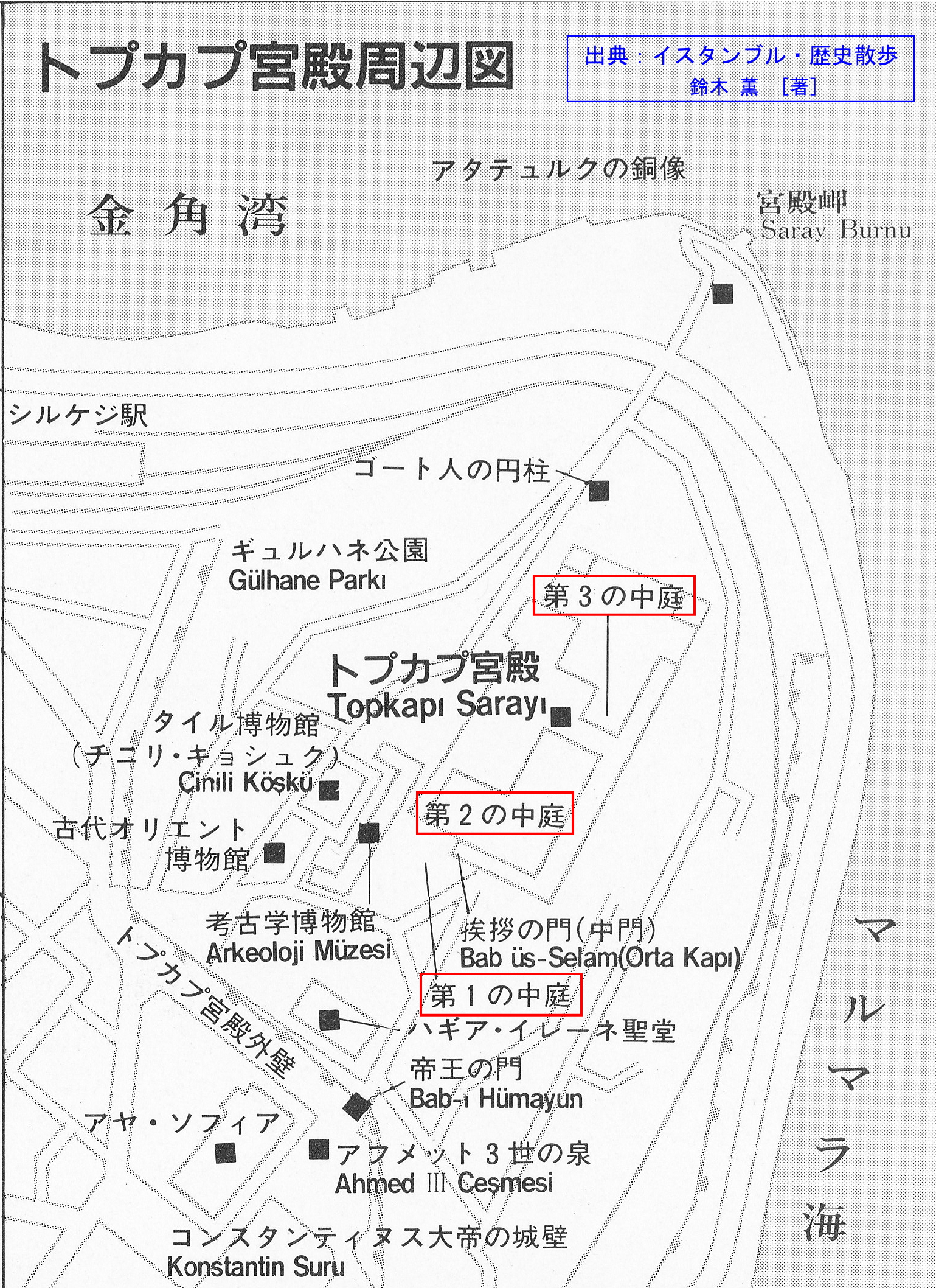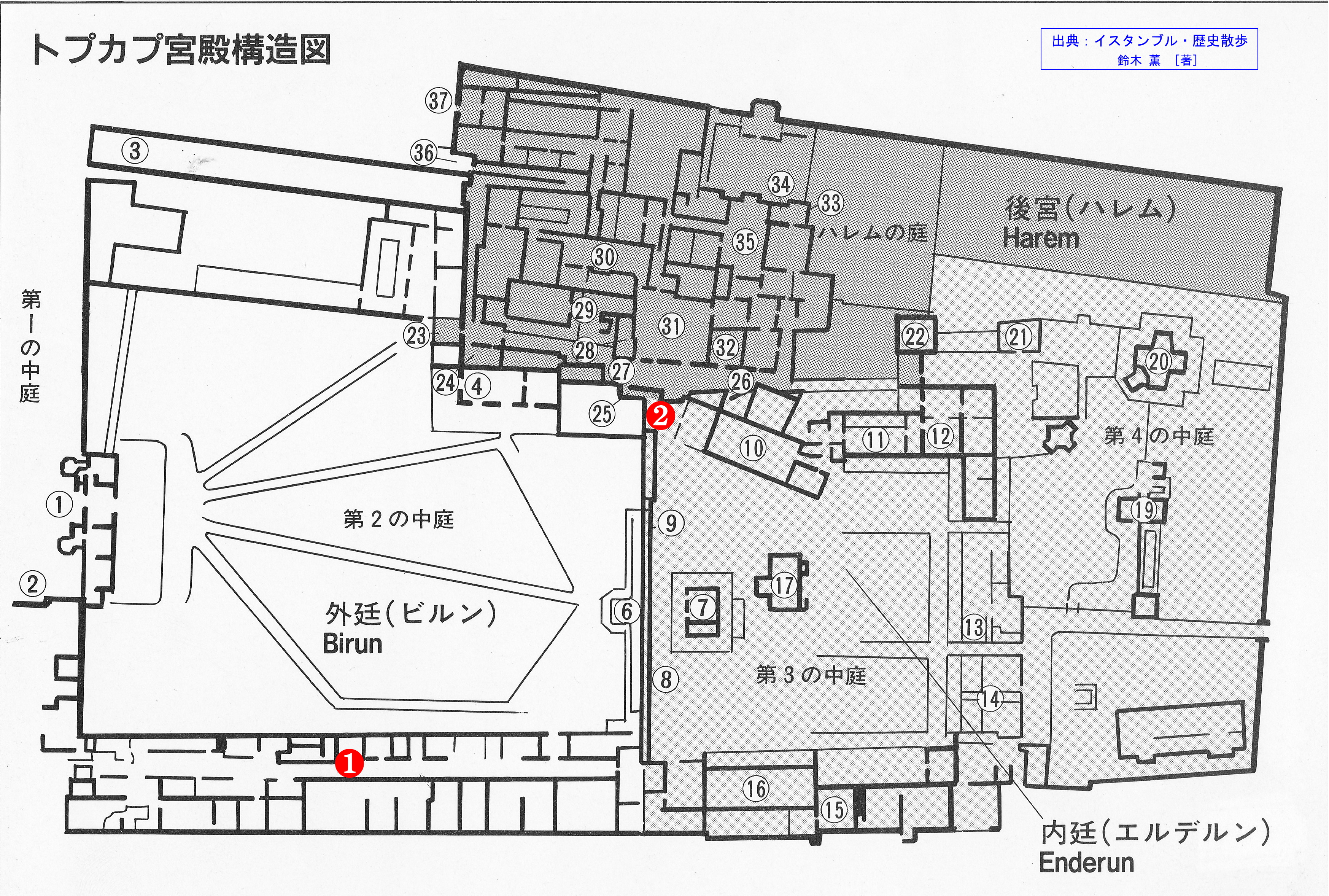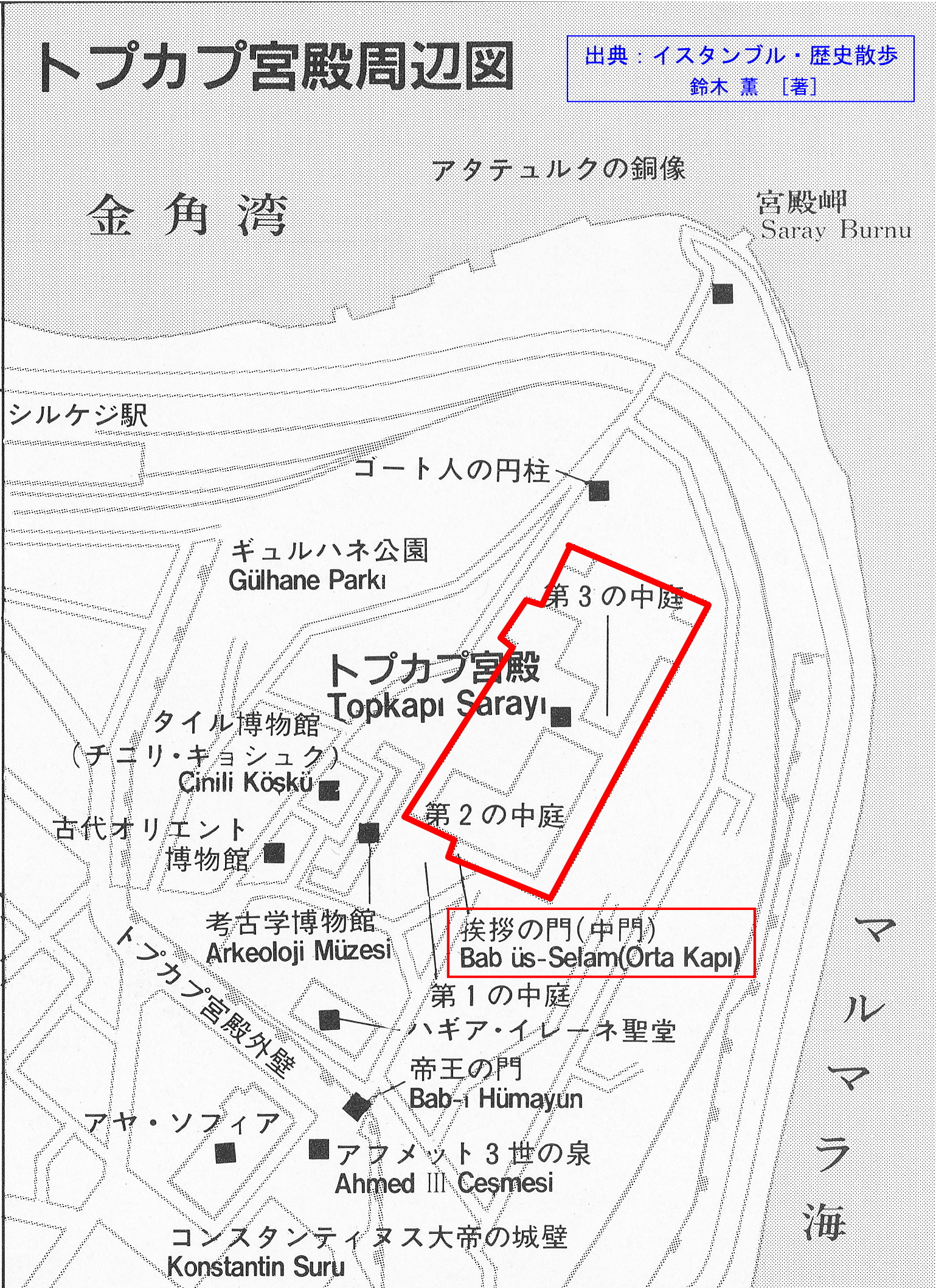| 挨拶の門 [Bâb-üs Selâm Kapısı] / 中門 [Orta Kapı] 第二の城壁で囲まれた部分が、トプカプト宮殿の本体を成す。 この城壁の門が 「挨拶の門」 、ないしは単に 「中門」 と呼ばれ、宮殿の本体は、外廷 [Birun] 、内廷 [ Enderun] 、後宮 [Harem] の3つの部分から構成されていた。 (下図参照) 「北北東」MAPLay. 1 p |