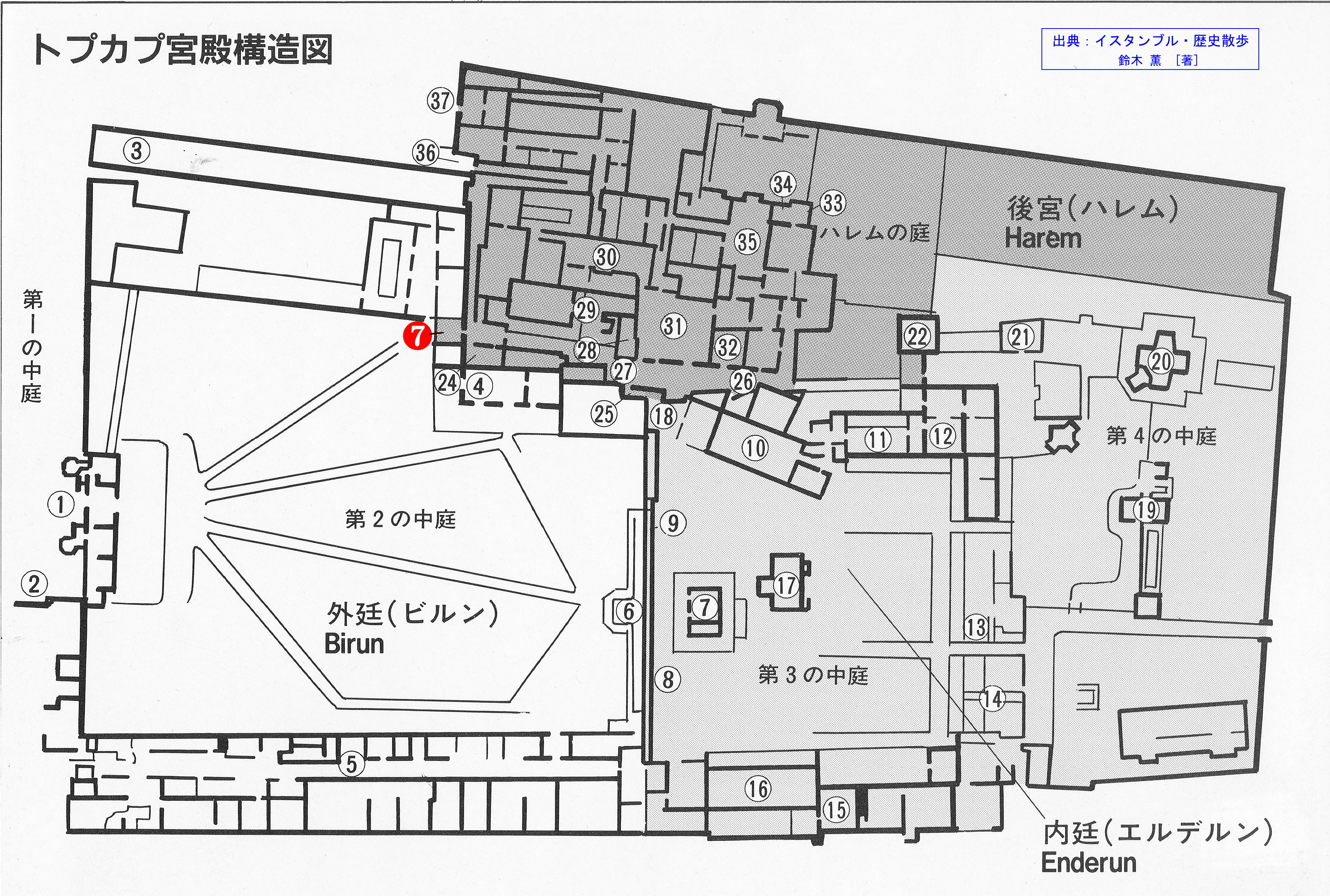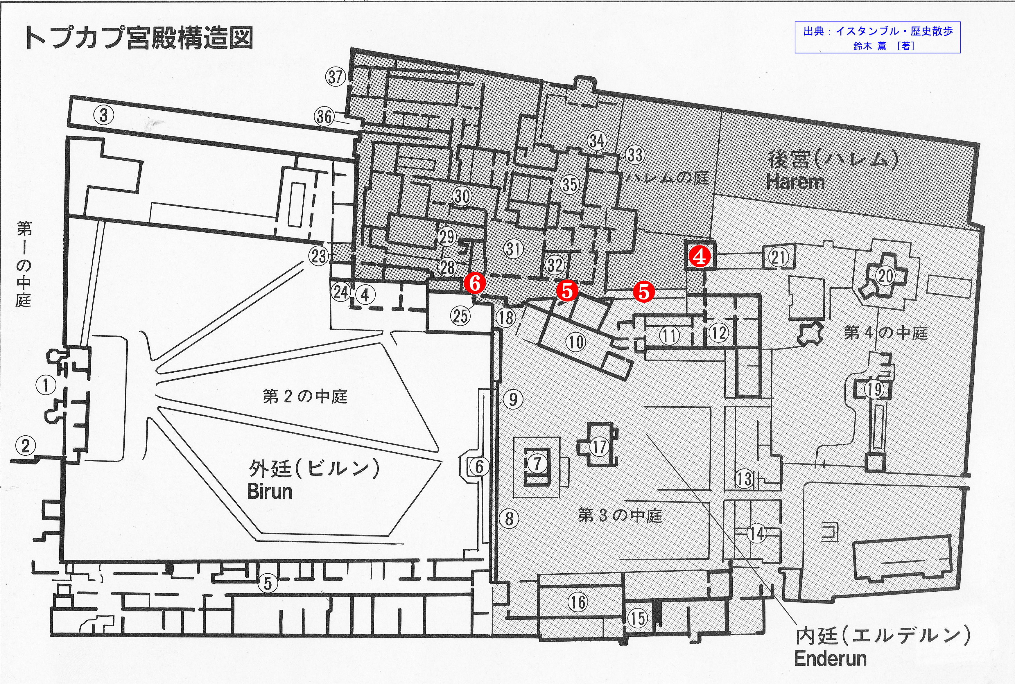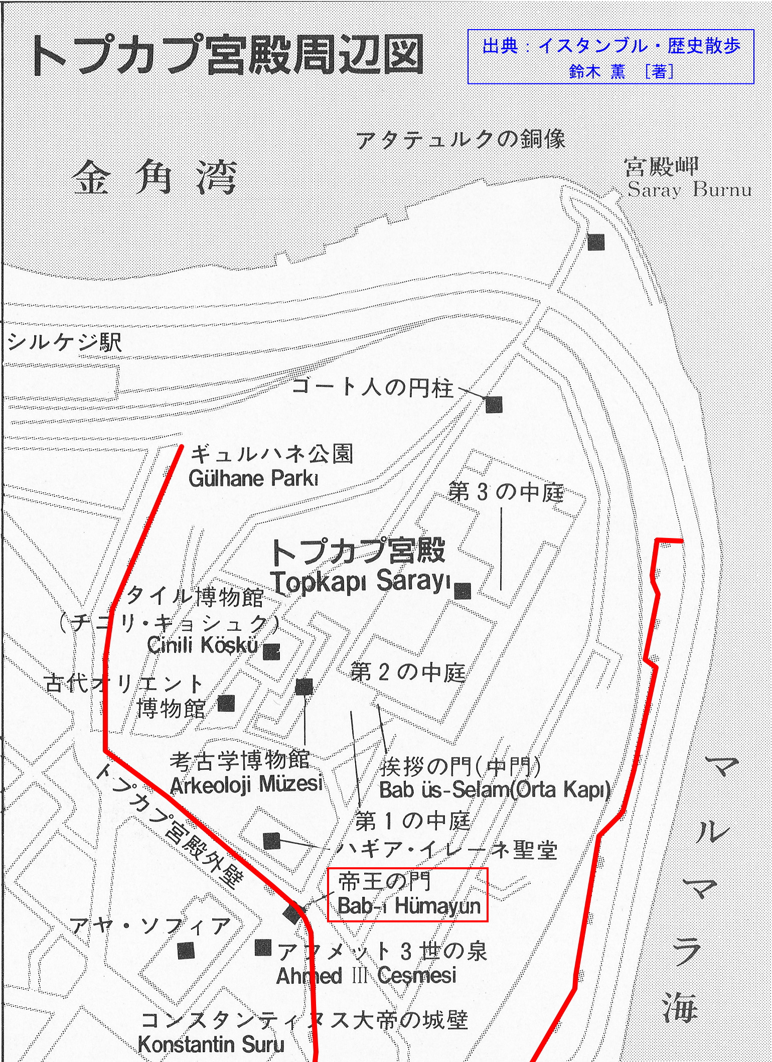 | 挨拶の門 [Bâb-üs Selâm Kapısı] / 中門 [Orta Kapı] 第二の城壁で囲まれた部分が、トプカプト宮殿の本体を成す。 この城壁の門が 「挨拶の門」 、ないしは単に 「中門」 と呼ばれ、宮殿の本体は、外廷 [Birun] 、内廷 [ Enderun] 、後宮 [Harem] の3つの部分から構成されていた。 (下図参照) 「北北東」MAPLay. 1 p |