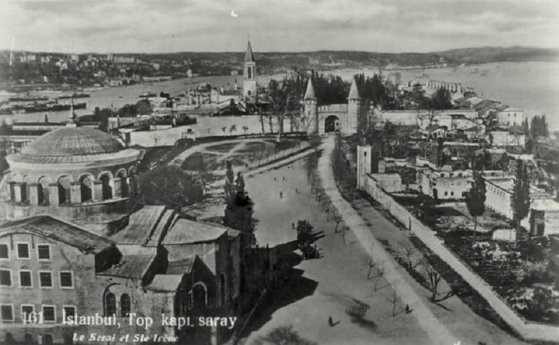 | 第一の中庭 [I. Avlu] 左下の建物は、ハギア・イレーネ聖堂。 前方の門は、挨拶の門。 (撮影年不明) 出典:istanbulium.net |
