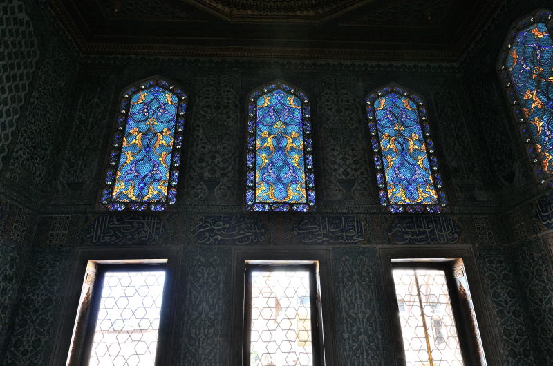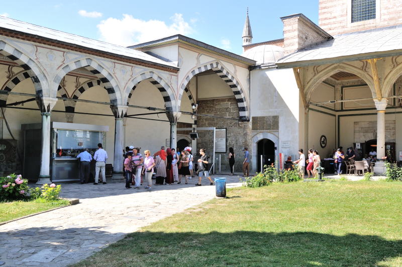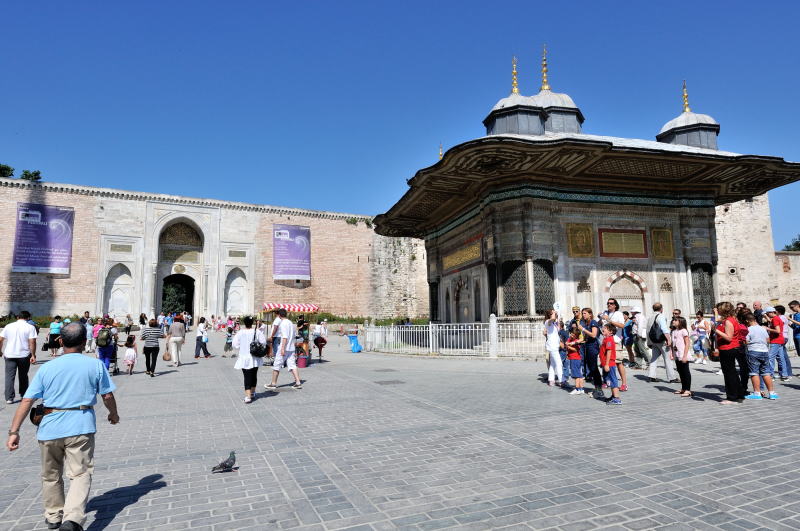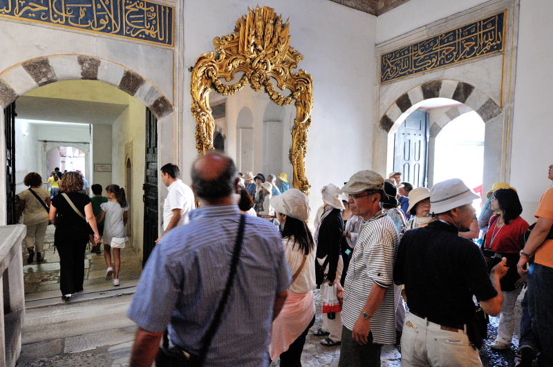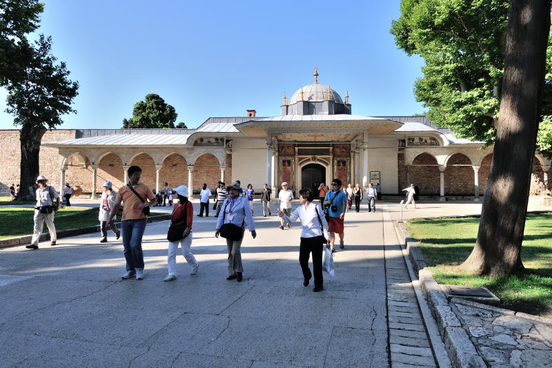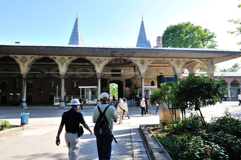 | 至福の門 [Bab-üs saade] (17:51) 外廷と内廷の境にある門で、この門をこえて中に進み得る者は、ごく限られていた。 この門の内側 (写真では向こう側) には、謁見の間がある。 ここでスルタンは、大宰相をはじめ、政府高官から上奏をうけた。 諸外国の大使たちも、ここで謁見した。 謁見の際には、大使たちは、玉座に座したスルタンの前にひれ伏し、その服の裾に接吻させられた。 「北北東」MAPLay. 2 P |