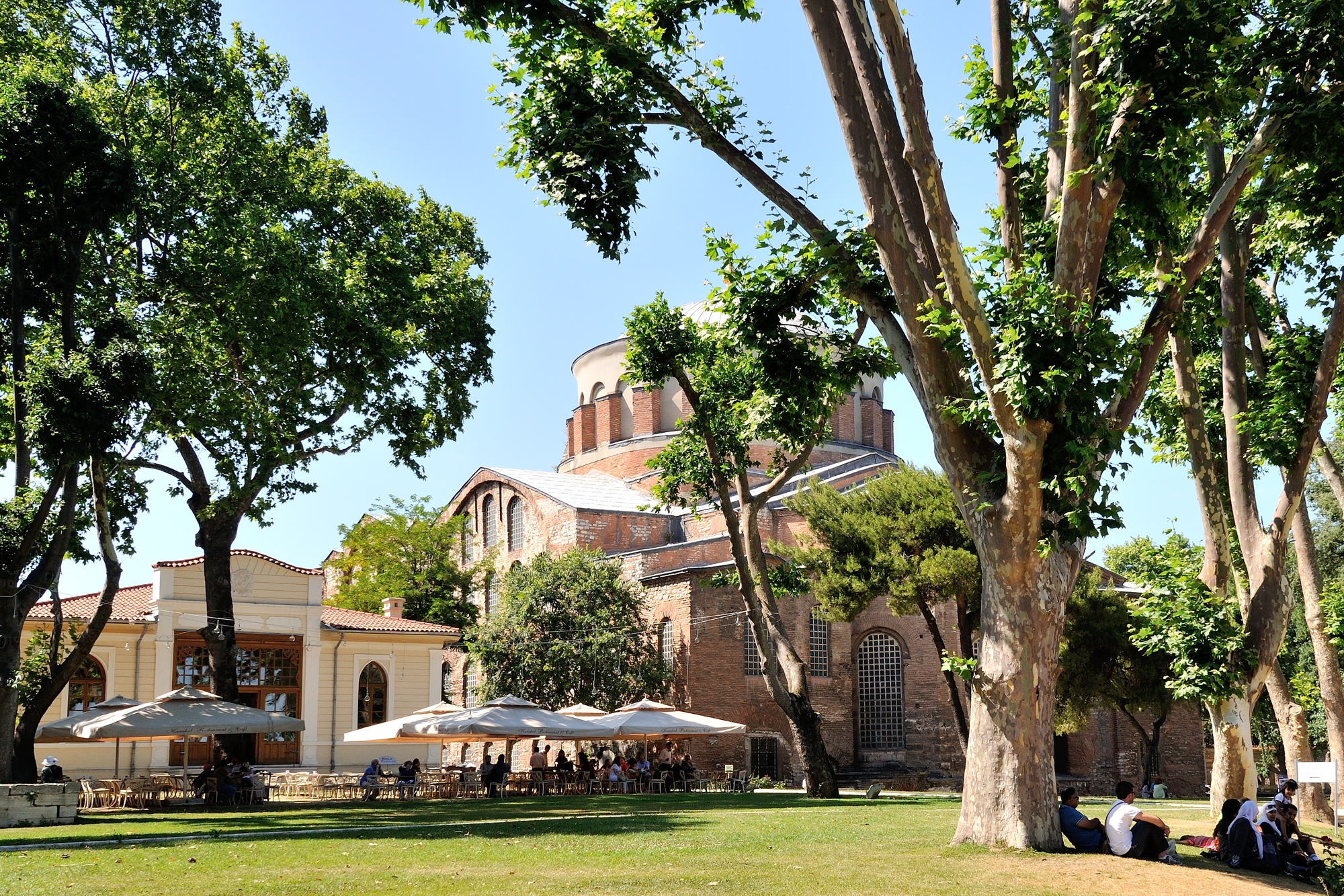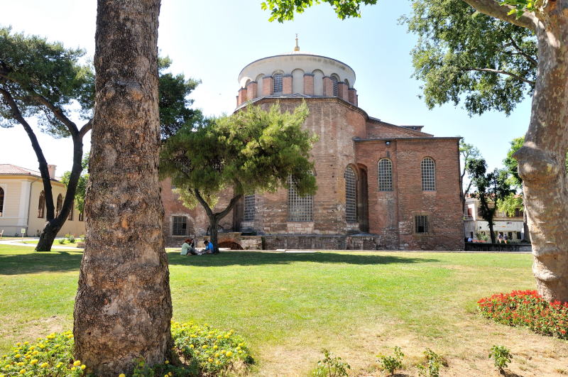 | ハギア・イレーネ聖堂 [Aya İrini] / 聖イレーネ博物館 アヤソフィア博物館同様、 聖イレーネ博物館 はもとは教会で、イスタンブールに建てられた最初の教会だった。 4世紀にコンスタンチヌス帝が建築を命じ建てられたハギア・イレーネは、532年に焼失し、後にユスチニアヌス帝によって再建された。 その後、740年に地震で損傷を受け、コンスタンティノス5世によって修復されている。 この建物は、キリスト教以前の寺院の敷地跡に建っている。 現在は、コンサートホールとして使われている。 「北西」MAPLay. 1 n |