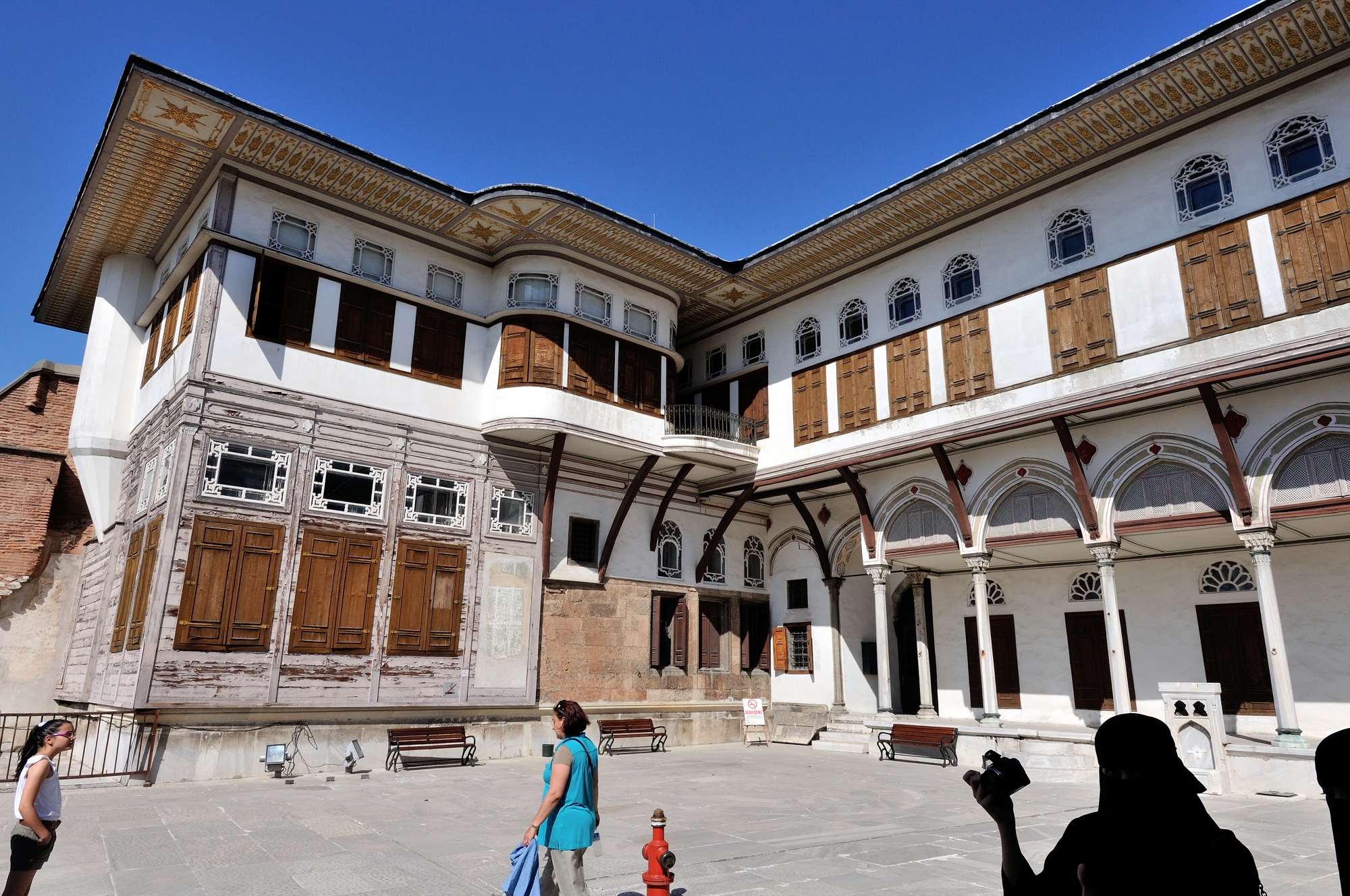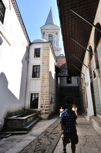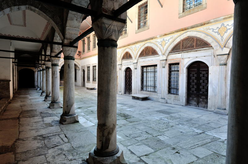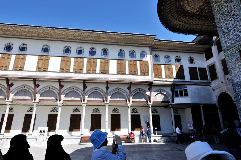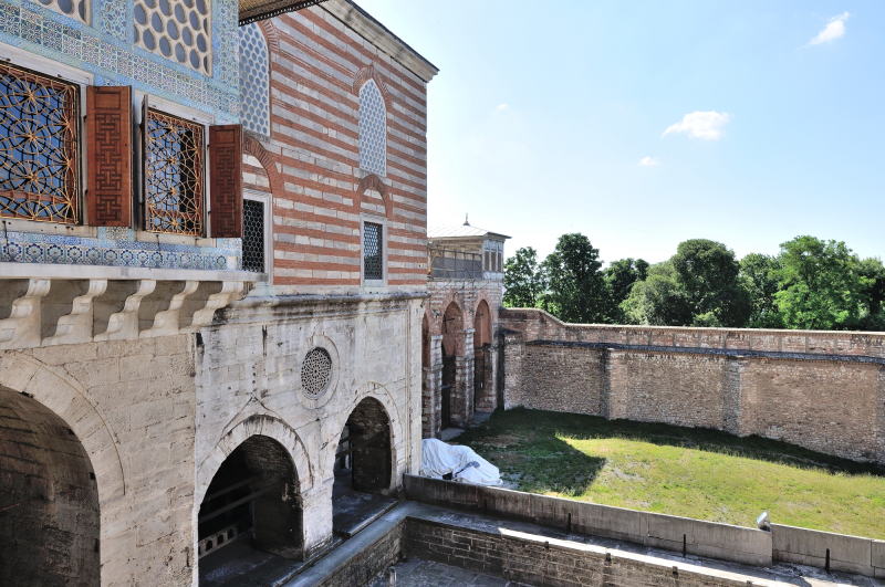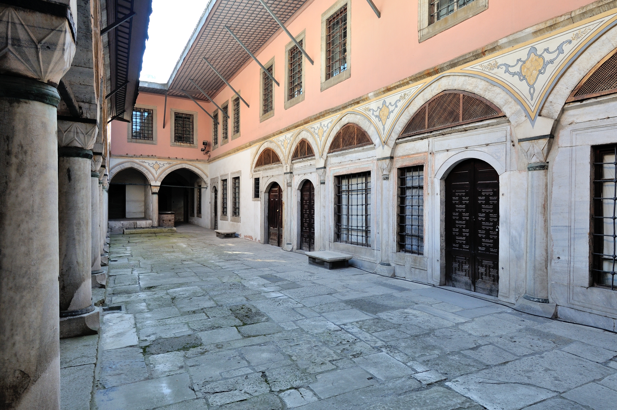 | 妾の居室と境の間の中庭 [Gözdeler Dairesi ve Mabeyn Taşlığı] 前方の建物は、"スルタンお好みの女性を住まわせた部屋" [Gözdeler Dairesi] で、その前面には "境の間の中庭" [Mabeyn Taşlığı] が広がっている。 また、この建物の中には "黄金の道" [Altın yol] と呼ばれる長い廊下があり、内廷からハレムへの、スルタンお成りの正式な道の一部になっている。 オスマン朝の支配者は、古くはビザンチンの皇女をはじめ、近隣の王侯家から正式の妻を迎えた。 しかし、バヤズィト2世 (在位:1481年 - 1512年) がカラマン君侯の息女と結婚した後は、近隣に適当な通婚相手もなくなり、この慣行は廃れた。 その後のスルタンは、殆ど専ら女奴隷とのみ交渉をもち、正妻をもうけなかった。 女奴隷をイスラム法上の正妻と認めたのは、ヒュッレムと正式に婚姻したと伝えられるスレイマン大帝のみと思われる。 「南東」MAPLay. 2 F 内廷からハレムへの、スルタンお成りの正式な道は、「境の間」 |