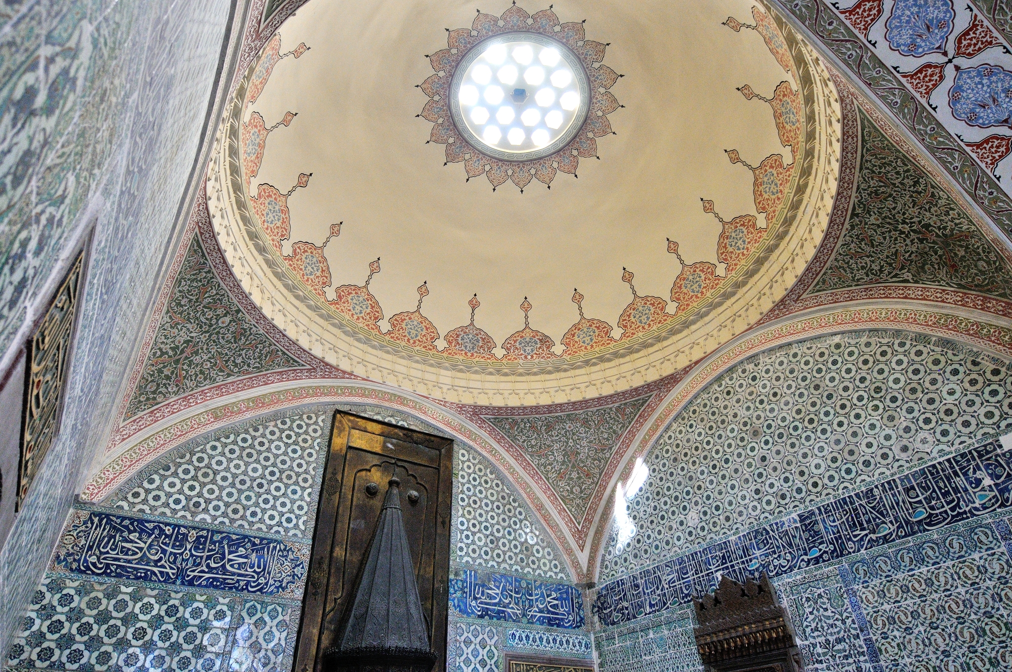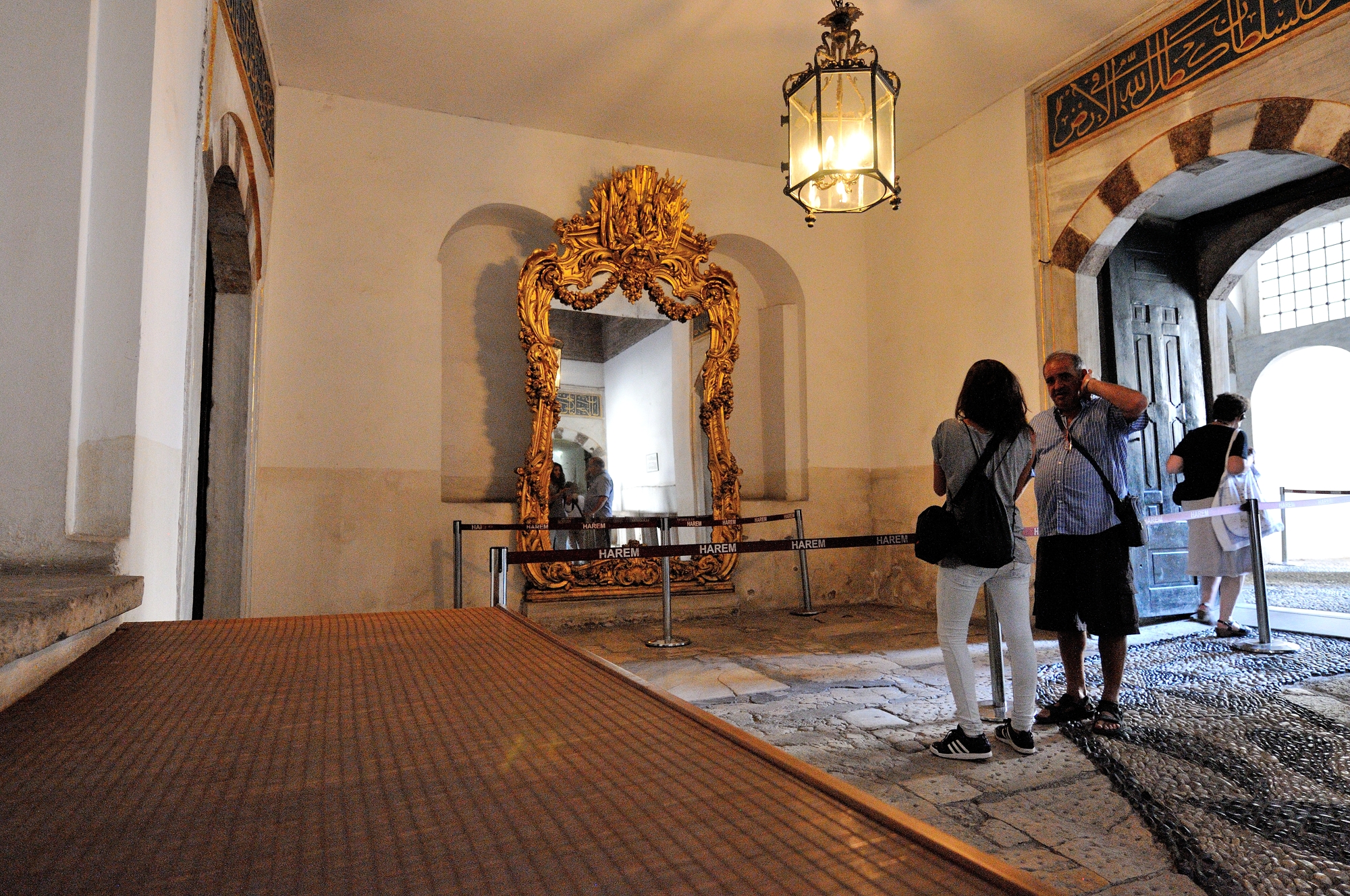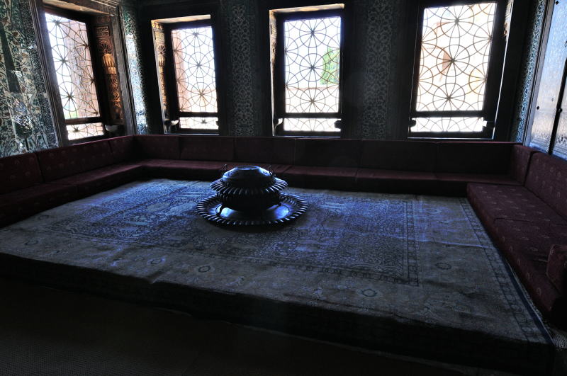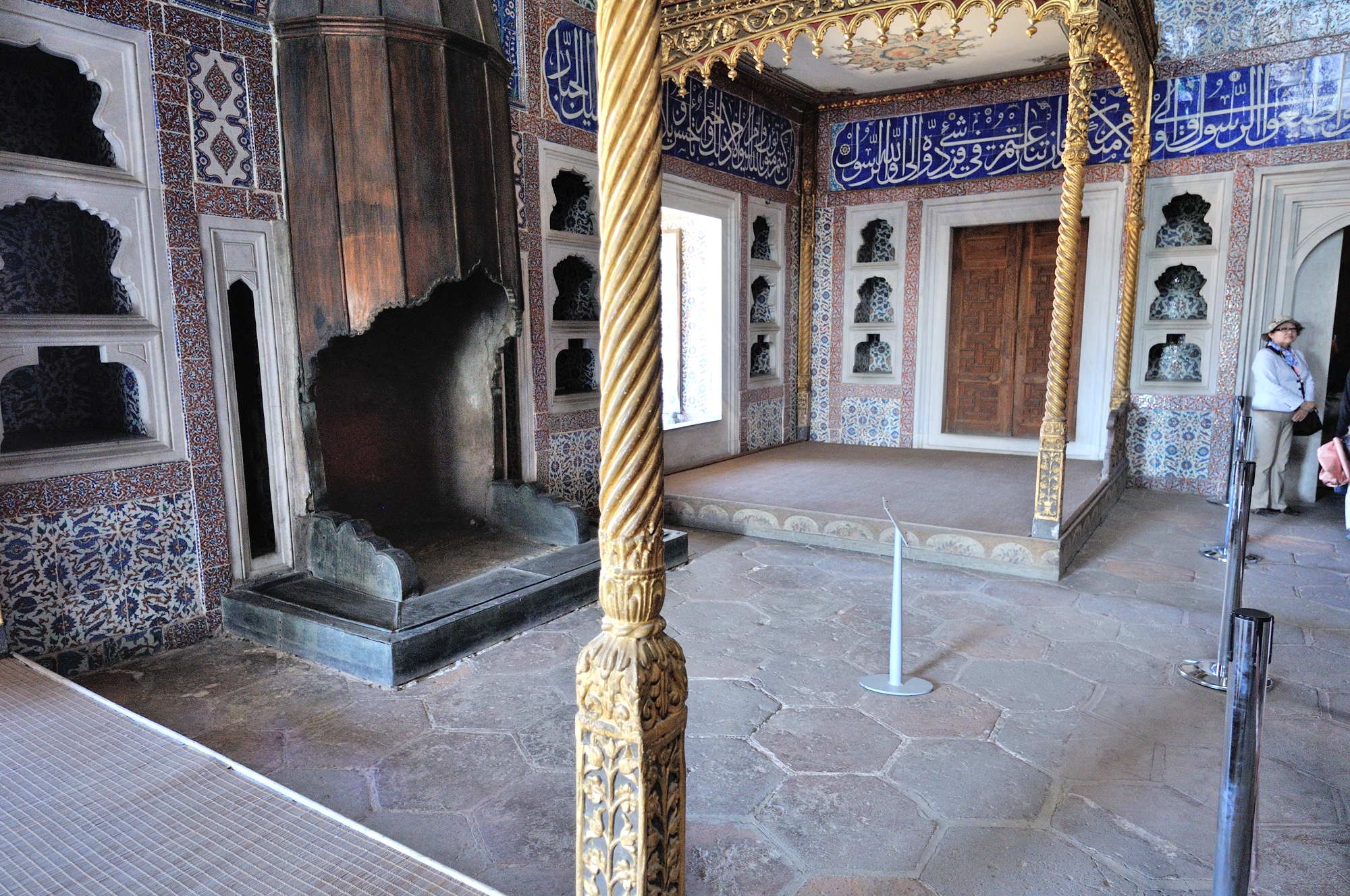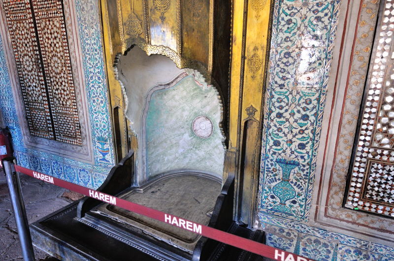 | ハレムの会議室/暖炉のある部屋 [Harem-i Hümâyûn / Hall with the Hearth] この部屋は、スルタンの寵をうけた女性や、スルタンの妹のなど、身分の高い女性達の会議室。 壁面の傘の様な設備は、暖炉の上部、右側壁の黒っぽい設備は噴水の上部。 この部屋の右手 (南東) にスルタンの寵をうけた女御 [Kadın Efendi] たちの居住区 [Kadın Efendi Daireleri] がある。 「北東」MAPLay. 2 B |