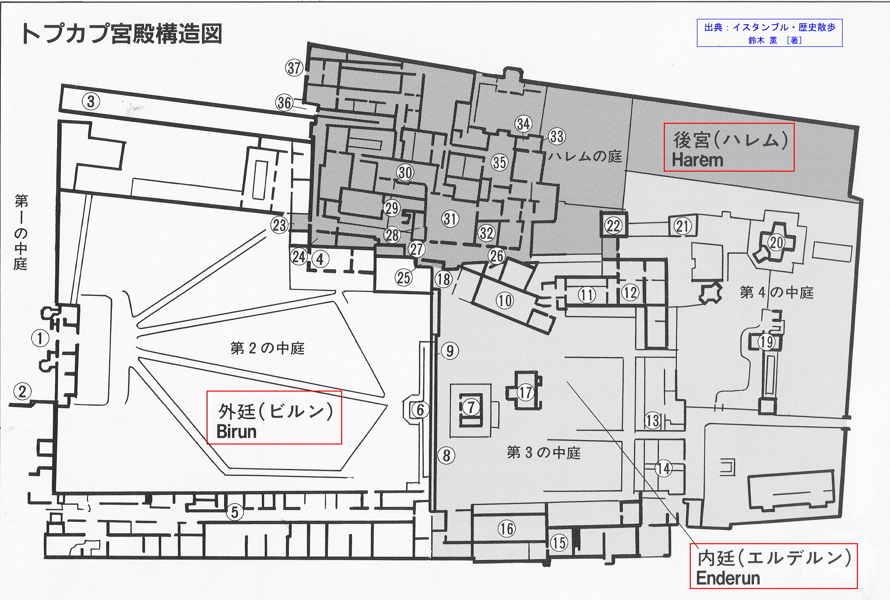 | 色分けされた3つの構成部分は、建築構造上の構成部分であると同時に、宮廷の組織の構成部分ともなっていた。 外廷は宮殿の構造的外郭であるとともに、国政の場でもあった。 これに対し、内廷と後宮は、ともにスルタンの私的生活の場であり、内廷は男性の居所であるのに対し、後宮は女性の居所であった。 |