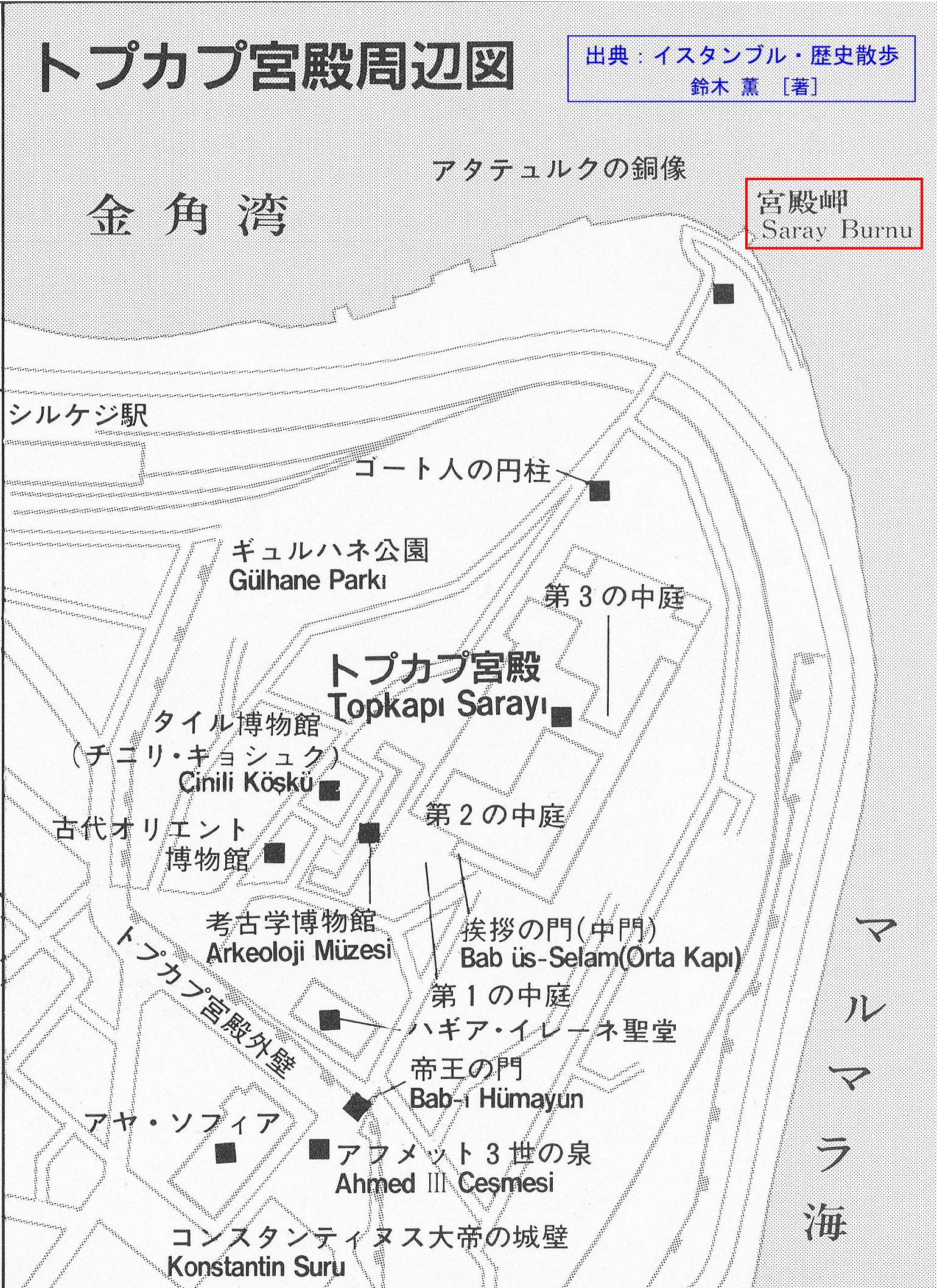 | トプカプ宮殿 [Topkapı Sarayı] 征服者メフメット2世は、1465年に、イスタンブール旧市街の東端の、マルマラ海へと突き出した小高い岬の上に位置するこの地に、新たに宮殿を造営し始め、1478年にそれが完成した。 そして彼は新しい宮殿に住居を移した。 (旧宮殿の跡地は19 世紀にはオスマン帝国陸軍省が使い、現在はイスタンブール大学となっている) 新宮殿 (イェニ・サライ) は、この時から、帝都の中心、帝国の中心となり、国政の中心となるとともに、19世紀前半まで、歴代スルタンの住居としても使われた。 この宮殿の最も広く、一般に知られた名称であるトプカプト宮殿の名は、後代になってつけられた通称で、その由来は、トプカプト宮殿のある岬の東北端、宮殿岬と呼ばれる地点近くの宮殿外壁に、海に面して設けられた一つの門にある。 この門 (カプ) [kapı] は、その前に礼砲用の大砲 (トプ) [top] が据えられていたため、「大砲の門」 の呼び名をもっていた。 18世紀中葉に、この門の近くに木造の離宮が建てられ、「大砲の門の宮殿」 と名付けられた。 この宮殿は、後に焼失したが、19世紀初頭に入り、本体である新宮殿 [Yeni Saray] の方が、トプカプ宮殿と呼ばれ始め、この呼び名が定着していった。 |