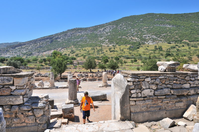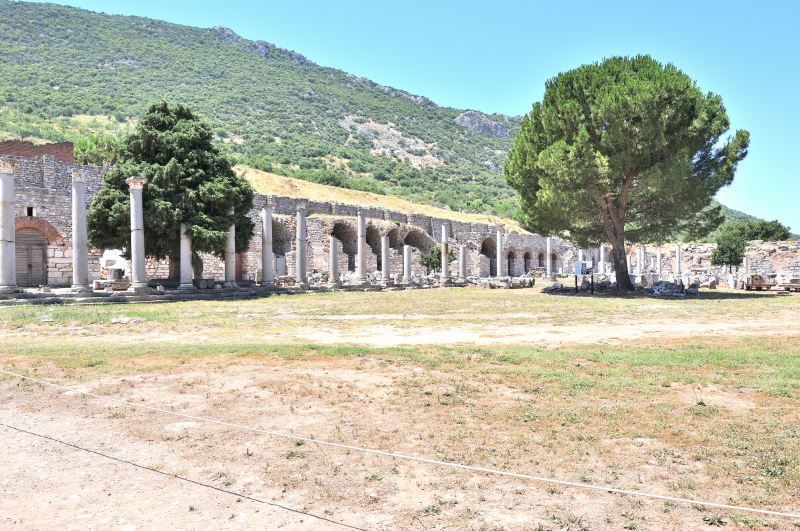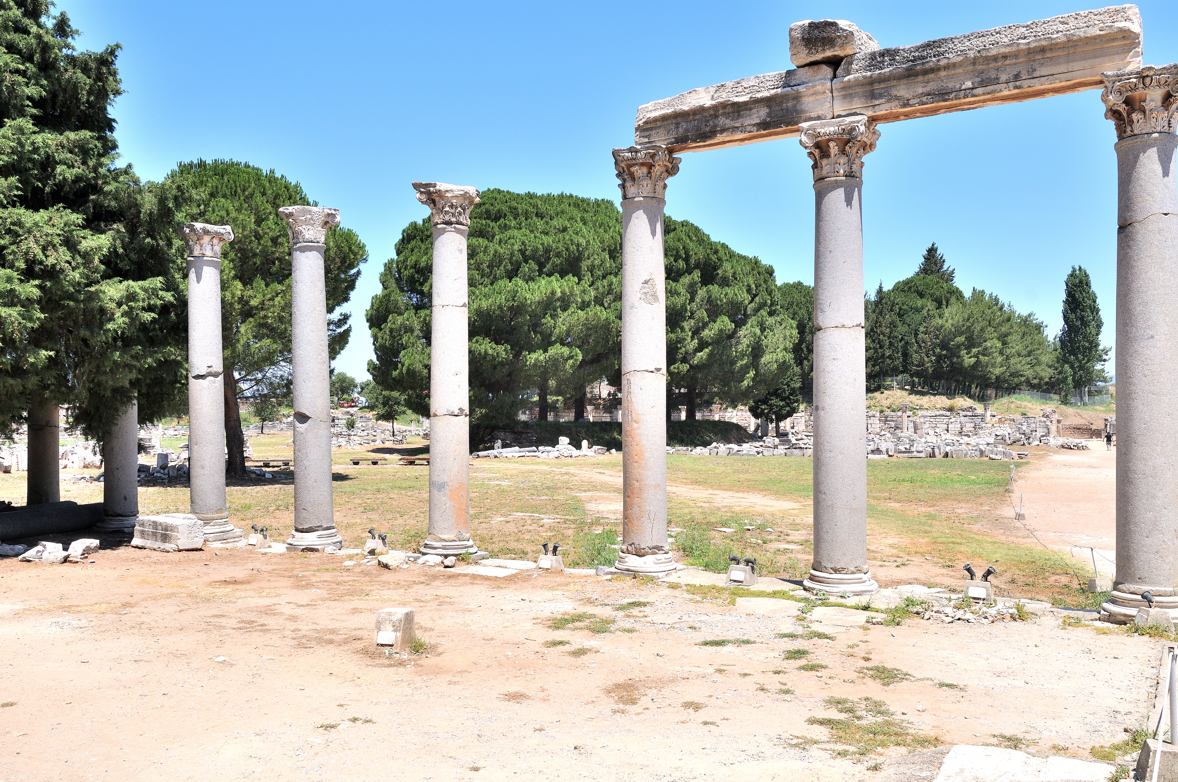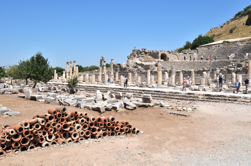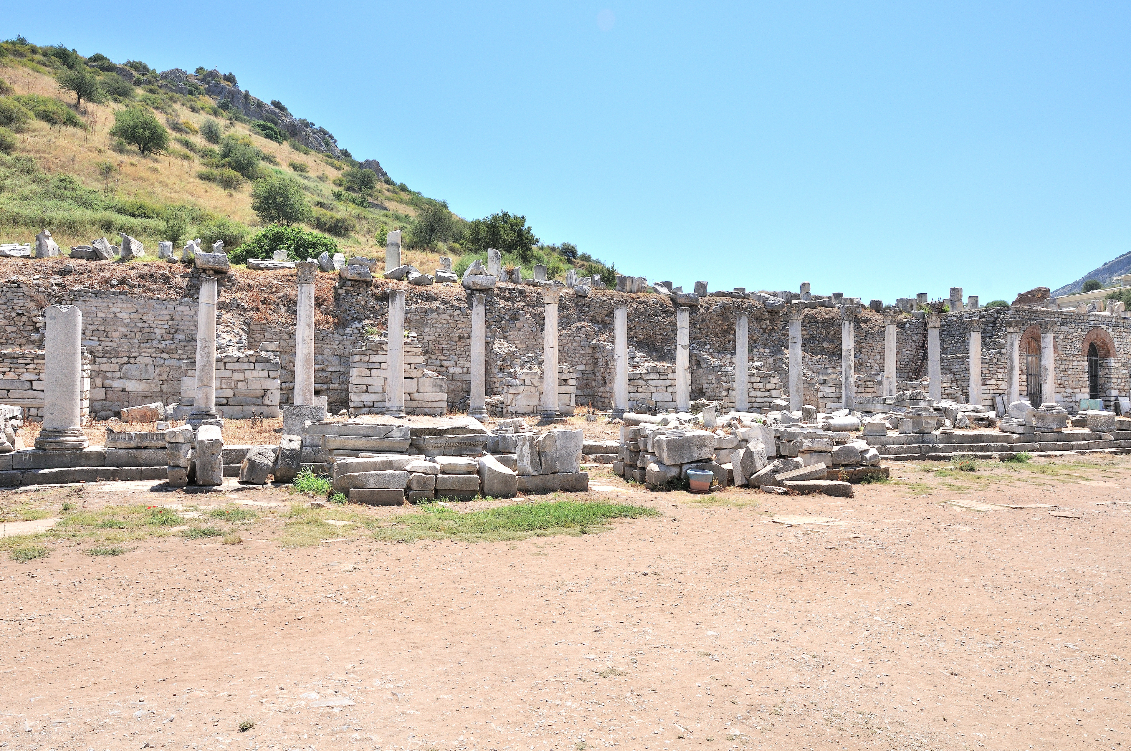 | ドミティアヌス神殿 [Domitianus Tapınağı] (11:48) この広場は、商業を中心としたアゴーラ (広場)で、この都市で一番賑やかな場所だった。 広場の奥には台地の上にローマ帝国第11代皇帝ドミティアヌスに捧げられた神殿があったが、現在は礎石以外は数本の二階建て構造の柱が残っているのみ。 生前、ドミティアヌス皇帝は独裁者で残酷であったため、彼を恐れるあまり至る所に彼の名前付けた神殿や像が造られたが、彼の死後、彼の名前が付いた建物や像などは全て破壊された。 (発掘後修復された物もある) 「南」MAPLay. 2 p |